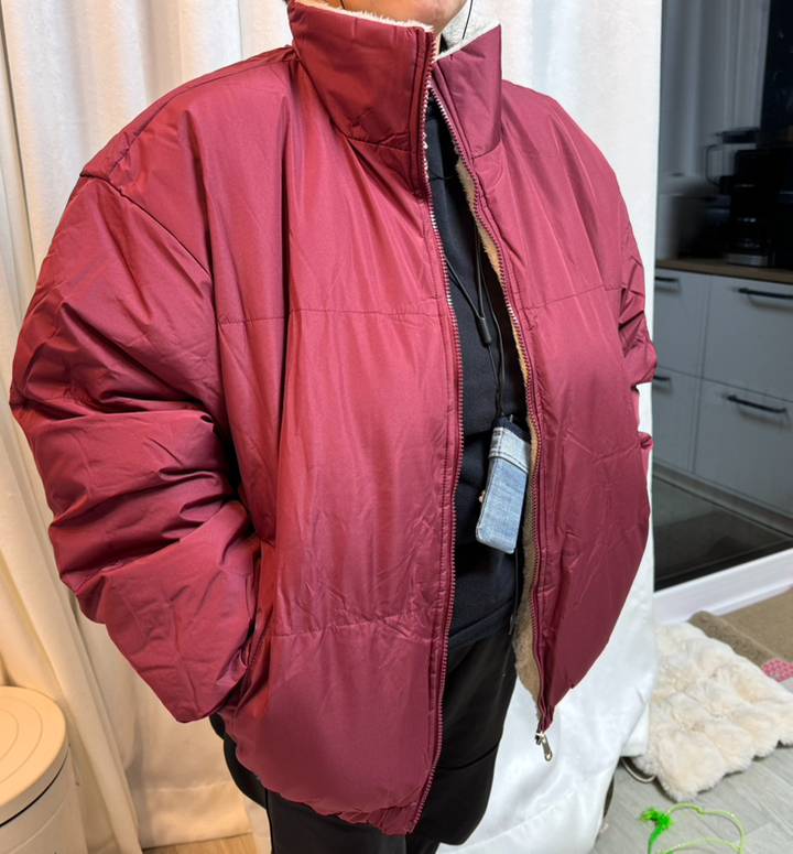 이 패딩의 가장 큰 장점은 역시 압도적인 따뜻함입니다. 안감이 부드러운 양털로 되어 있어서 입는 순간 온몸을 포근하게 감싸주는 듯한 느낌을 받았습니다. 숏 잠바임에도 불구하고 든든한 보온성 덕분에 한겨울에도 추위 걱정 없이 활동할 수 있었습니다. 특히 목을 충분히 감싸주는 하이넥 디자인은 찬 바람이 스며들 틈 없이 목을 따뜻하게 보호해 주어 좋았습니다. 덕분에 별도의 목도리가 없어도 따뜻함을 유지할 수 있었습니다.