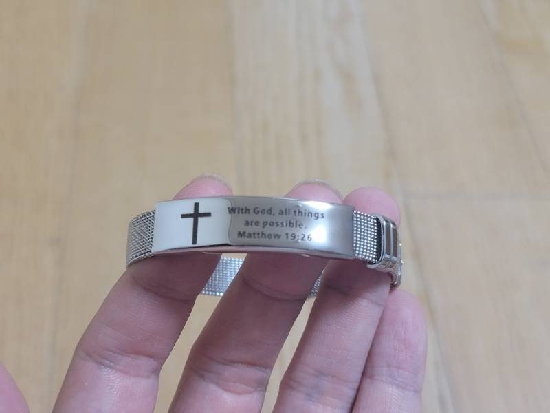 손목에 포인트를 줄수 있는 팔찌를 찾고 있다가 구매를했어요~ 제품 디자인도 심플한데 제품의 퀄리티도 좋아서 저는 개인적으로 만족 하면서 사용하고 있어요!! 착용감도 편학고~ 스테인리스 소재라서 색변할 걱정도없고 잔기스 에도 강하고 다지인디 깔끔햇서 어떠한 옷을입어도 잘어울려서 만족합니다!! 저는 종교가 없지만 성경로고라서 조금 고민했는데 ~ 너무나 매력적이제 각인이 되있어서 너무 좋네요! 선물용으로 좋은 제품 입니다!!!