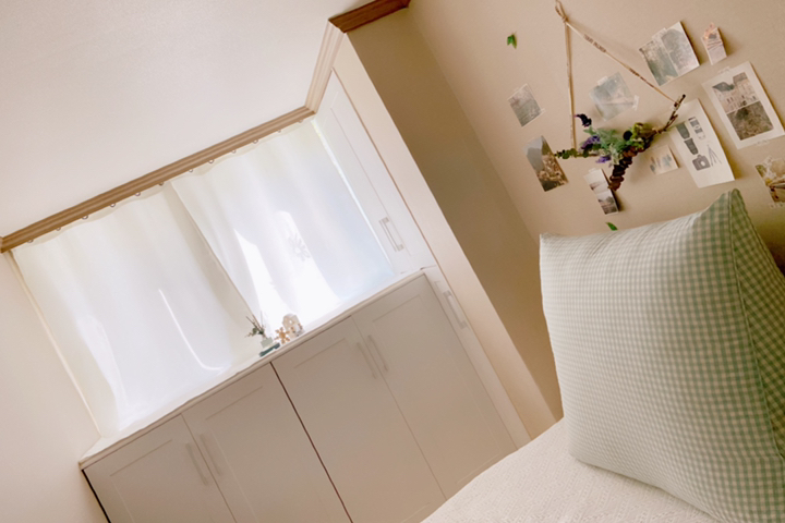 커튼은 어둡고 짙은 색이 차분한 느낌때문에 숙면에 도움이 될것 같다고 생각했고 암막률도 높지 않을까 추측해서 파랑 계열을 선택했습니다.
