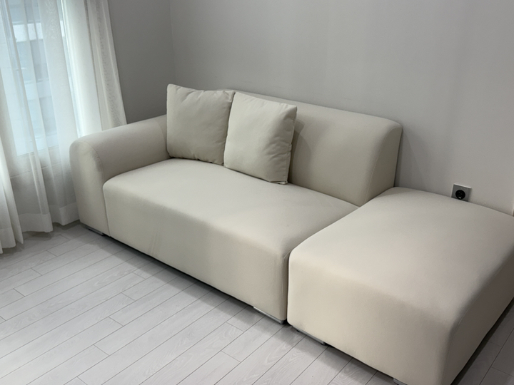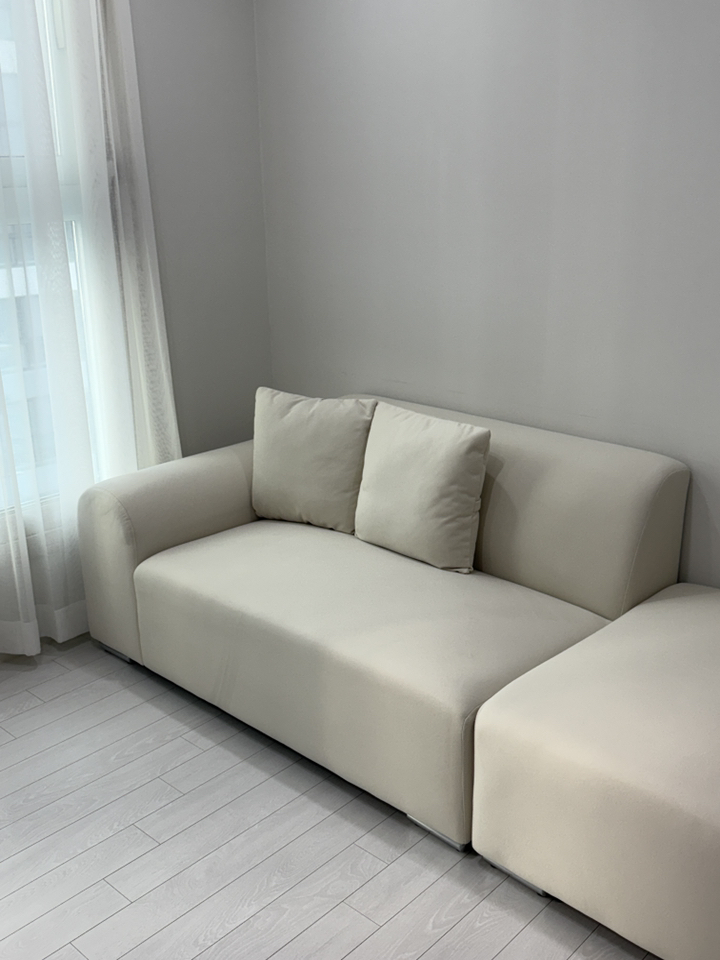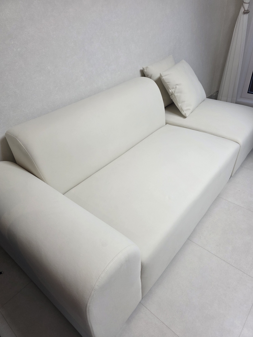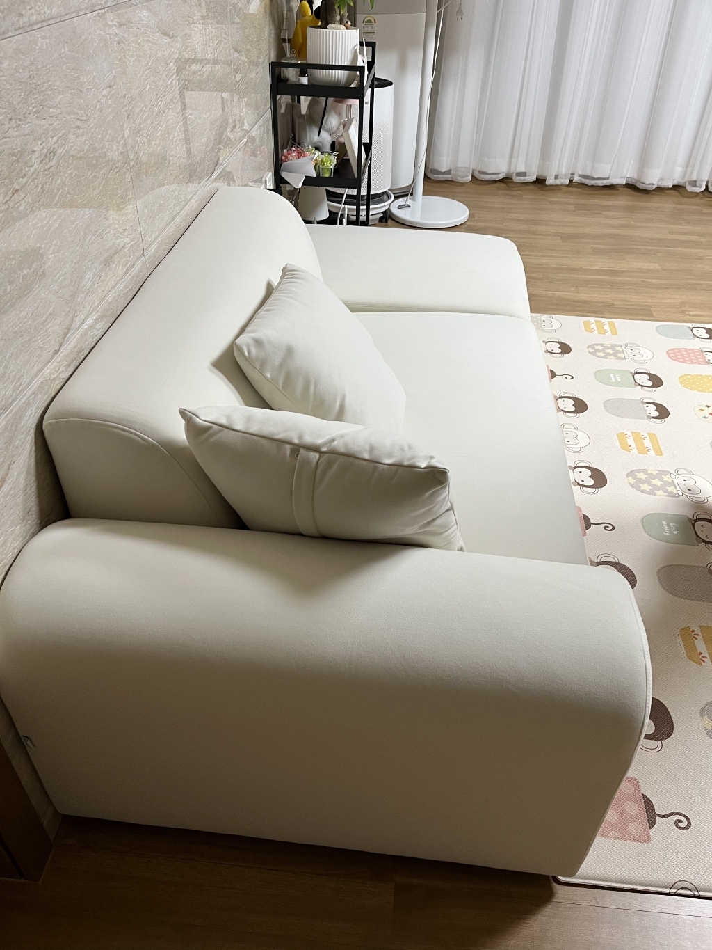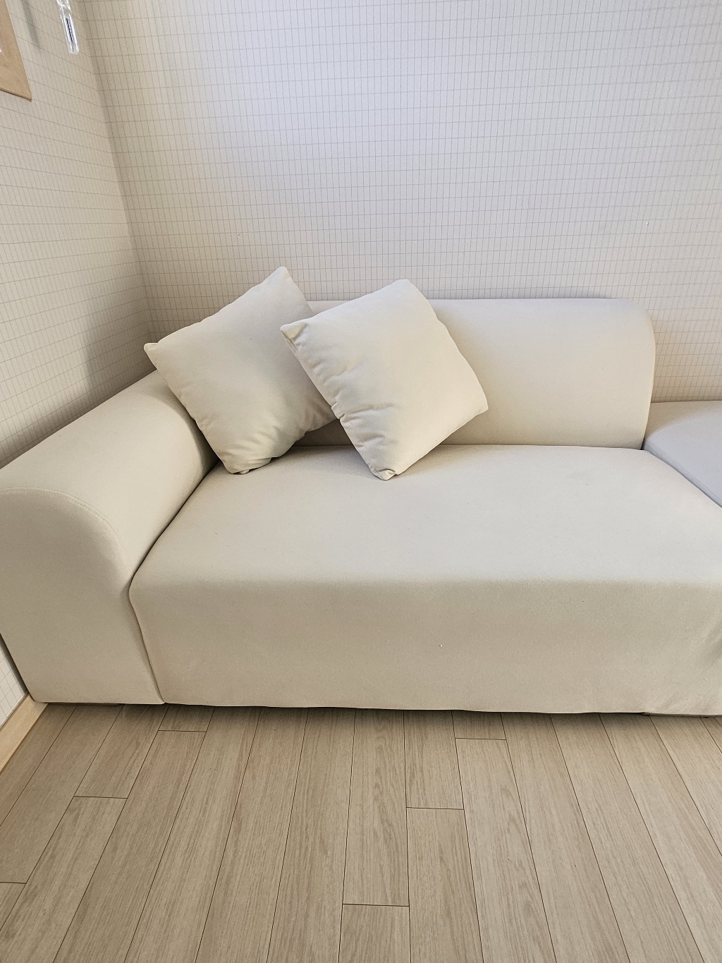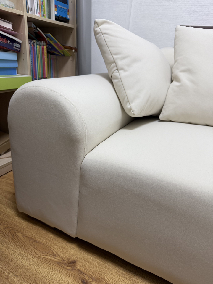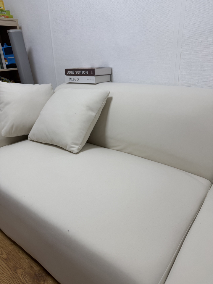패브릭은 부들부들하고 촉감이 좋은 대신 오염이 조금 걱정되긴 했지만, 색감이 은은하고 고급스럽게 빠져 있어서 실제로 거실에 놓으면 굉장히 예뻐요. 공간을 환하게 밝혀주고, 인테리어 분위기를 깔끔하고 따뜻하게 만들어줘요. 사진보다 실물이 훨씬 예쁜 스타일입니다.