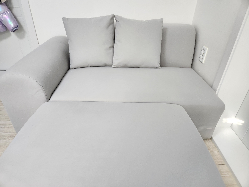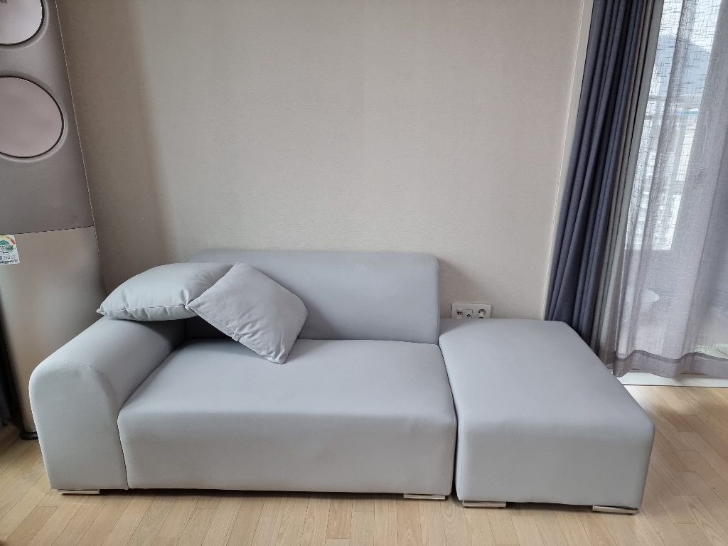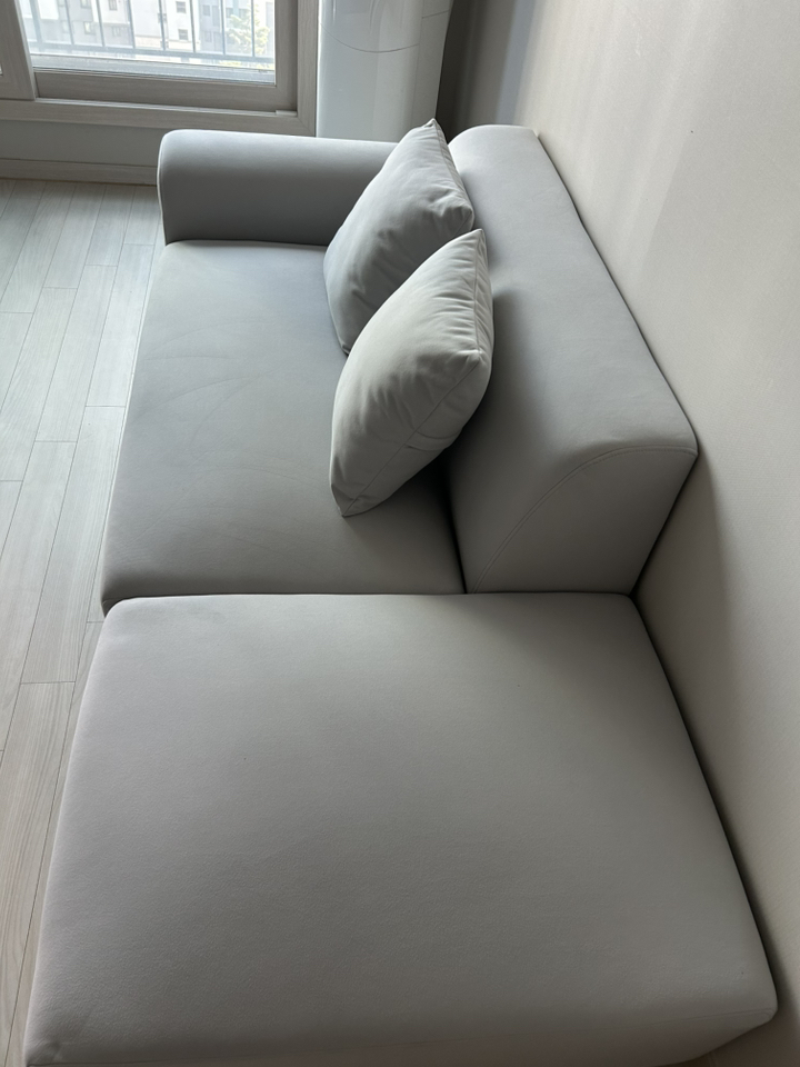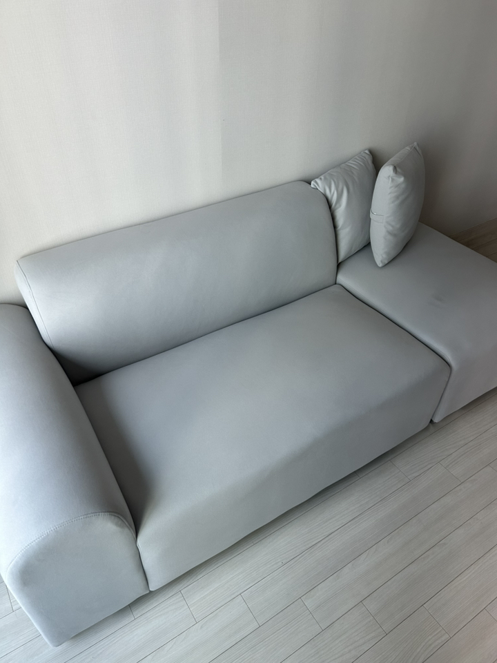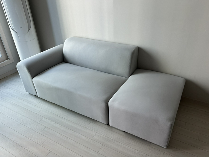 스툴 포함이라 활용도가 정말 높아요. 평소에는 다리 올리고 쓰다가, 손님 오면 분리해서 보조 의자처럼 사용하고 있어요. 공간이 넓지 않은 집인데도 2인용 사이즈라 동선 방해 없이 배치하기 좋고, 소파 모서리도 둥글게 마감돼 있어서 아이 있는 집에서도 안전해 보여요.