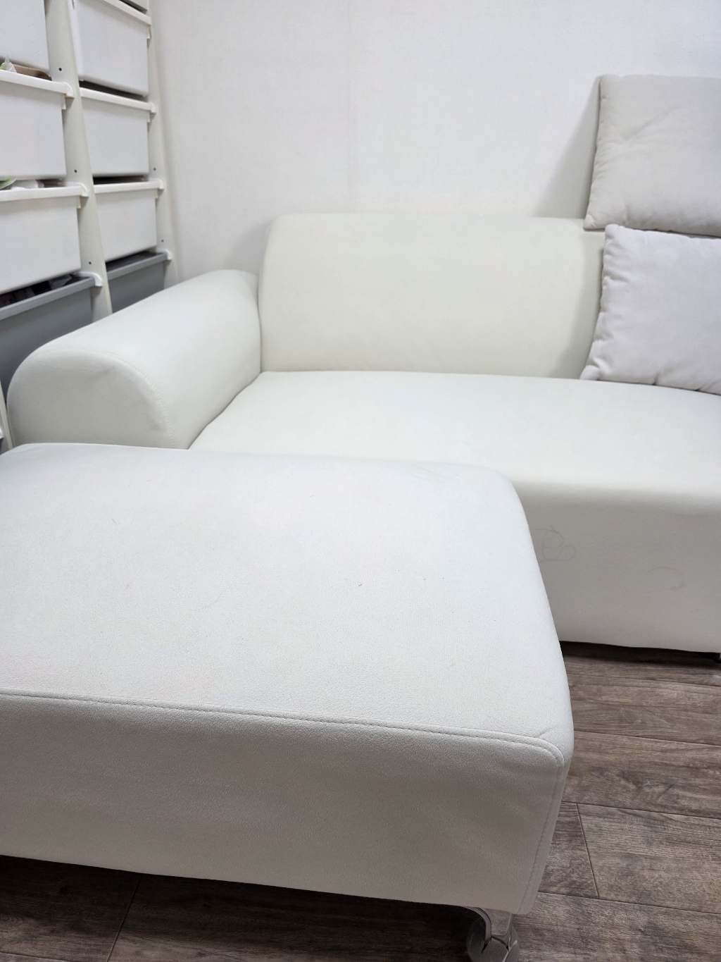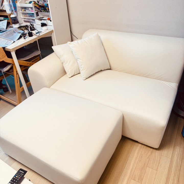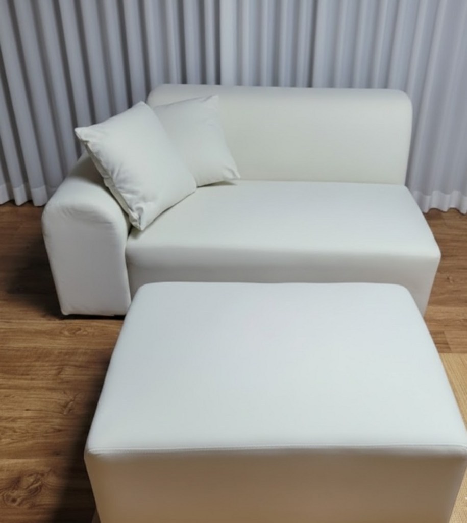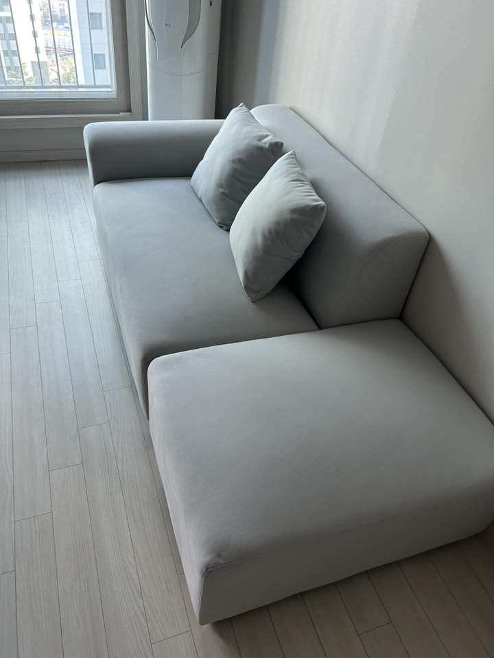 스툴 포함이라 활용도가 정말 높아요. 평소에는 다리 올리고 쓰다가, 손님 오면 분리해서 보조 의자처럼 사용하고 있어요. 공간이 넓지 않은 집인데도 2인용 사이즈라 동선 방해 없이 배치하기 좋고, 소파 모서리도 둥글게 마감돼 있어서 아이 있는 집에서도 안전해 보여요.