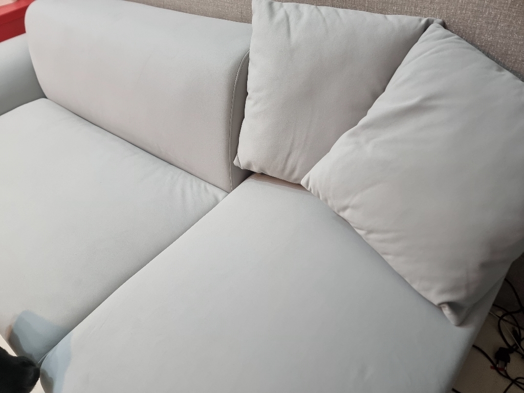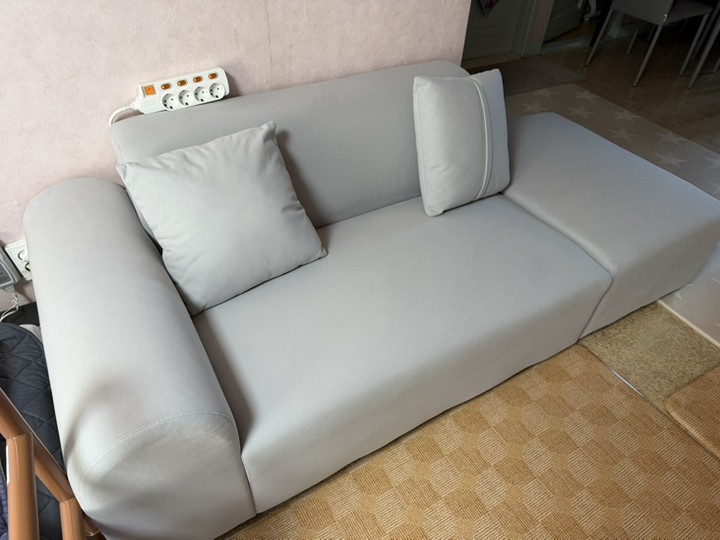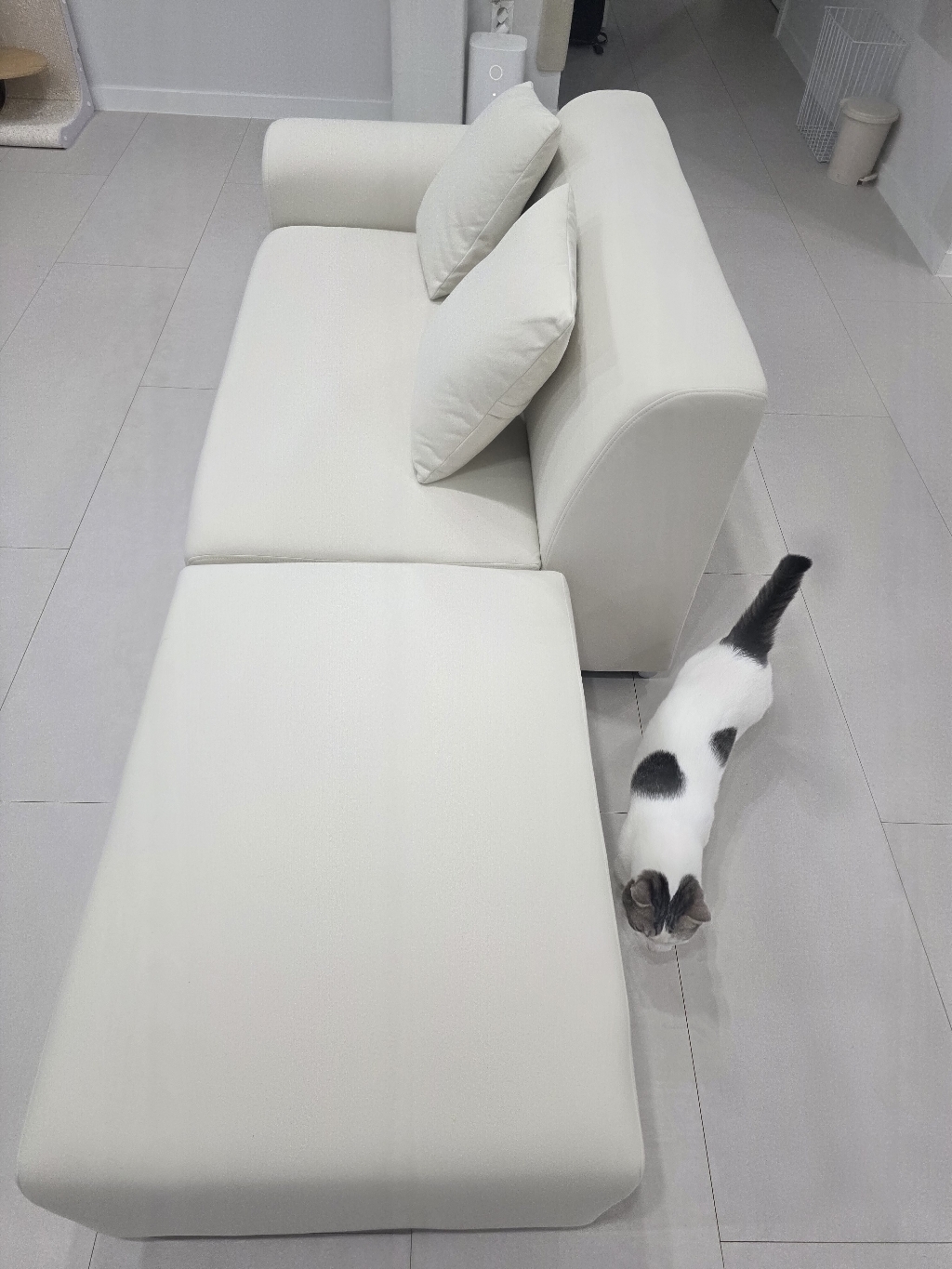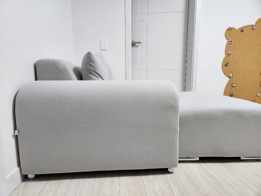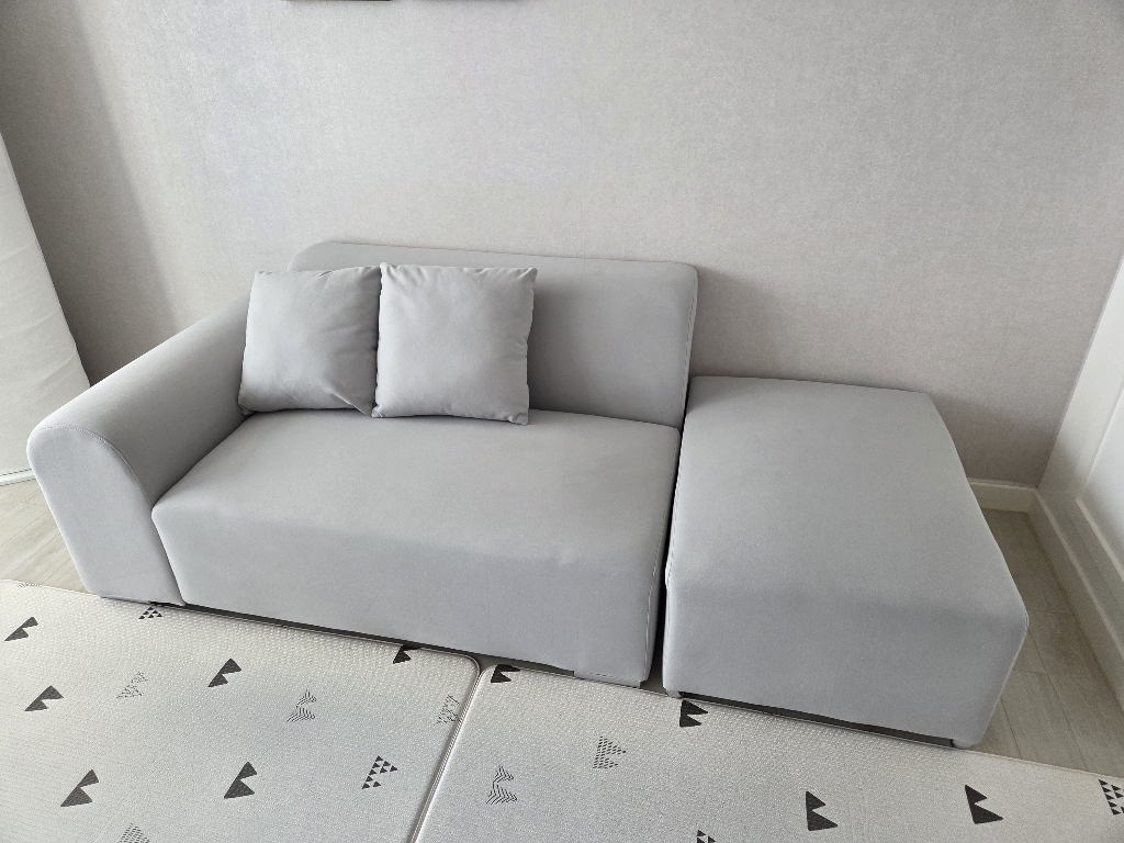 그리고 설치 후 관리면에서도 만족스러웠어요. 패브릭은 가죽에 비해 부담스럽다는 인식이 있었는데, 사용해보니 먼지나 털 등이 크게 눌러붙거나 눈에 띄게 쌓이지 않더라고요. 물론 잡지 않거나 바로 청소하지 않으면 흠집이 생기거나 얼룩이 생길 수도 있지만, 일상적으로 앉고 쉬는 데는 충분히 괜찮았어요. 스툴이나 쿠션을 적절히 배치하면 “소파 + 스툴” 구성이라 이동이나 재배치도 비교적 수월하고, 소파 하나로 두 가지 분위기를 연출할 수 있다는 점이 좋았습니다.
