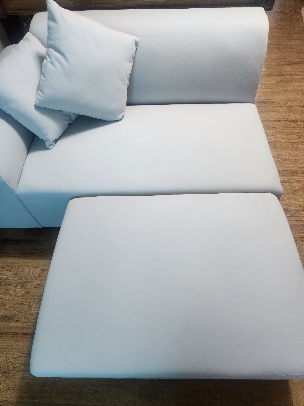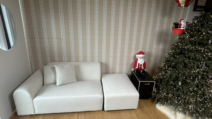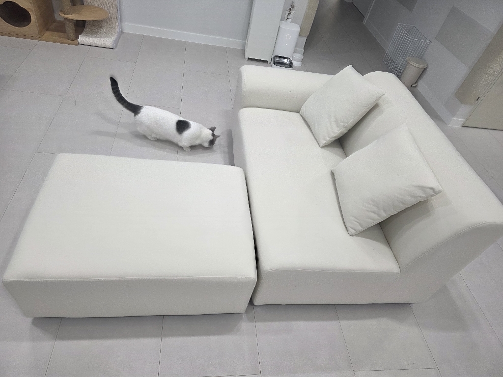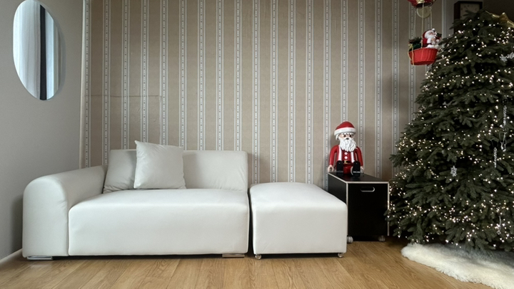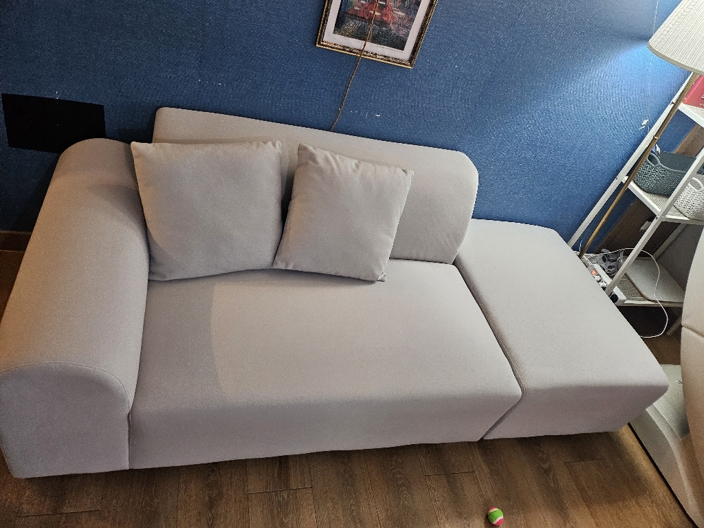 그리고 설치 후 관리면에서도 만족스러웠어요. 패브릭은 가죽에 비해 부담스럽다는 인식이 있었는데, 사용해보니 먼지나 털 등이 크게 눌러붙거나 눈에 띄게 쌓이지 않더라고요. 물론 잡지 않거나 바로 청소하지 않으면 흠집이 생기거나 얼룩이 생길 수도 있지만, 일상적으로 앉고 쉬는 데는 충분히 괜찮았어요. 스툴이나 쿠션을 적절히 배치하면 “소파 + 스툴” 구성이라 이동이나 재배치도 비교적 수월하고, 소파 하나로 두 가지 분위기를 연출할 수 있다는 점이 좋았습니다.