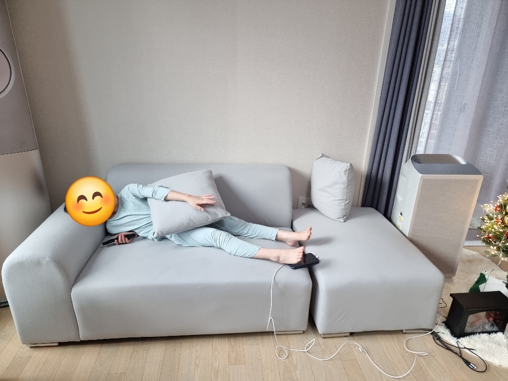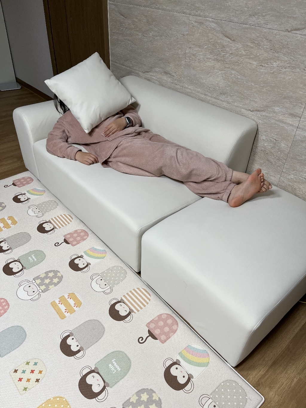 특히 좋은 건 눕기 정말 좋다는 점이에요. 스툴과 이어서 일자로 만들면 성인 남자도 충분히 쭉 뻗고 누울 수 있을 정도로 넉넉해요. TV 볼 때, 낮잠 잘 때 완전 편안해서 소파 생활의 만족도가 확 올라갔어요.