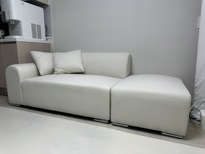 쿠션감은 너무 푹신하지도, 딱딱하지도 않은 중간 정도라 장시간 앉아 있어도 허리가 편하다고 하셨어요. 등받이 각도도 적당해서 몸이 자연스럽게 기대지더라고요. 스툴이 포함되어 있어서 다리를 올려두면 편히 쉴 수 있고, 때로는 간단한 탁자처럼 활용할 수도 있어서 실용적이에요. 좌우형 선택이 가능한 구조라 공간에 맞게 배치하기에도 좋았습니다.