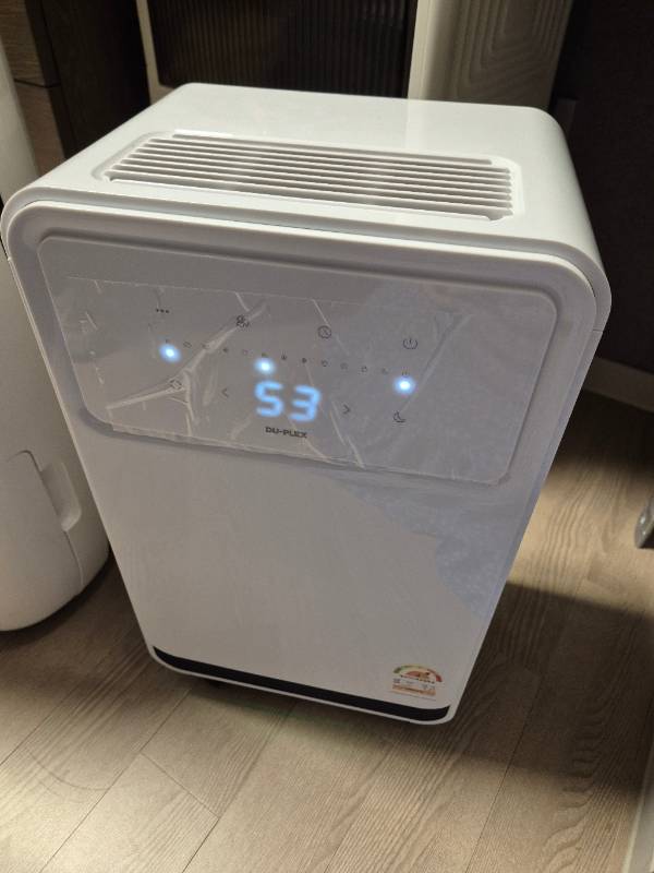 드레스룸 습도가 60%일때도 있고 50%일때도 있고 오락가락인데 듀플렉스 제습기를 작동시켜보면 길지않은 시간에 설정해놓은 습도만큼 금방 내려가더라구요!