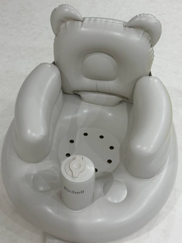 무엇보다 이 제품은 바람 넣는 타입이라 무게가 정말 가볍고 이동이 쉬워서 집안 여기저기 옮겨가며 사용하기 좋습니다. 특히 아기가 아직 완전히 혼자 앉지는 못하지만 등과 옆구리를 잘 잡아주는 구조라서 잠깐 앉혀놓고 장난감 잡기 연습하거나 이유식 먹이기 전에 안정되는 시간으로 활용하기 좋아요. 가운데 있는 발 받침(?) 같은 고정봉 덕분에 앞으로 쏠리는 걸 막아주어서 안전감이 있습니다.