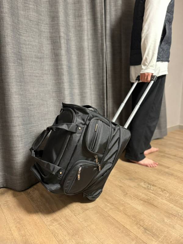 처음 이 가방을 받아보고 가장 먼저 든 생각은 “생각보다 탄탄하다!”였어요. 사진으로만 봤을 때는 혹시나 천이 얇고 흐물거리지 않을까 걱정했는데, 실제로 받아보니 원단이 두껍고 마감도 깔끔해서 내구성이 꽤 좋아 보였습니다. 바닥 부분이 단단하게 받쳐져 있어서 무거운 짐을 넣어도 형태가 잘 유지되고, 캐리어형 바퀴도 부드럽게 잘 굴러가서 이동 시 편리했어요.