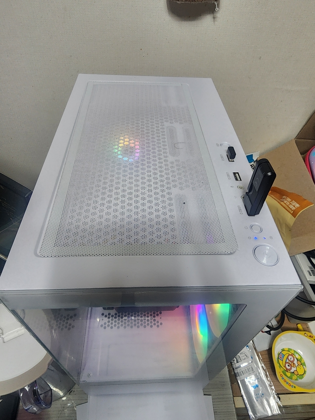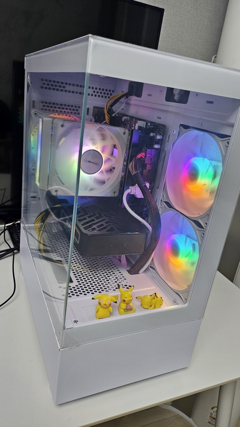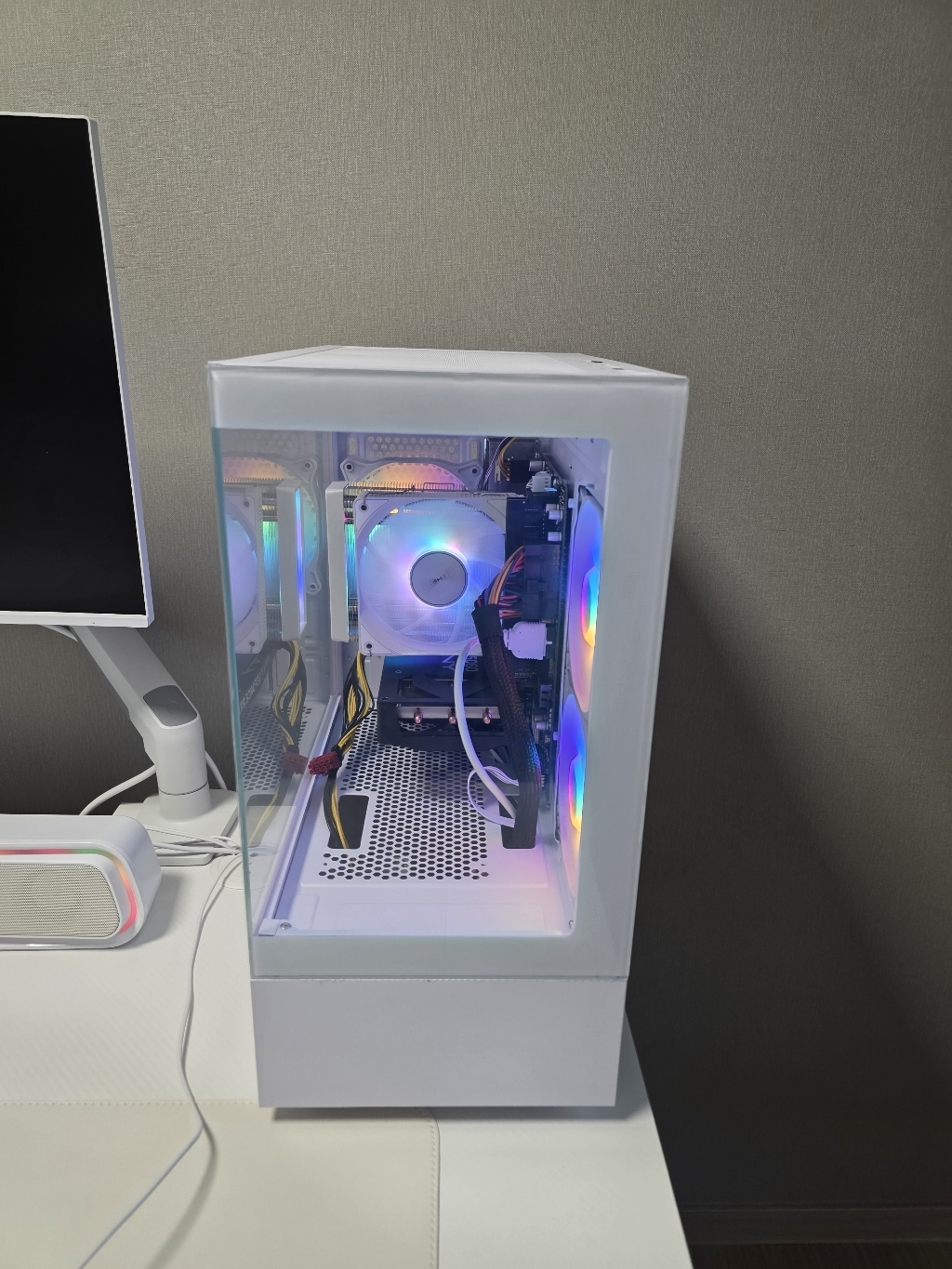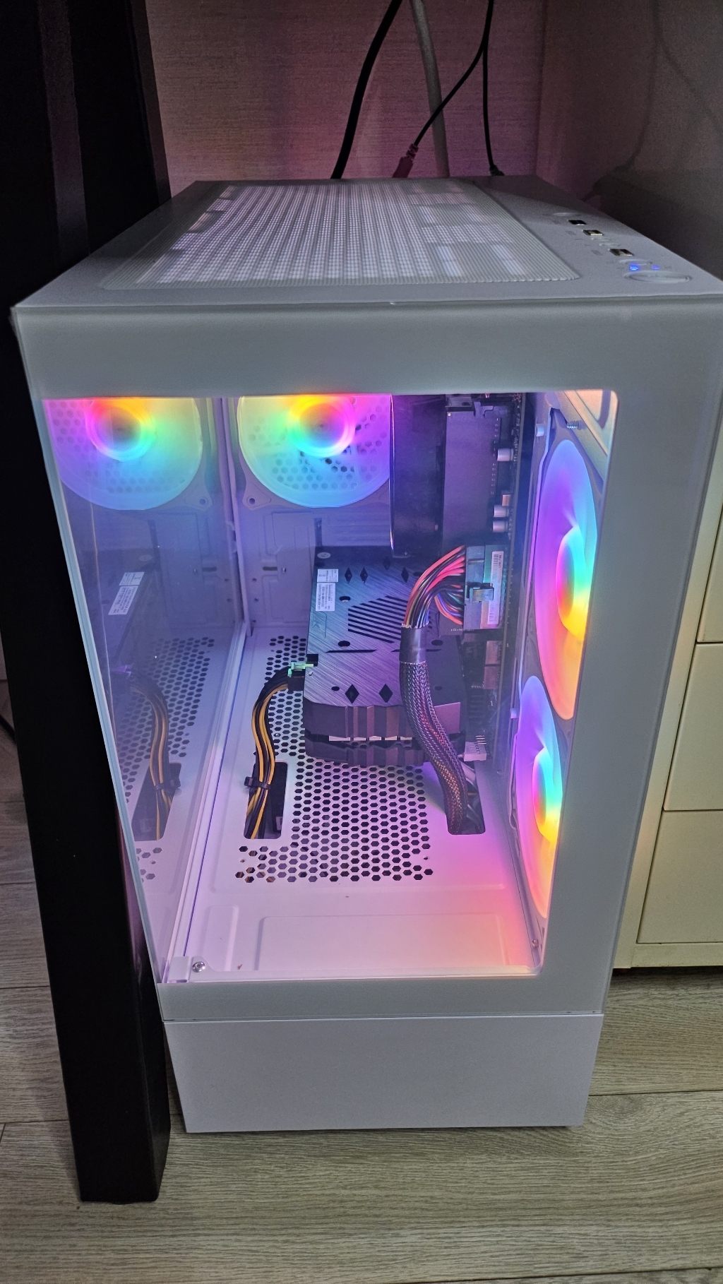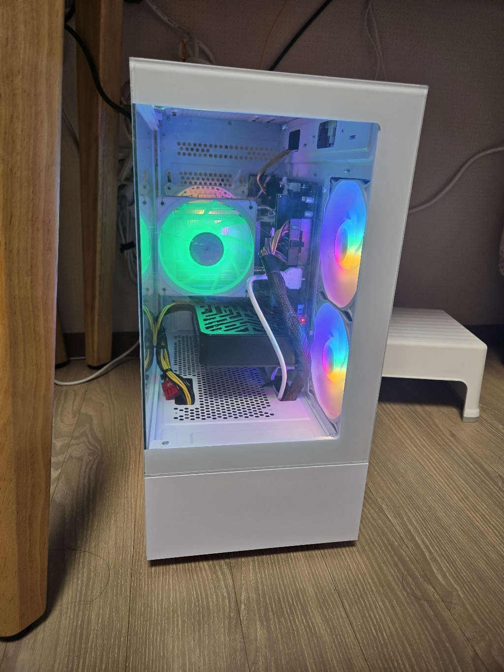 화이트 컬러에 측면 강화유리 + 전면 메쉬 구조라서 깔끔하면서도 내부 RGB가 은은하게 잘 보입니다. 과하지 않은 RGB라서 튜닝 PC 느낌보다는 감성 데스크 셋업에 잘 어울립니다. 책상 옆에 두어도 부담 없고, 전체적인 마감도 가격 대비 꽤 괜찮은 편입니다.