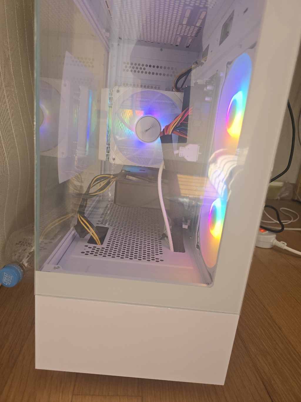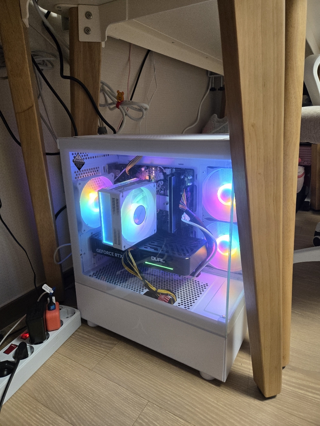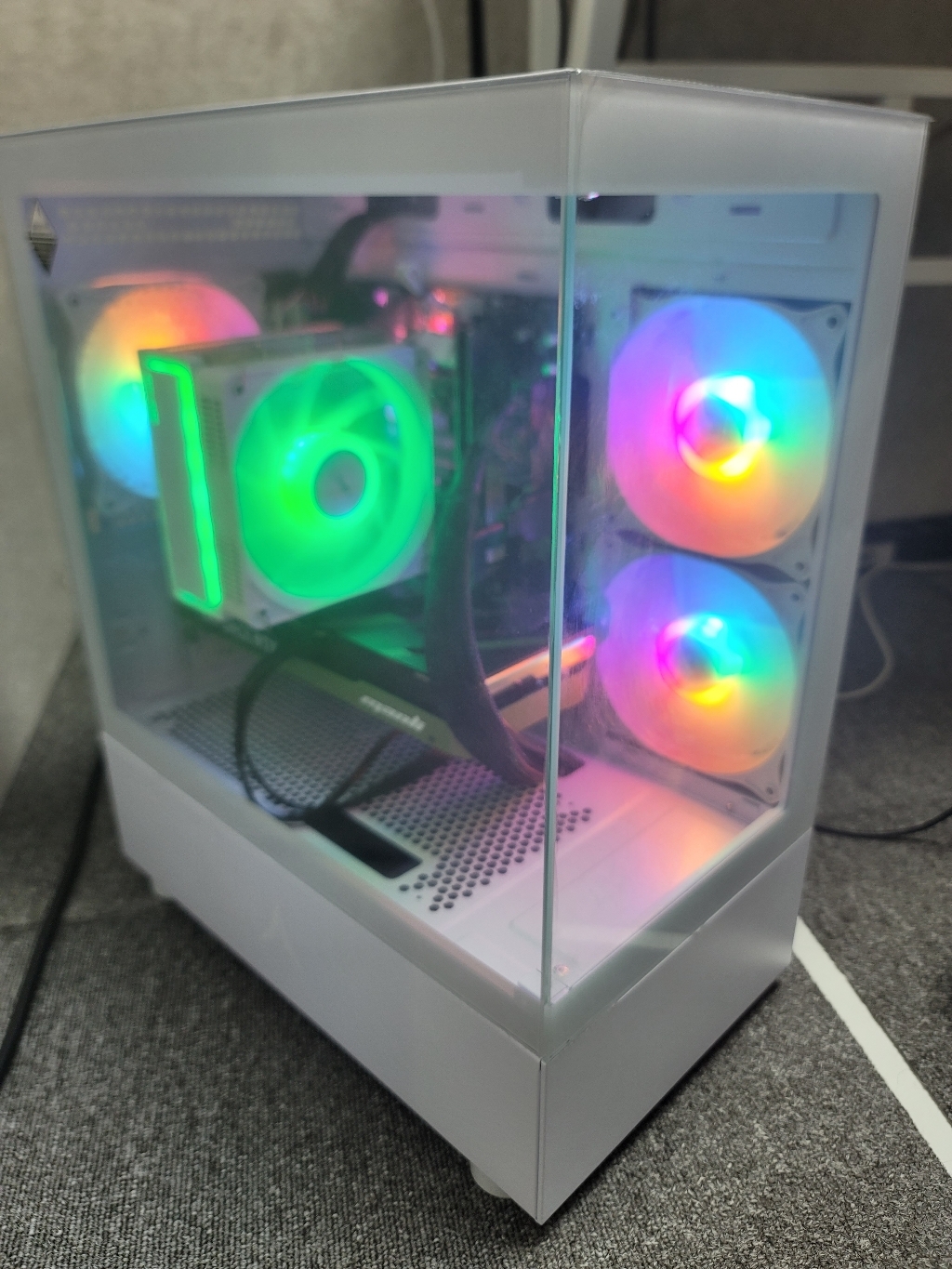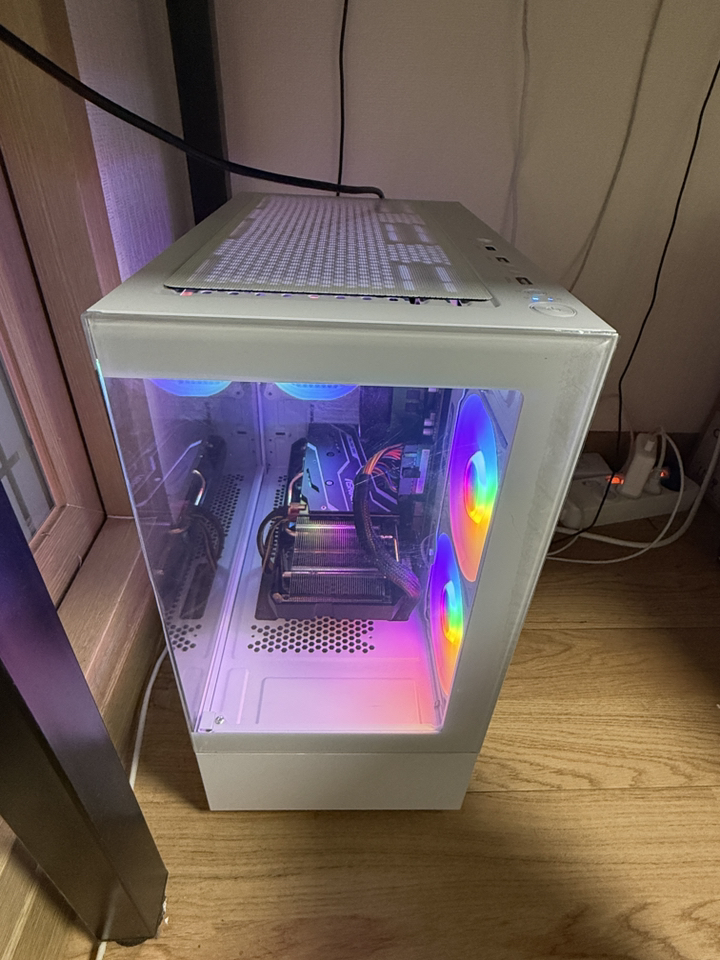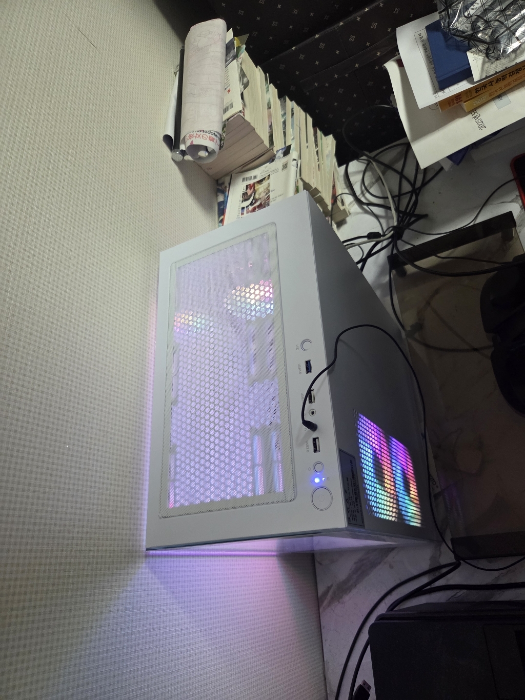 화이트 컬러에 측면 강화유리 + 전면 메쉬 구조라서 깔끔하면서도 내부 RGB가 은은하게 잘 보입니다. 과하지 않은 RGB라서 튜닝 PC 느낌보다는 감성 데스크 셋업에 잘 어울립니다. 책상 옆에 두어도 부담 없고, 전체적인 마감도 가격 대비 꽤 괜찮은 편입니다.