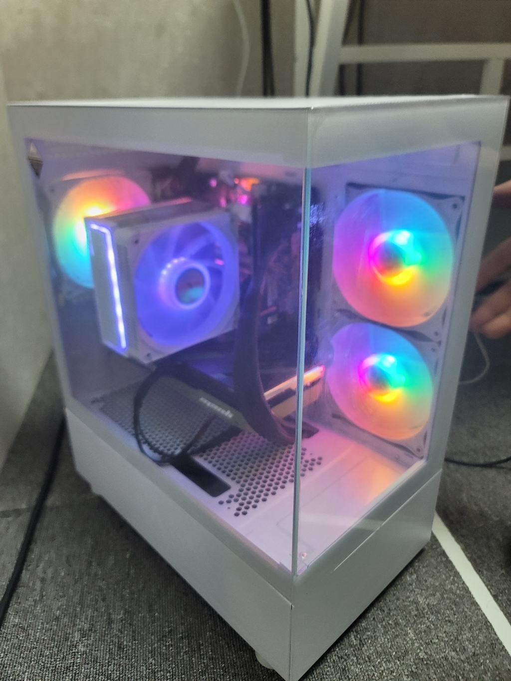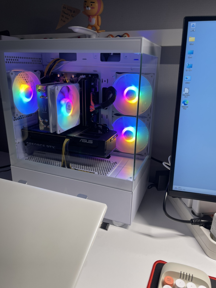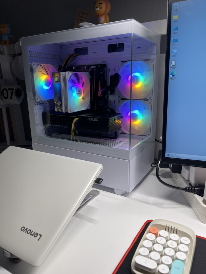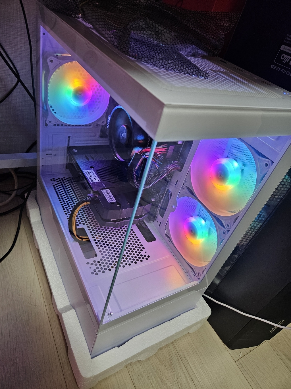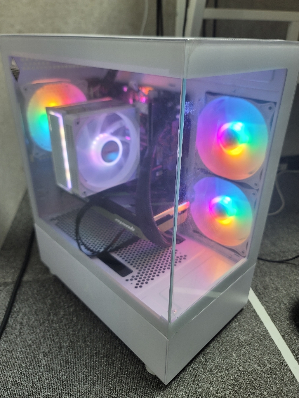 화이트 컬러에 측면 강화유리 + 전면 메쉬 구조라서 깔끔하면서도 내부 RGB가 은은하게 잘 보입니다. 과하지 않은 RGB라서 튜닝 PC 느낌보다는 감성 데스크 셋업에 잘 어울립니다. 책상 옆에 두어도 부담 없고, 전체적인 마감도 가격 대비 꽤 괜찮은 편입니다.