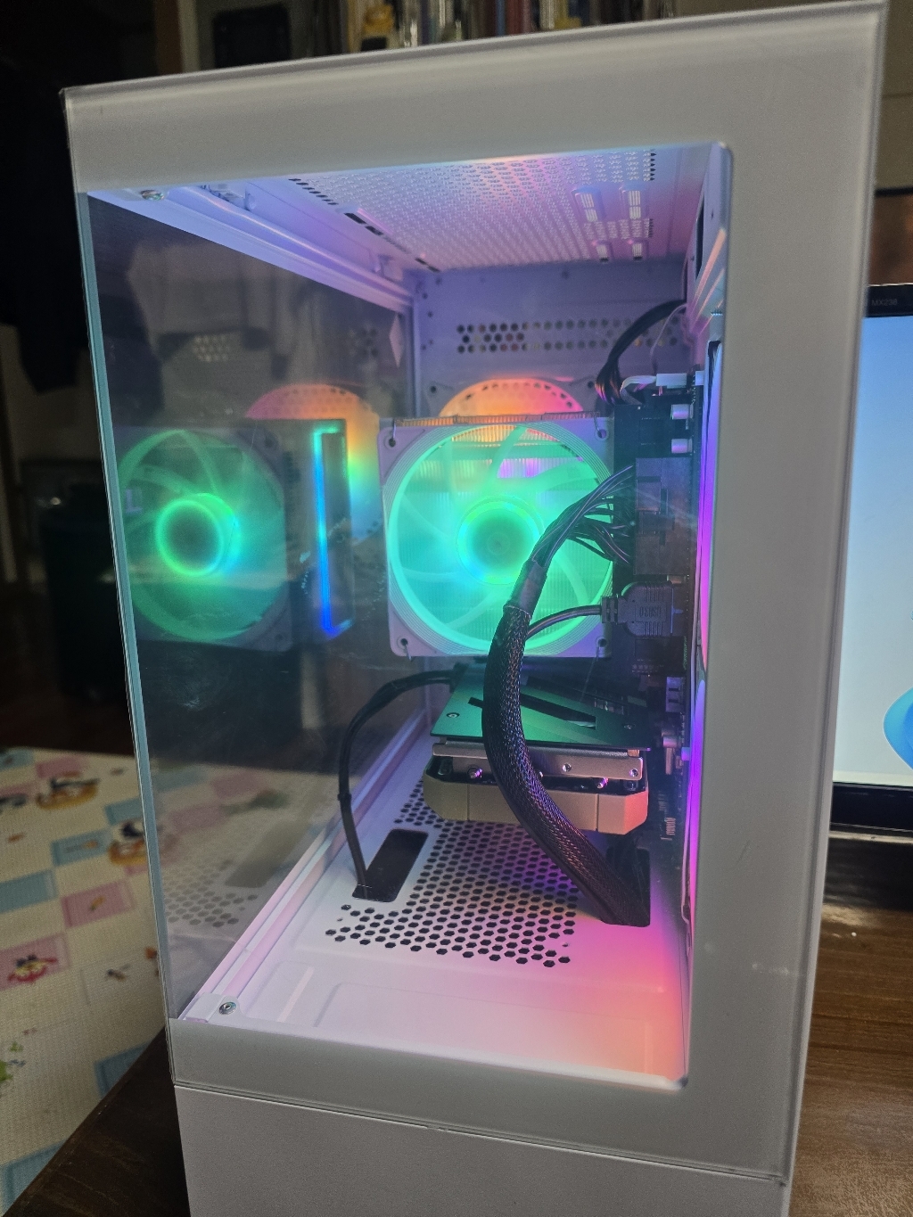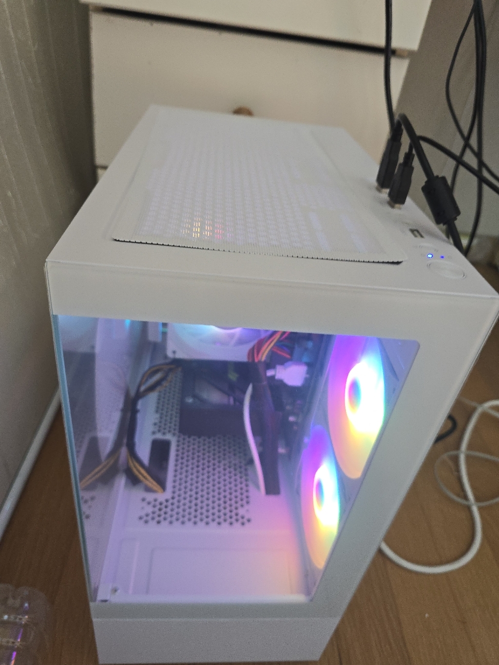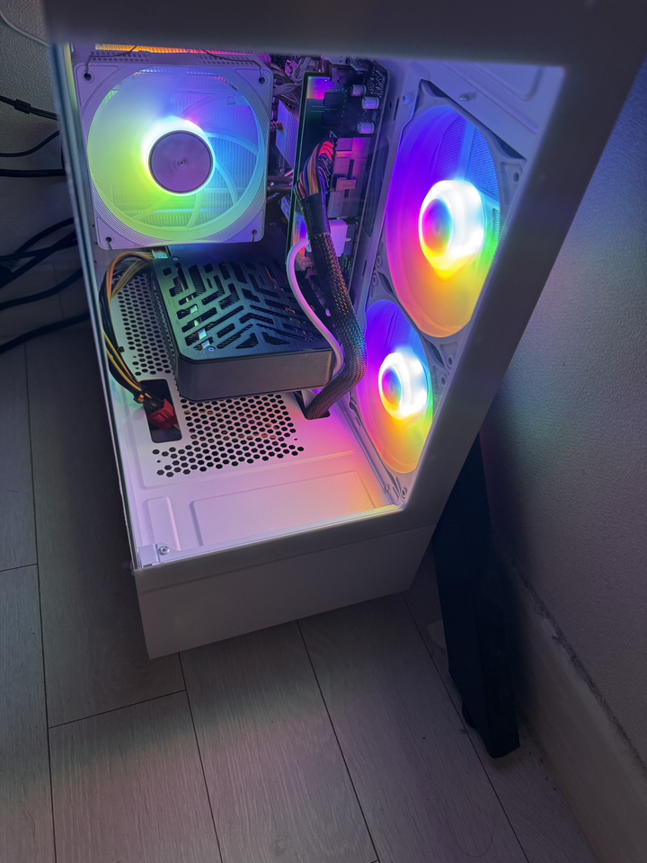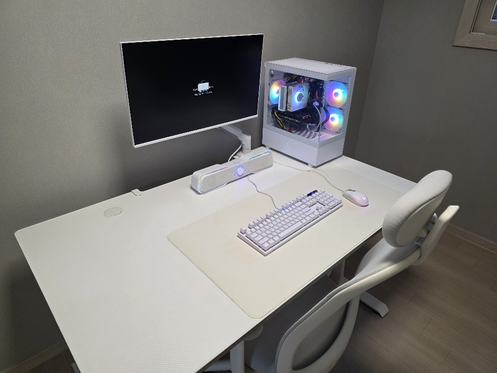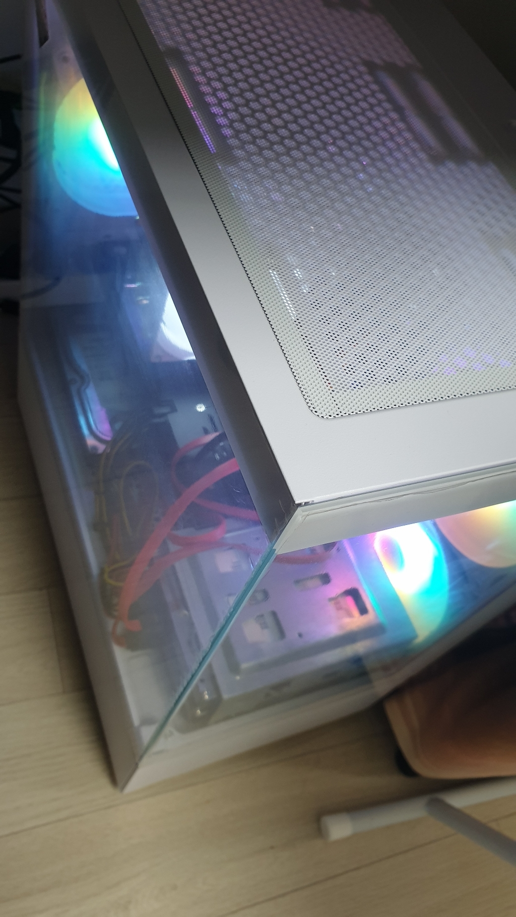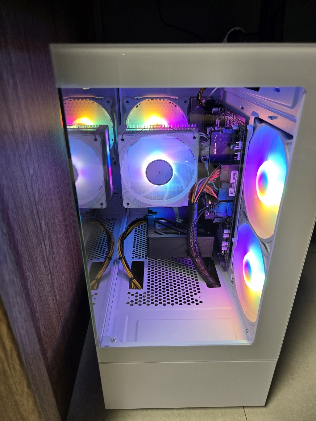 화이트 컬러에 측면 강화유리 + 전면 메쉬 구조라서 깔끔하면서도 내부 RGB가 은은하게 잘 보입니다. 과하지 않은 RGB라서 튜닝 PC 느낌보다는 감성 데스크 셋업에 잘 어울립니다. 책상 옆에 두어도 부담 없고, 전체적인 마감도 가격 대비 꽤 괜찮은 편입니다.