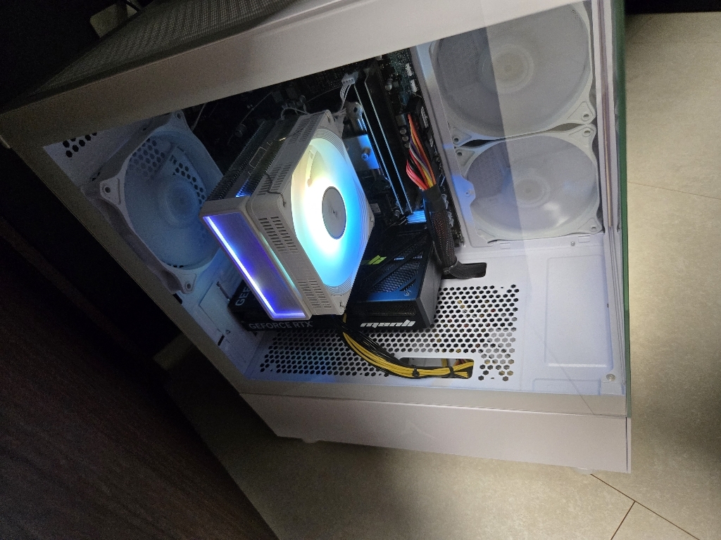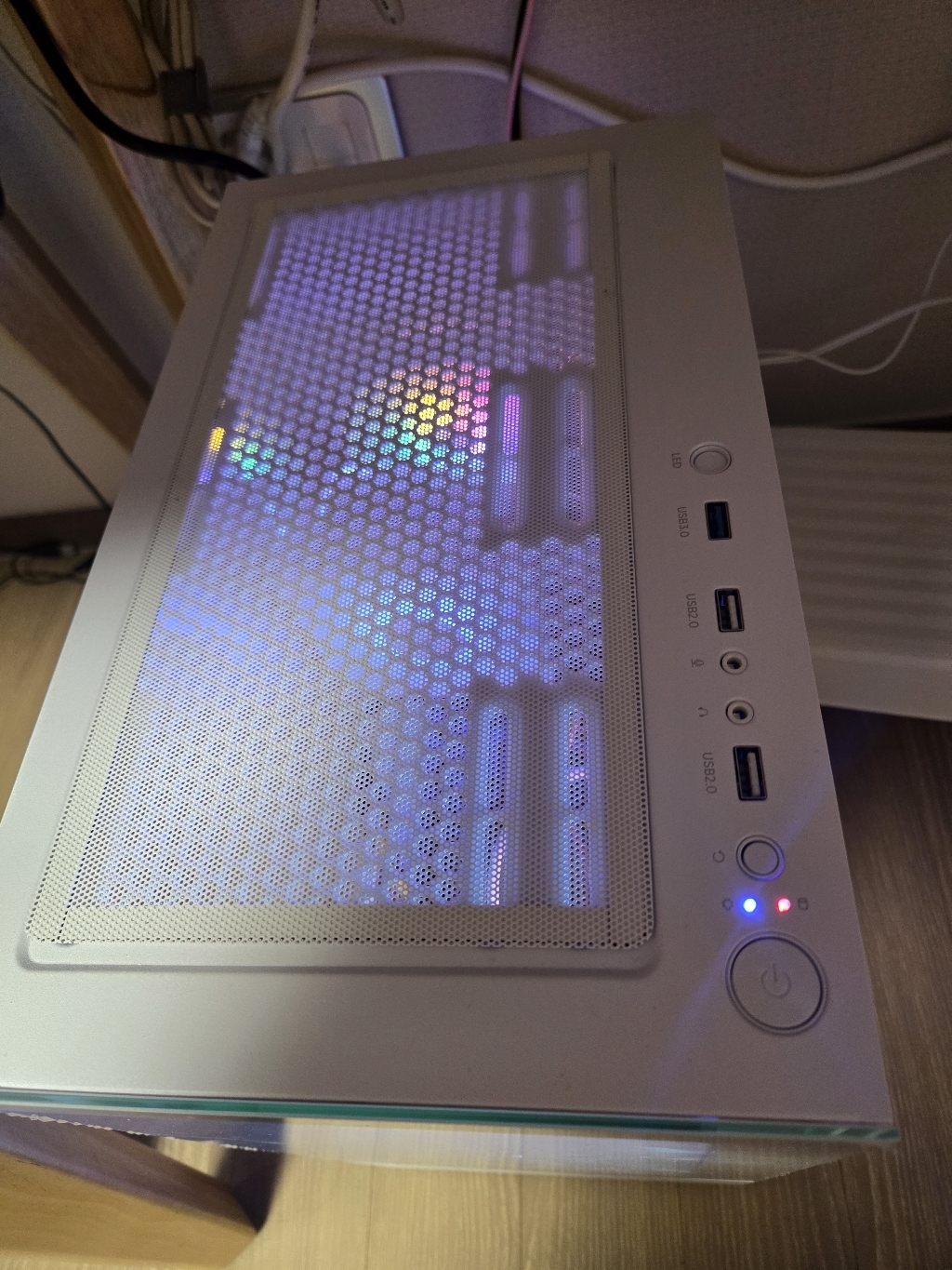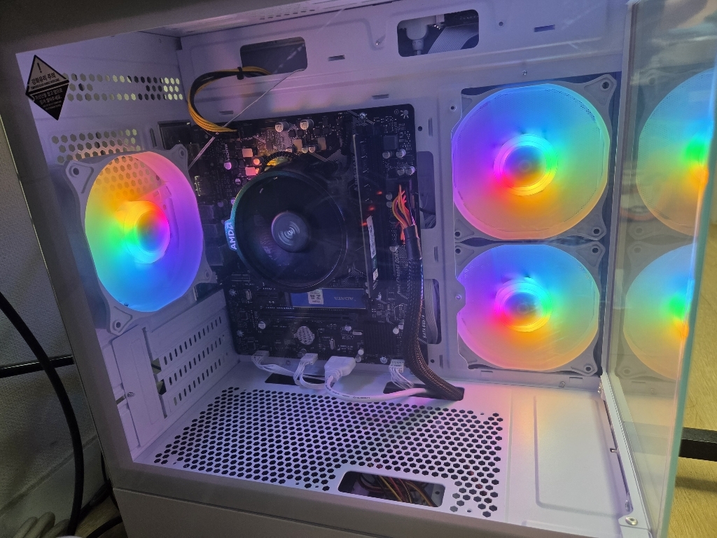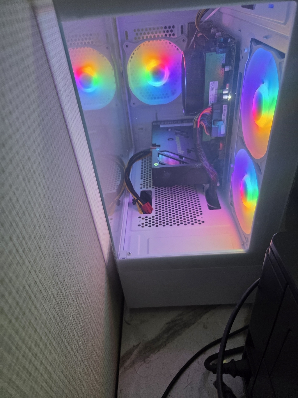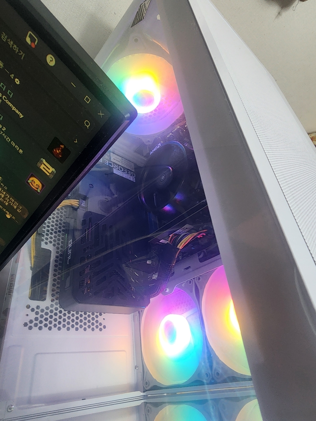화이트 컬러에 측면 강화유리 + 전면 메쉬 구조라서 깔끔하면서도 내부 RGB가 은은하게 잘 보입니다. 과하지 않은 RGB라서 튜닝 PC 느낌보다는 감성 데스크 셋업에 잘 어울립니다. 책상 옆에 두어도 부담 없고, 전체적인 마감도 가격 대비 꽤 괜찮은 편입니다.