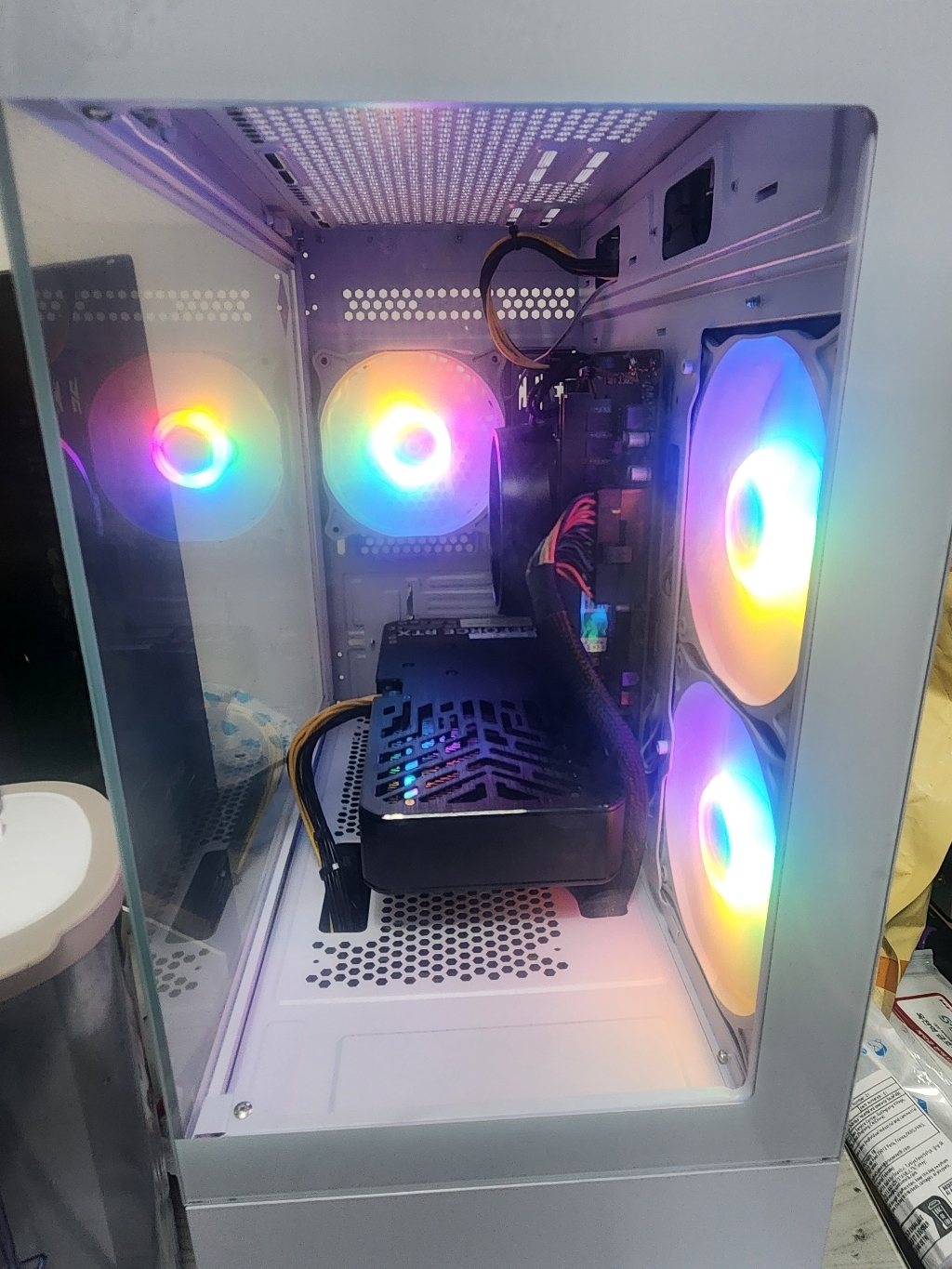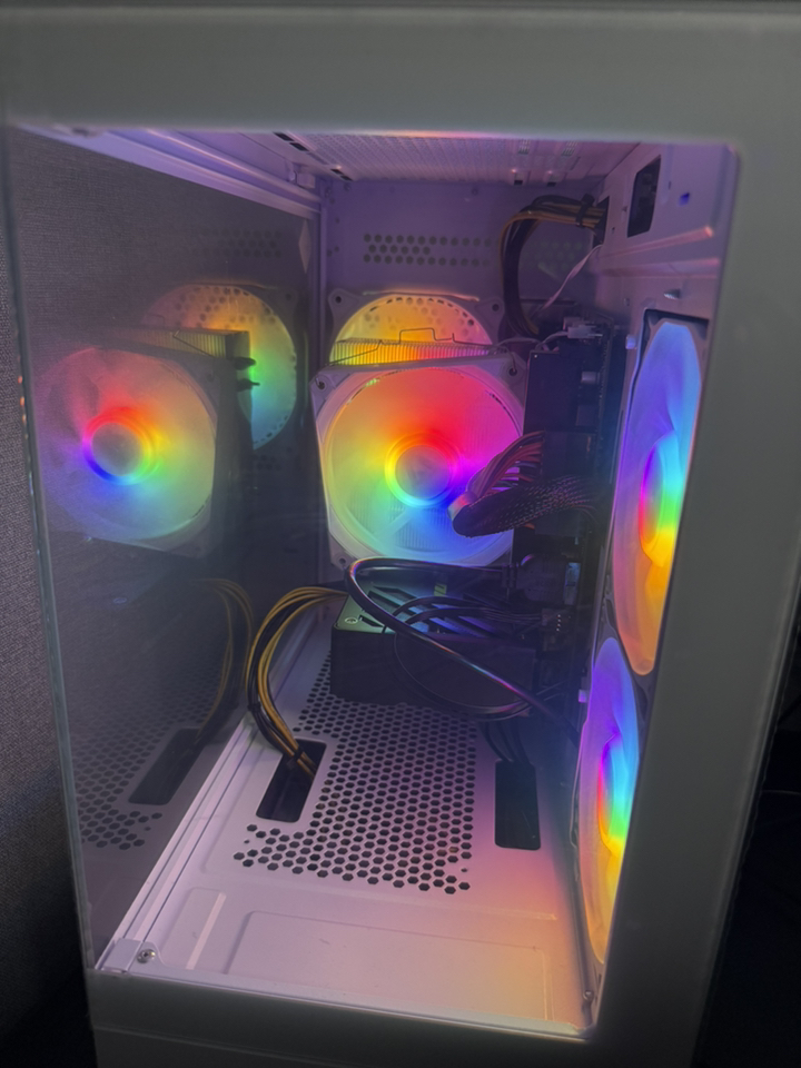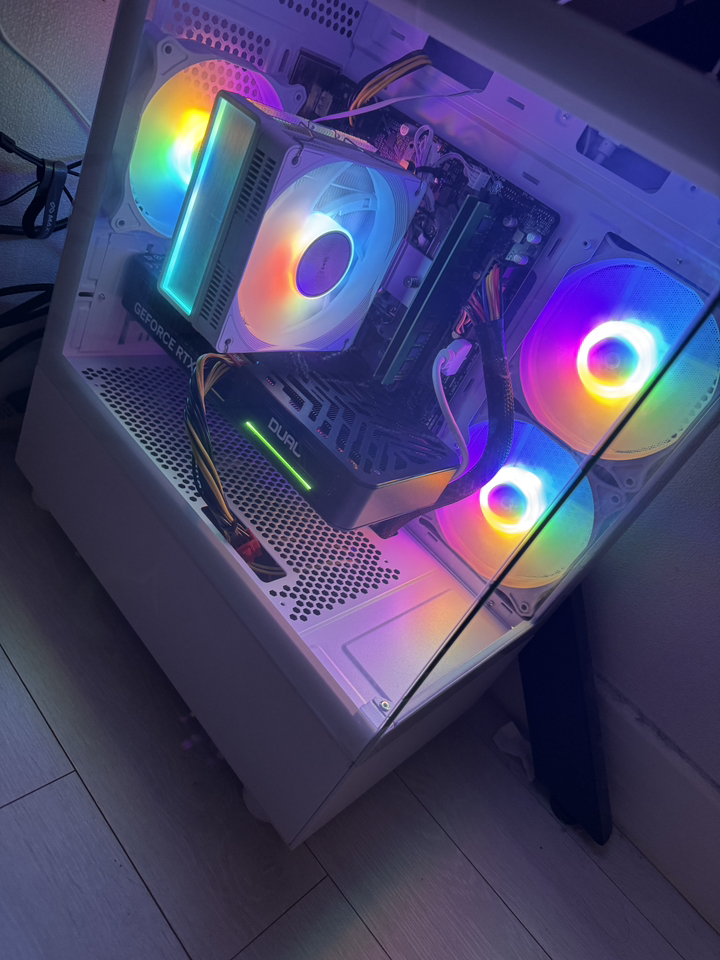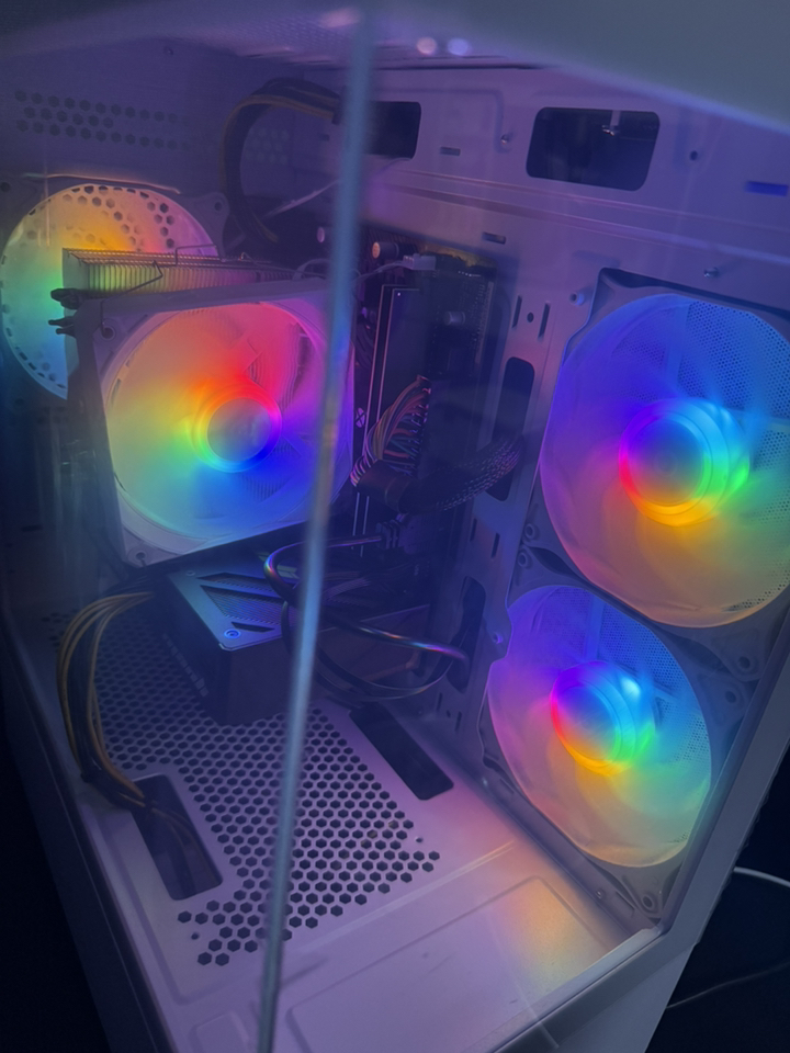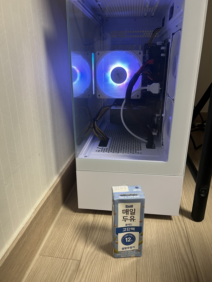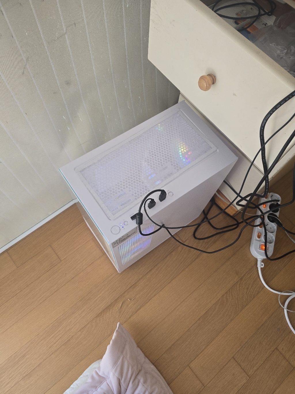 화이트 컬러에 측면 강화유리 + 전면 메쉬 구조라서 깔끔하면서도 내부 RGB가 은은하게 잘 보입니다. 과하지 않은 RGB라서 튜닝 PC 느낌보다는 감성 데스크 셋업에 잘 어울립니다. 책상 옆에 두어도 부담 없고, 전체적인 마감도 가격 대비 꽤 괜찮은 편입니다.