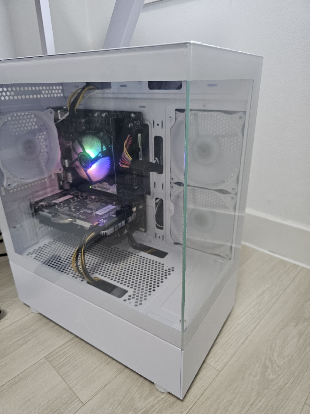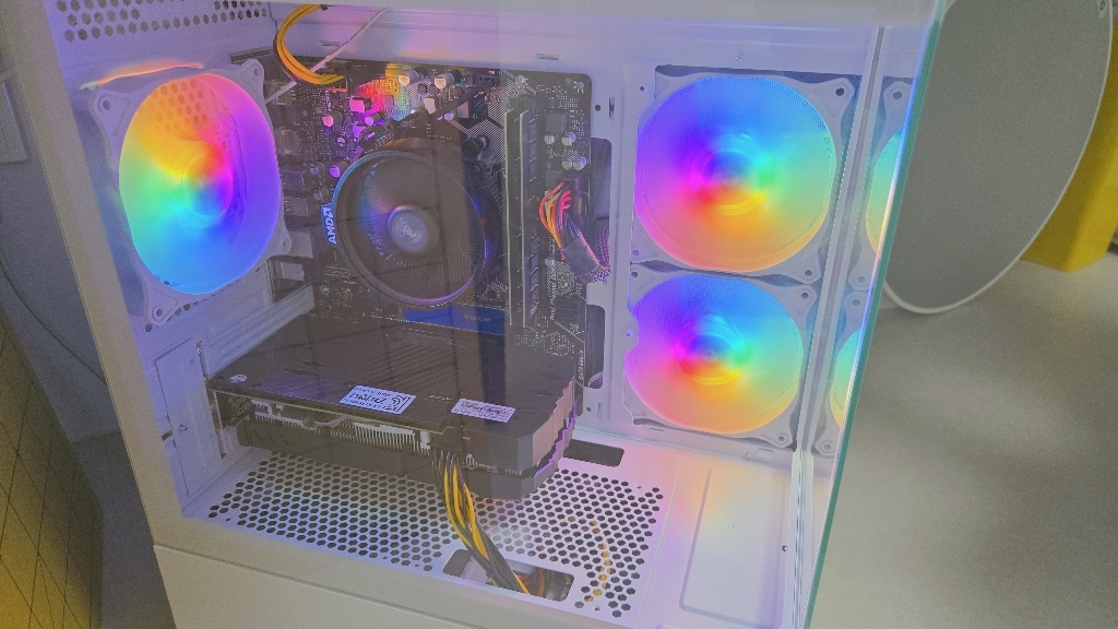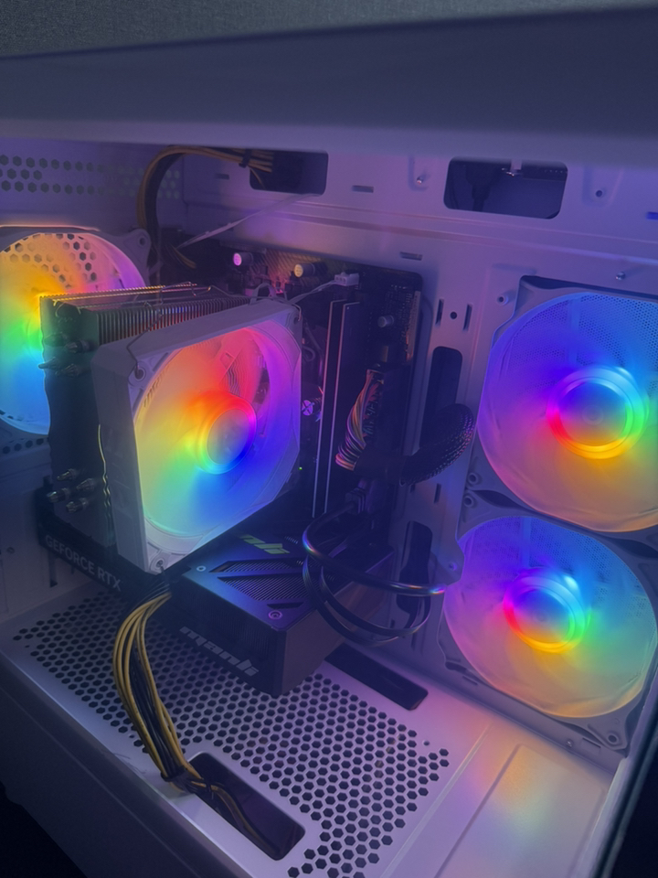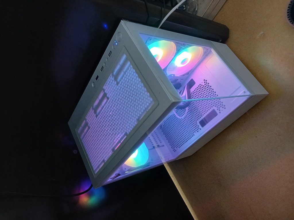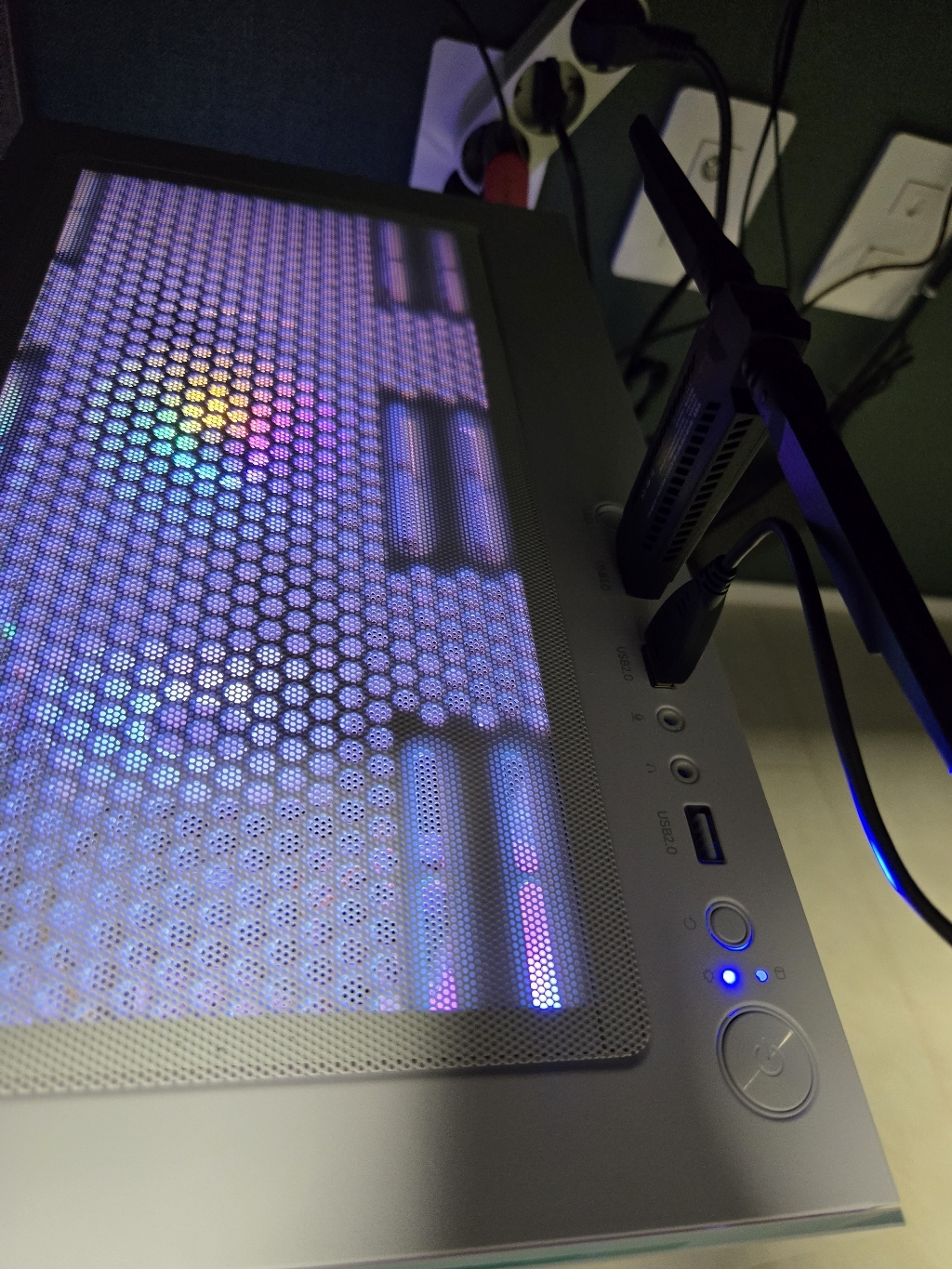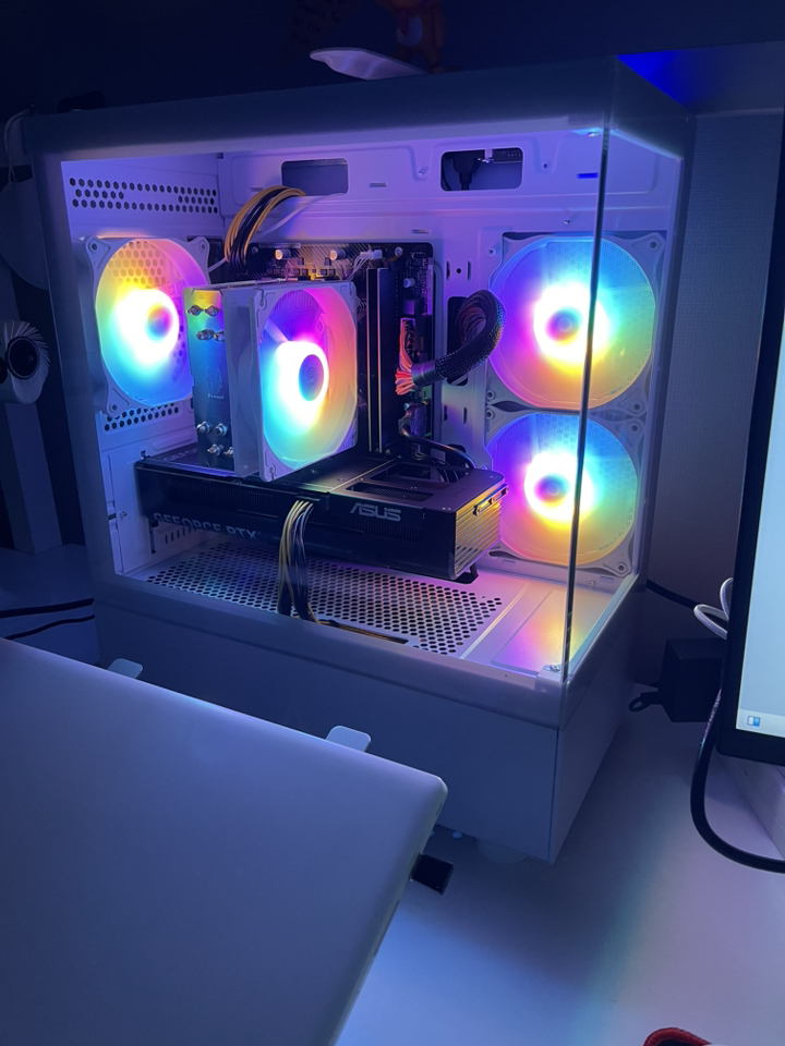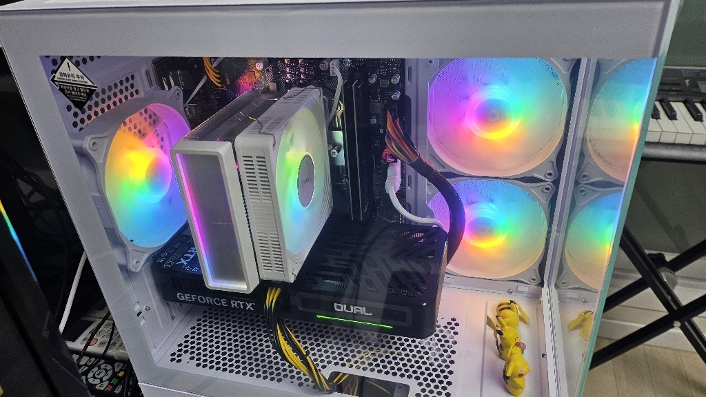 화이트 컬러에 측면 강화유리 + 전면 메쉬 구조라서 깔끔하면서도 내부 RGB가 은은하게 잘 보입니다. 과하지 않은 RGB라서 튜닝 PC 느낌보다는 감성 데스크 셋업에 잘 어울립니다. 책상 옆에 두어도 부담 없고, 전체적인 마감도 가격 대비 꽤 괜찮은 편입니다.