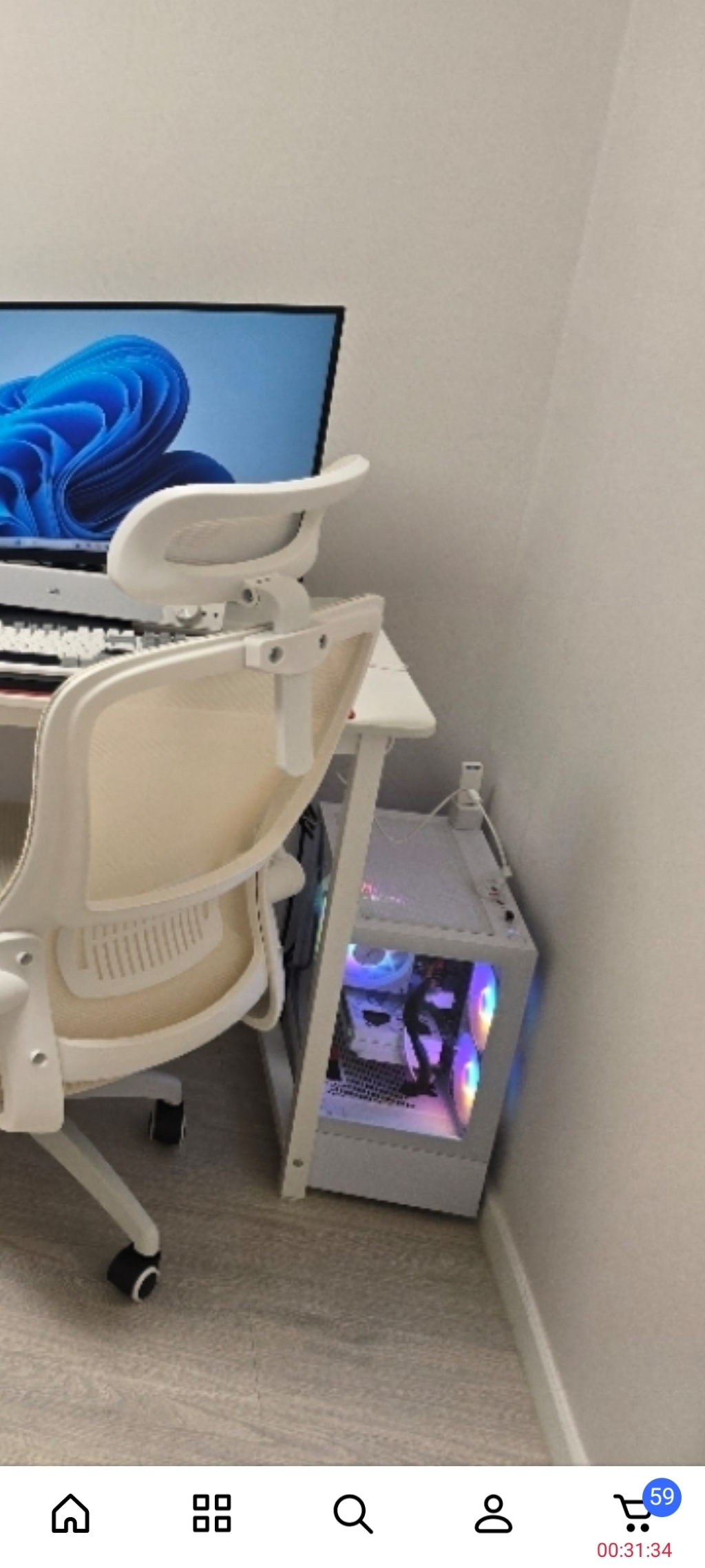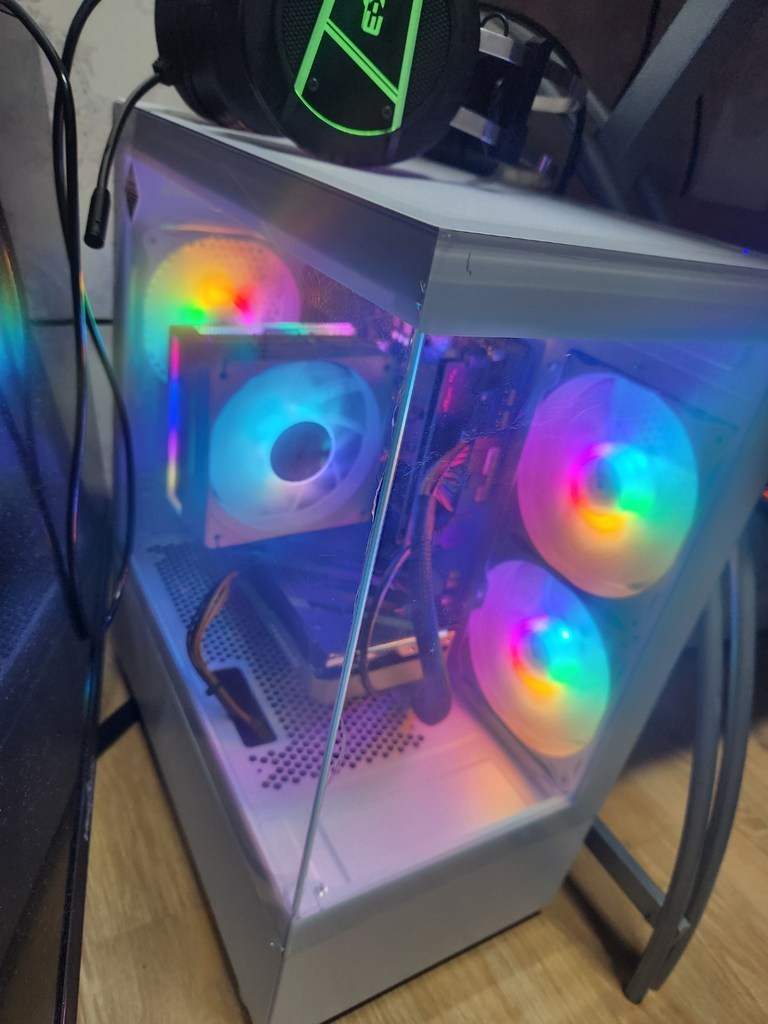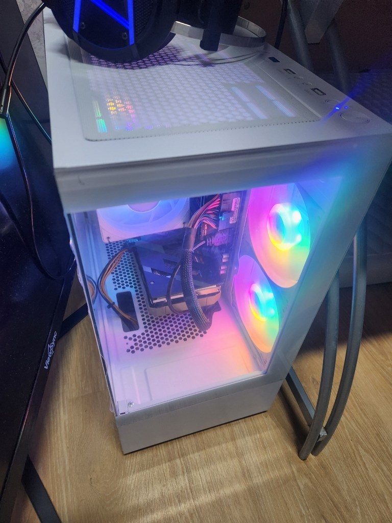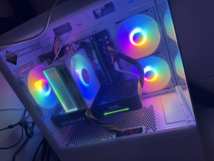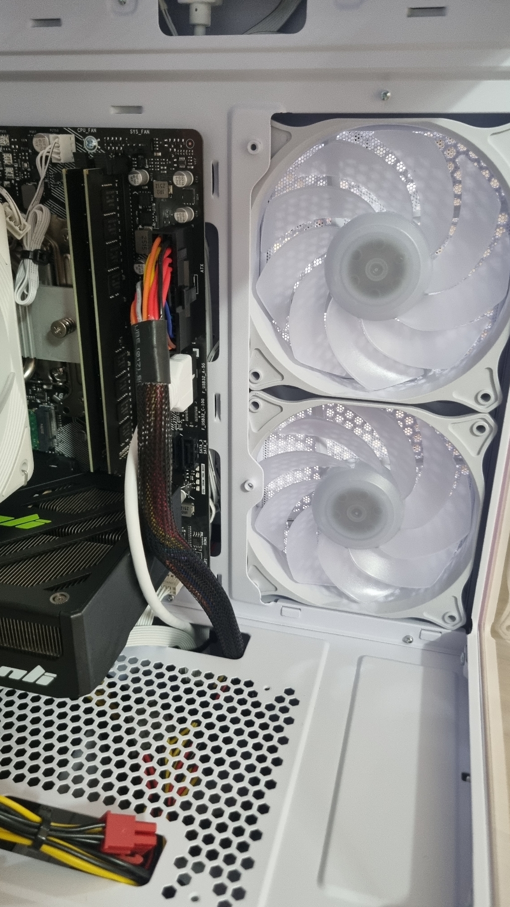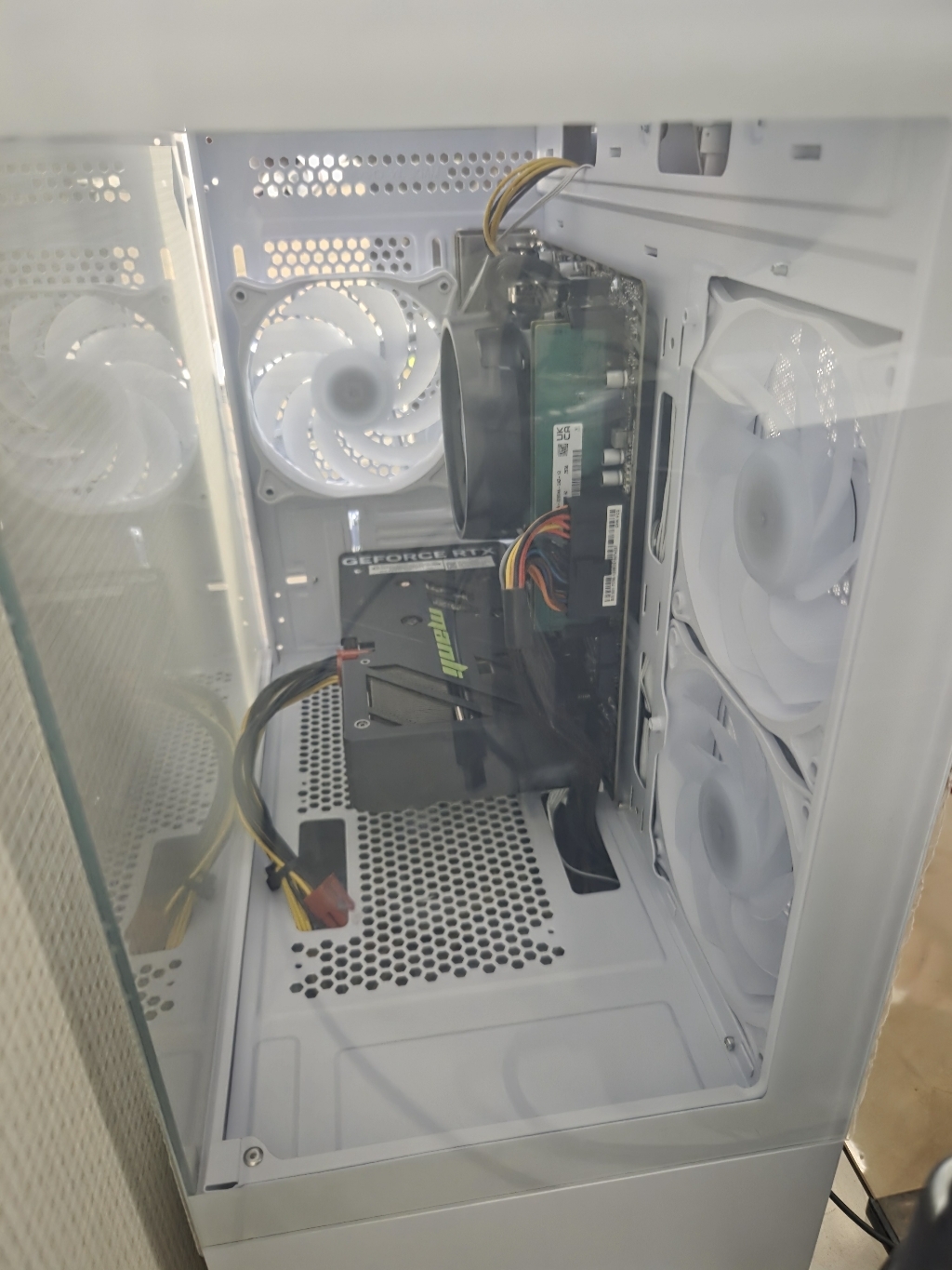 화이트 컬러에 측면 강화유리 + 전면 메쉬 구조라서 깔끔하면서도 내부 RGB가 은은하게 잘 보입니다. 과하지 않은 RGB라서 튜닝 PC 느낌보다는 감성 데스크 셋업에 잘 어울립니다. 책상 옆에 두어도 부담 없고, 전체적인 마감도 가격 대비 꽤 괜찮은 편입니다.