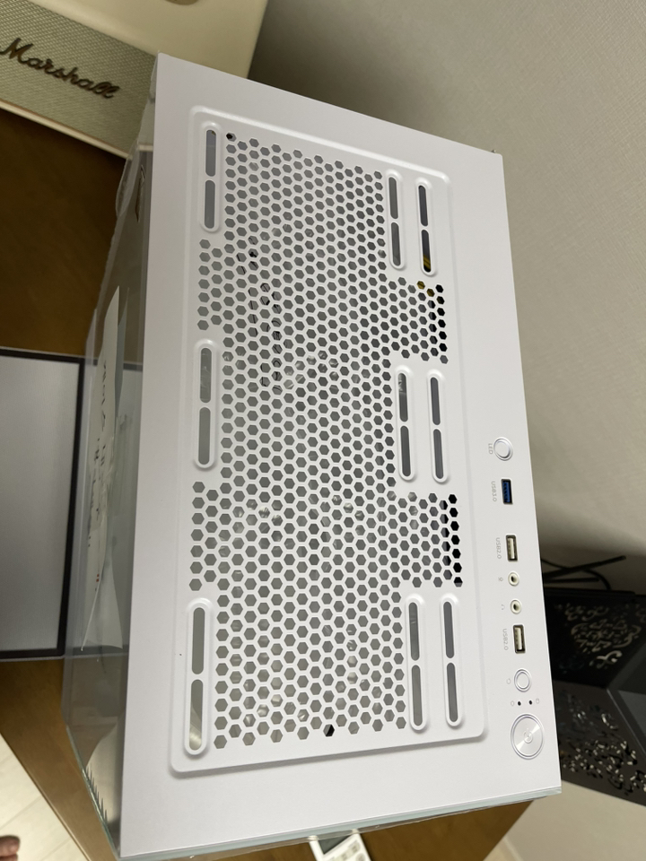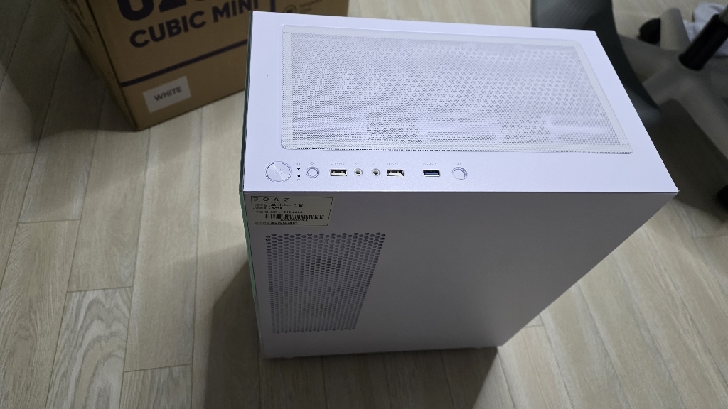 상단에는 메쉬 타공 + USB 포트 구성이 잘 되어 있어서 실사용 편의성이 좋았습니다. 전원 버튼, USB 포트 위치도 직관적이라 불편함 없고, 먼지 유입도 최소화되는 구조라 관리하기도 수월해 보입니다.