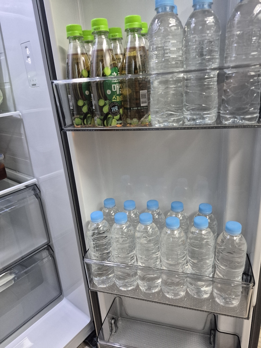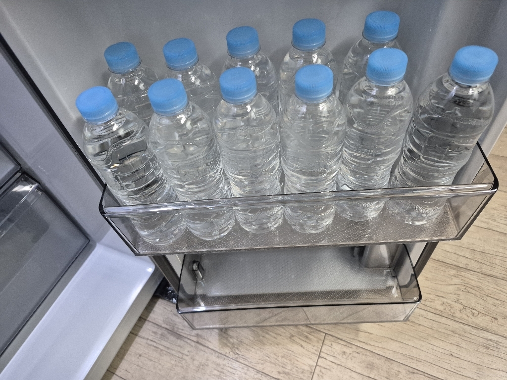 병 디자인도 괜찮아요. 뭔가 흐리멍덩하게 생긴 일반 생수병이 아니라, 간결하고 심플한 무광 느낌이라 주방에 그대로 꺼내놔도 예쁘고, 냉장고에 쫙 진열해도 보기 좋아요. 손에 쥐었을 때 그립감도 좋고, 병이 물렁하지 않아서 따르기 편해요.