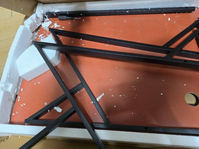 다만 제품 중간중간에 살짝휘어있고 표면끝이 너무날카롭고 파손주위붙어있지않아서 그런지 제품을 밟은흔적들있고 책상 상판에는 목제가루라 하기엔 너무 지저분한 상태… 대충쓰기엔 좋은제품…이랄까…? 조립전 30분은 닦았네요.. 밤에 급하게 조립하느라 사진은 없지만 한번 더 구입 하기엔 띡히..