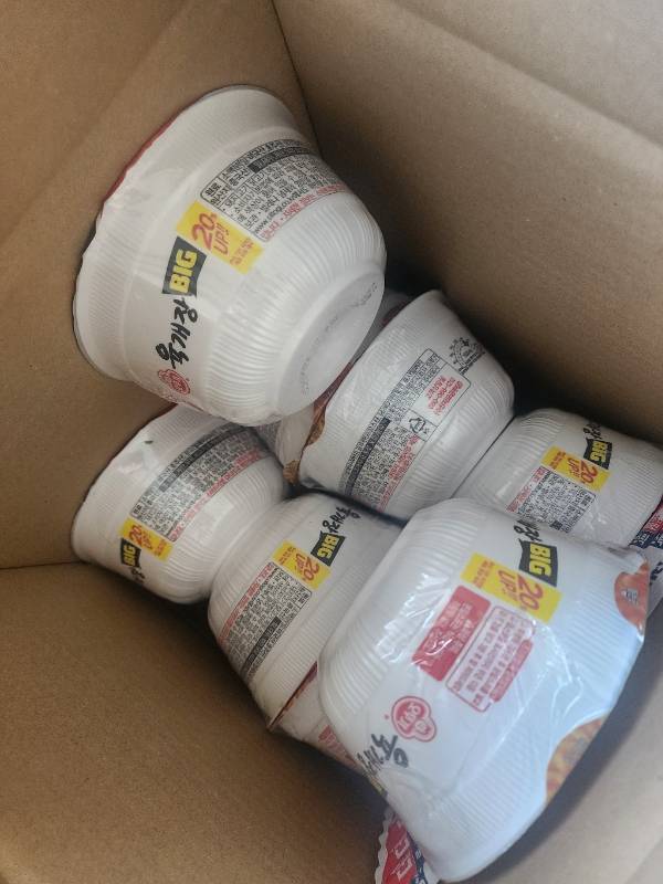 배송 중 부서짐 없이 컵라면과 스프 빽빽 차서 무게감 제대로 느껴짐.