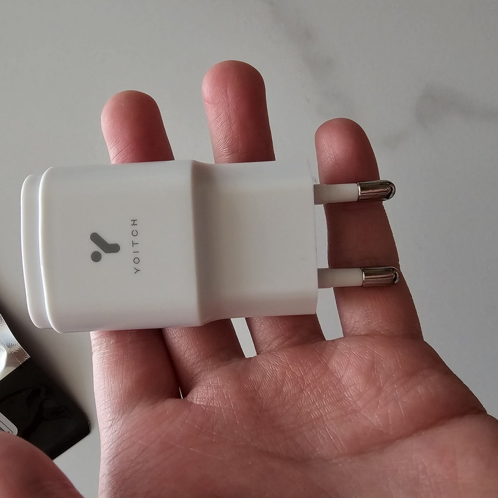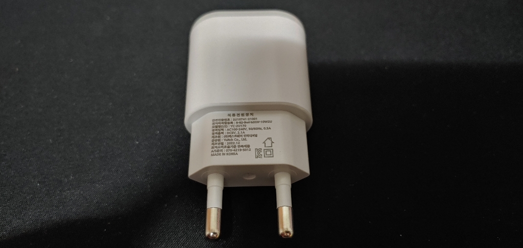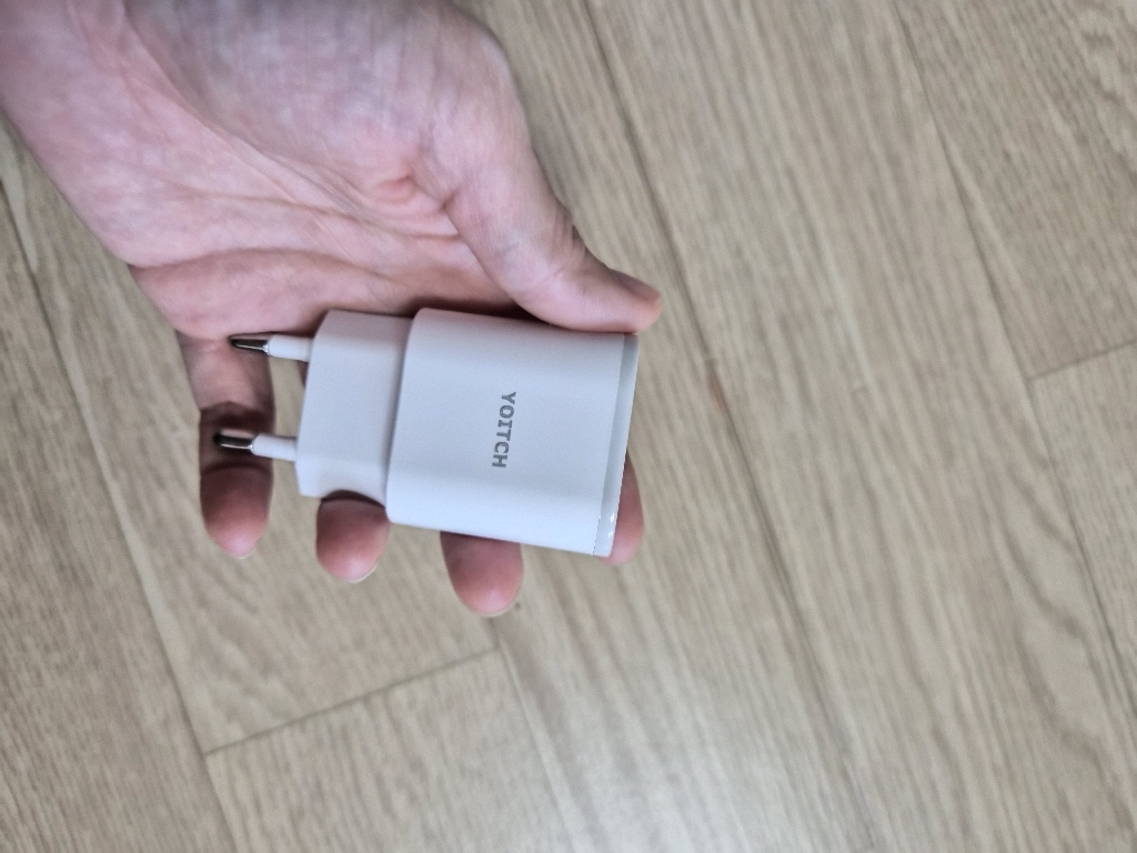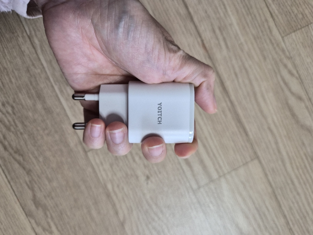 충전기 크기는 작고 아담해서 콘센트에 꽂았을 때 공간 차지도 적고, 여행 가방이나 책상 위에 두기에도 부담 없어요. 디자인은 심플하고 깔끔해서 특별히 튀지는 않지만, 너무 고급스럽지도 않은 무난한 느낌입니다.