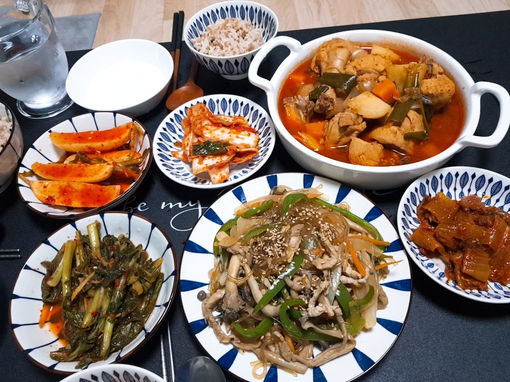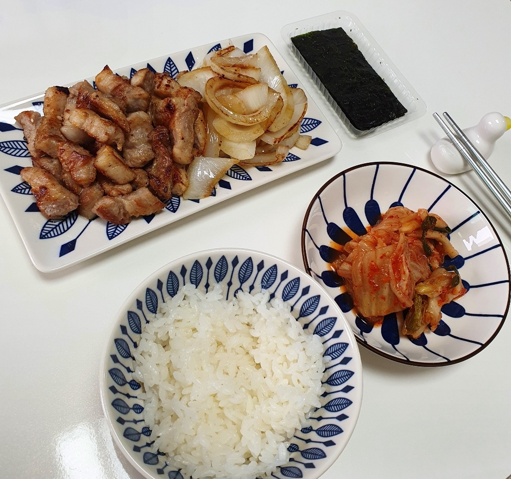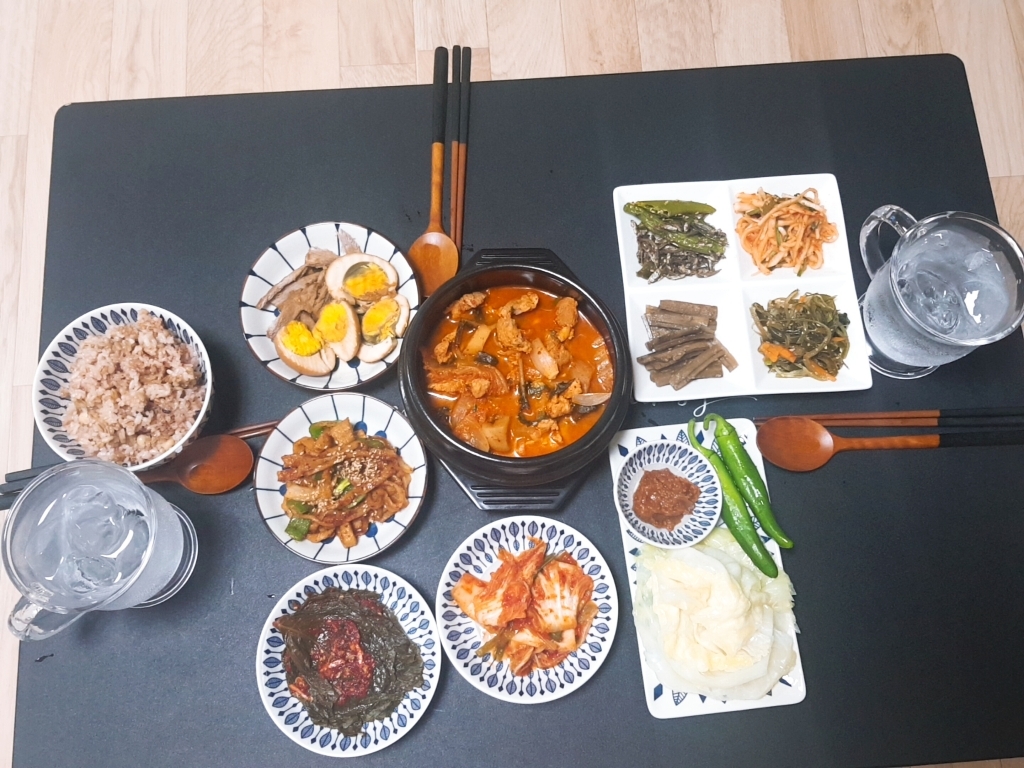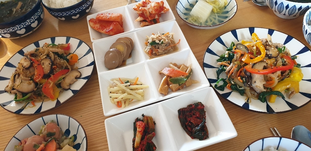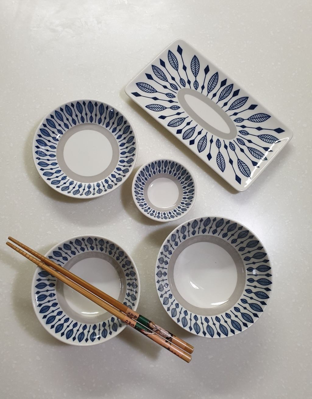 심플한 디자인에 식기에 반찬을 담으니 더욱 더 돋보이게 해주는 식기의 무늬가 음식을 더욱 살려 주는 것 같아요