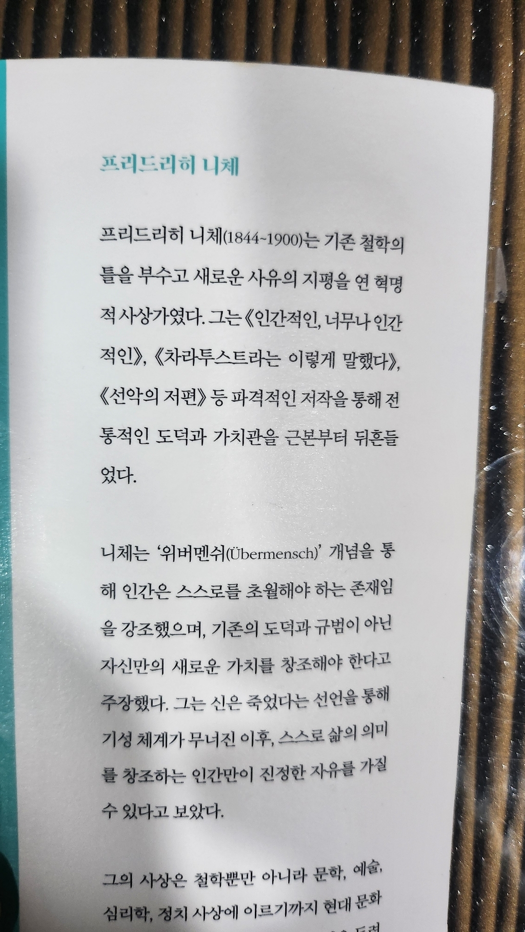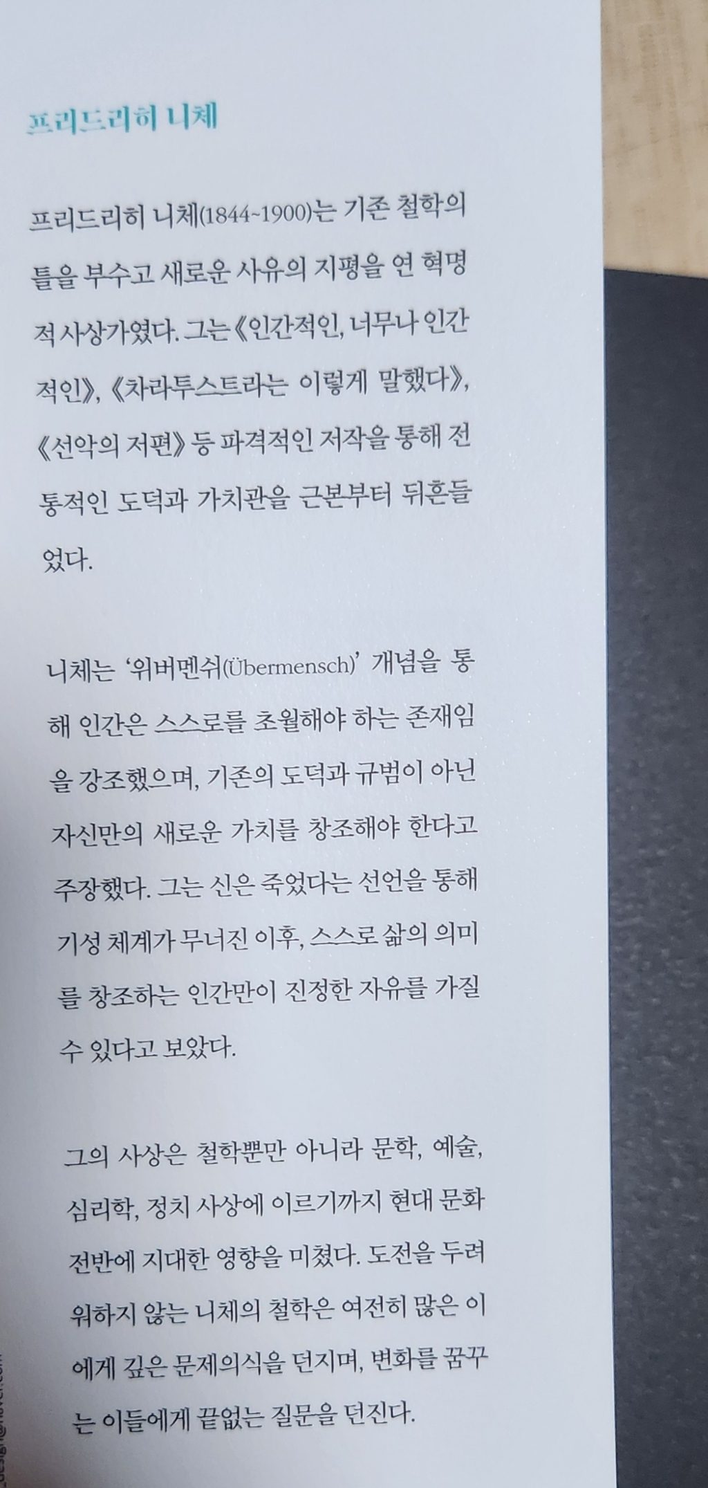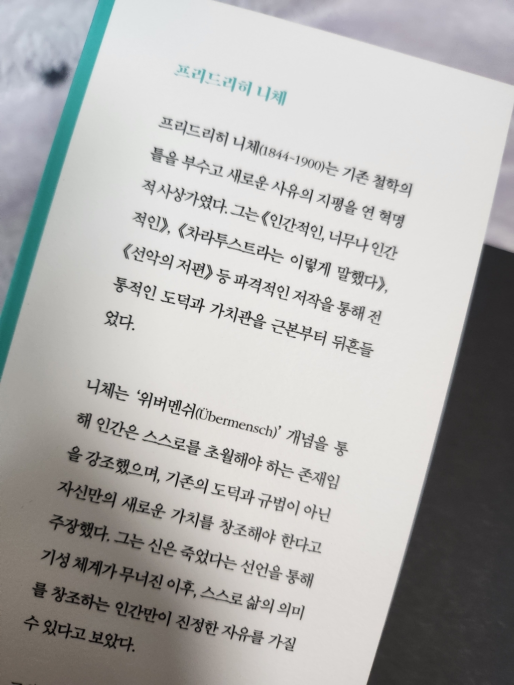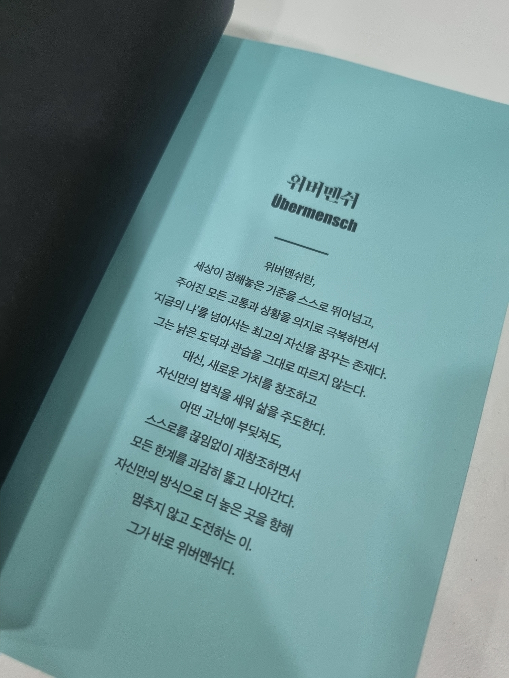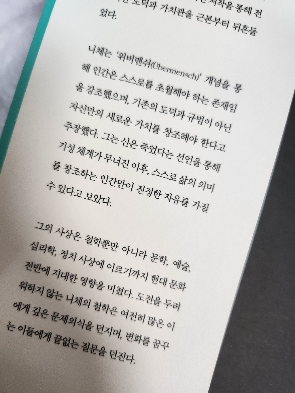특히 마음에 들었던 건 ‘위버멘쉬(초인)’이라는 개념을 단순한 철학적 용어가 아니라, 현대를 살아가는 개인 에게 어떻게 적용할 수 있는지 구체적인 예시와 함께 설명해준다는 점이에요. 사회의 기준이나 타인의 기대에서 벗어나, 나 스스로의 삶의 기준을 세우는 과정이 얼마나 중요한지를 여러 각도에서 보여줘서 읽는 동안 계속 공감하게 되었습니다.