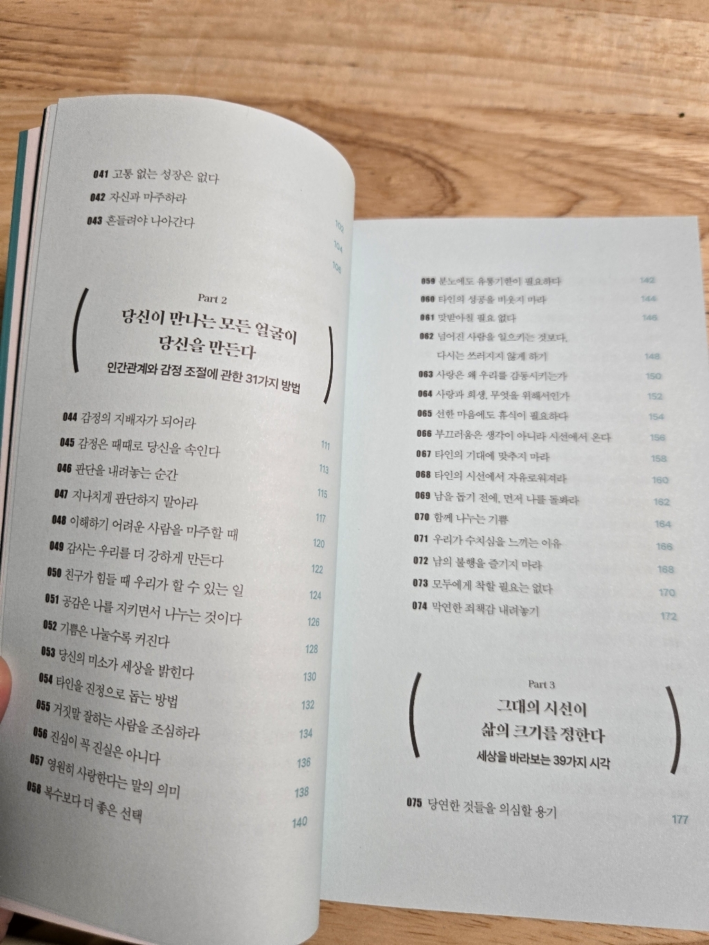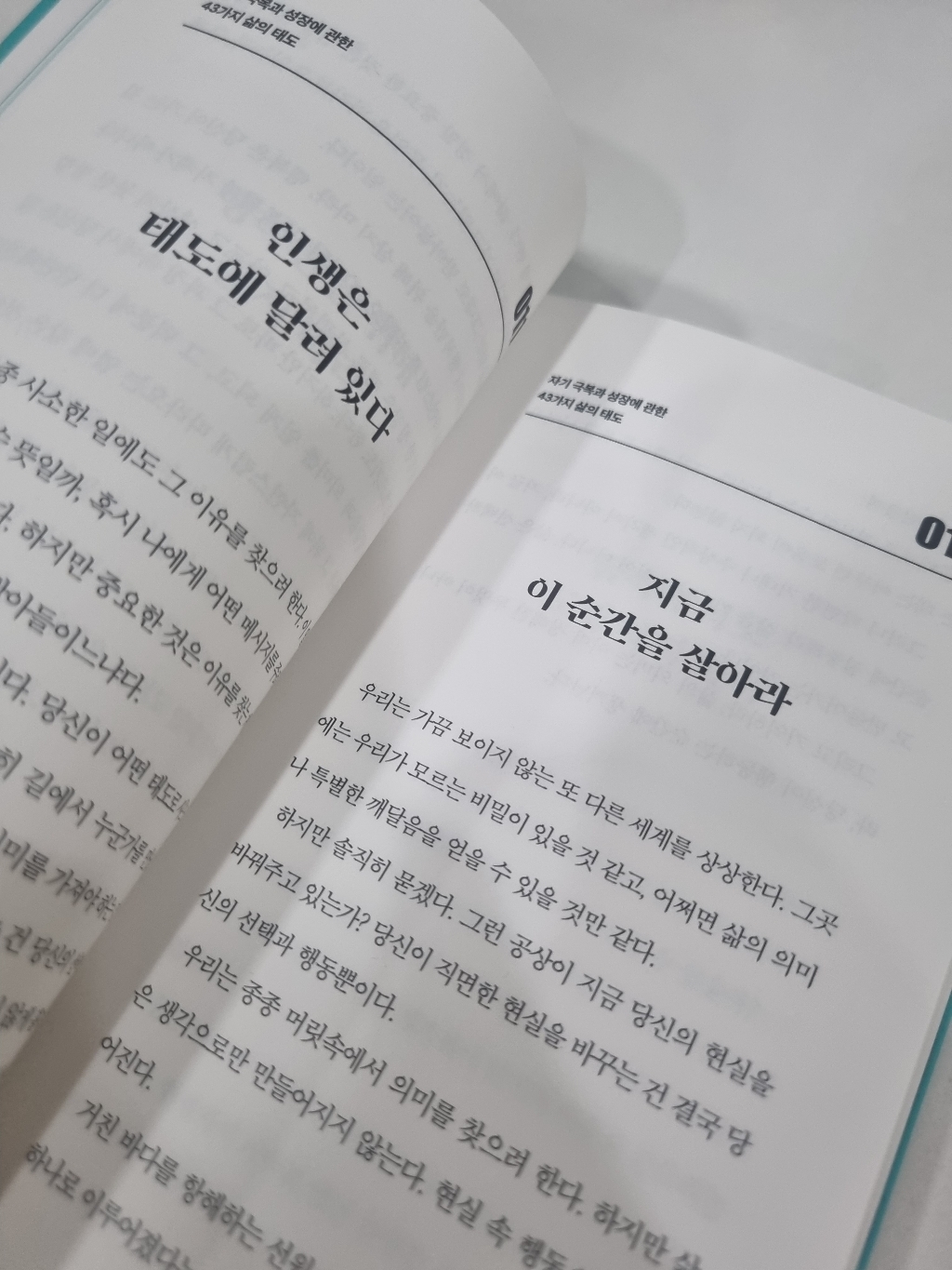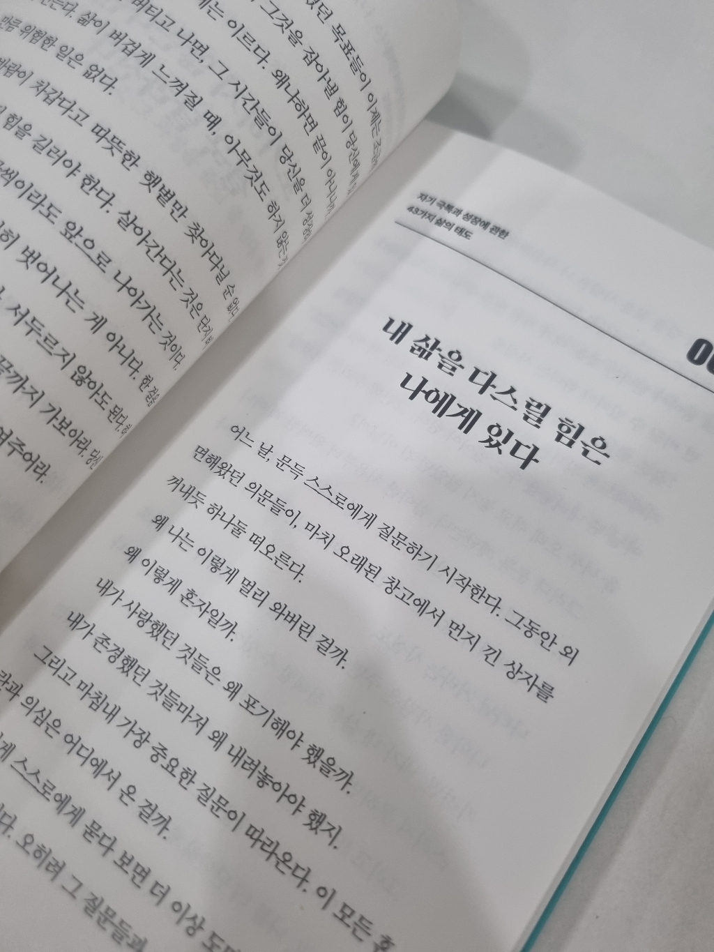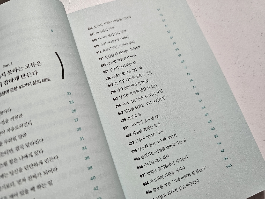 내용은 자기 극복, 인간관계, 감정 조절, 삶을 대하는 태도 등 현실적인 주제들로 나누어 독자의 몰입도를 높입니다.