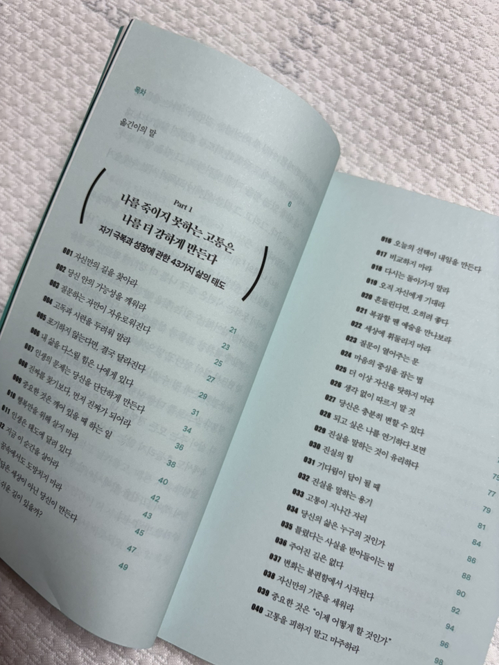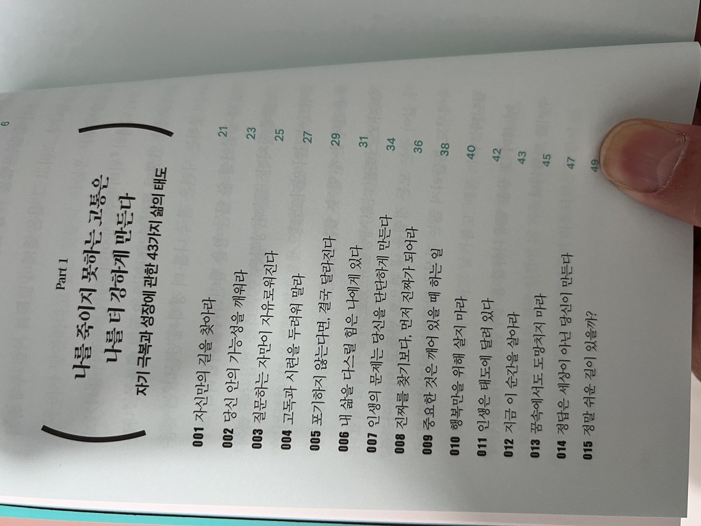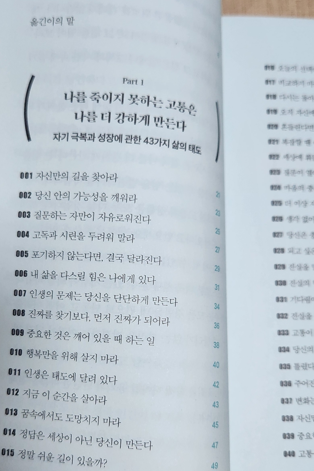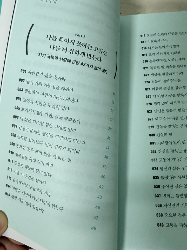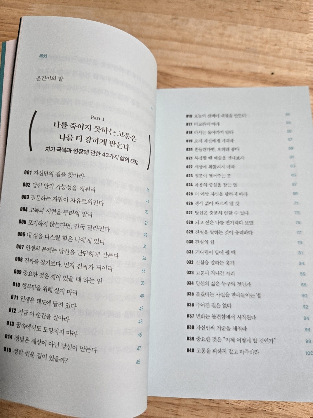 part 1. 나를 즉이지 못하는 고통은 나를 더 강하게 만든다.( 자기극복과 성장이 관한 43가지 삶의 태도)