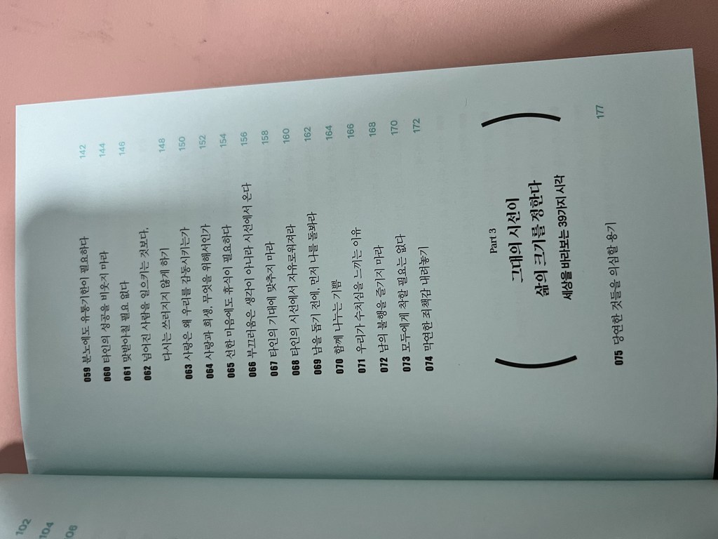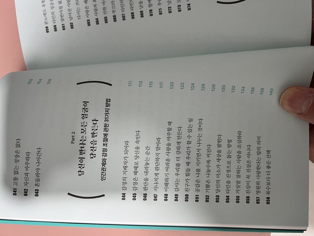 작은 책 크기 250여 페이지 큰 활자 로 씌여졌으며 짧은 글로 이루어져 있어 술술 읽허져요. 게다가 앞 내용이 기억나지 않아도 읽을 수 있으며 아무페이지나 펼쳐 읽을 수도 있죠. 하지만 슬렁슬렁하고 짧은 글자들이지만 맘에 파고드는 정도는 정말이지 깊게 깊게 들어오더라구요. 첨엔 너무 쉽게 읽혀 이게 뭐야? 왜 유명해? 이랬는데 같은 꼭지글을 두 세번 반복하니 아하!이렇개 되더라는 거죠. 툭히나 전 인긴관계와 감정조절에 관한 것을 다룬 part 2 를 좀 더 생각하면서 읽게 되더라구요.