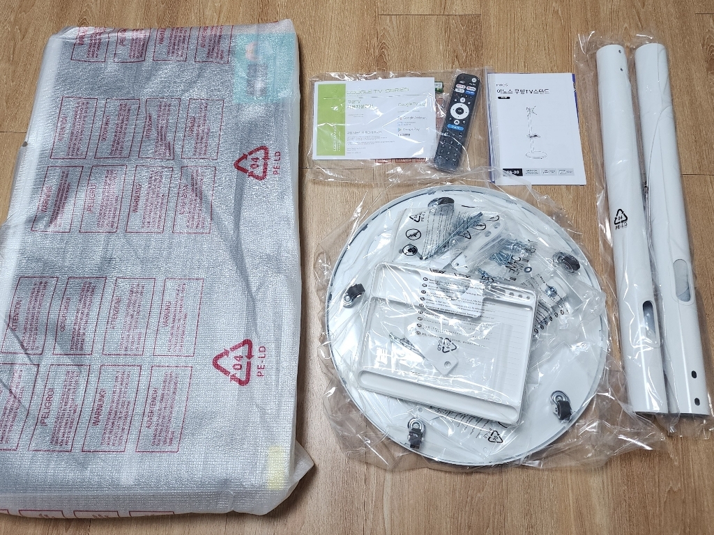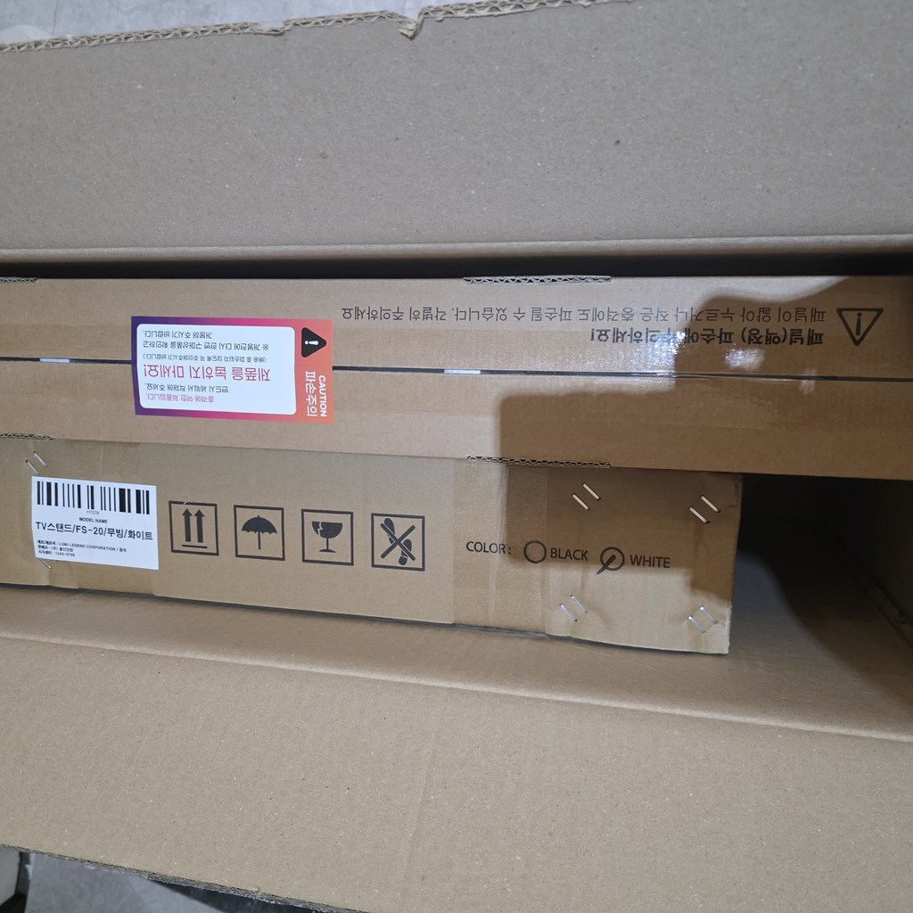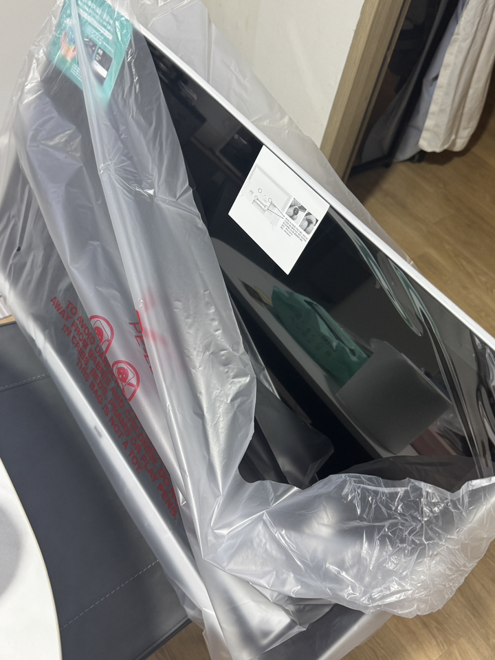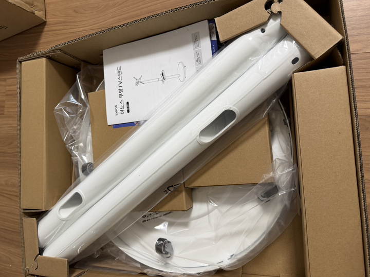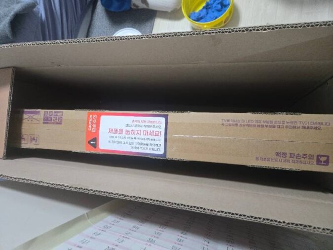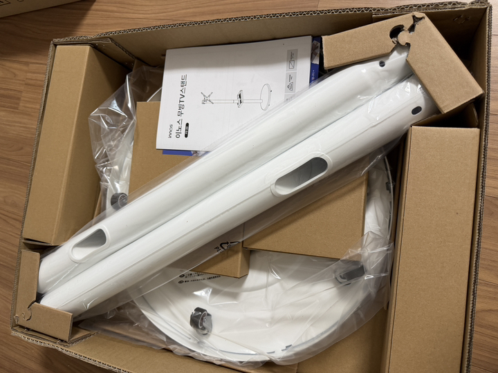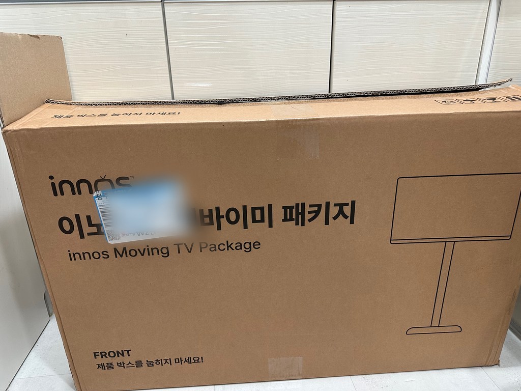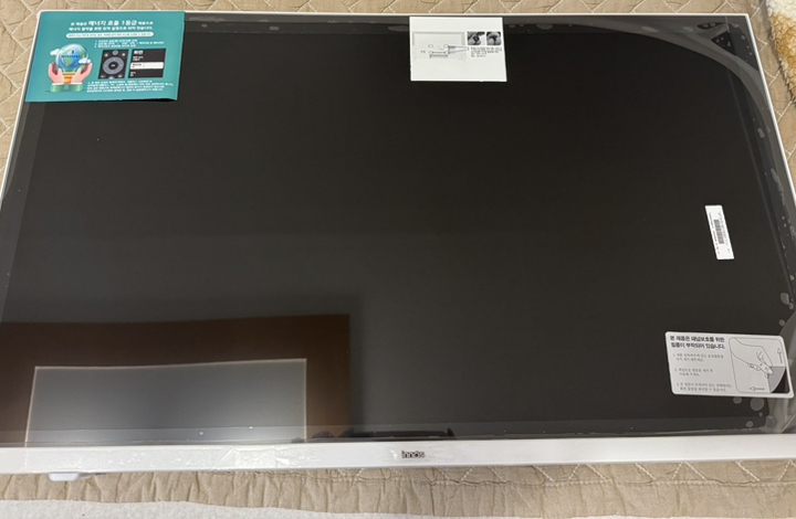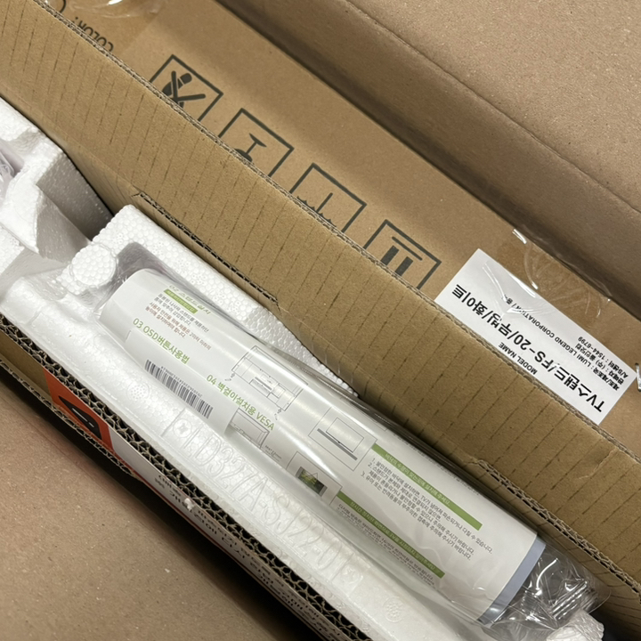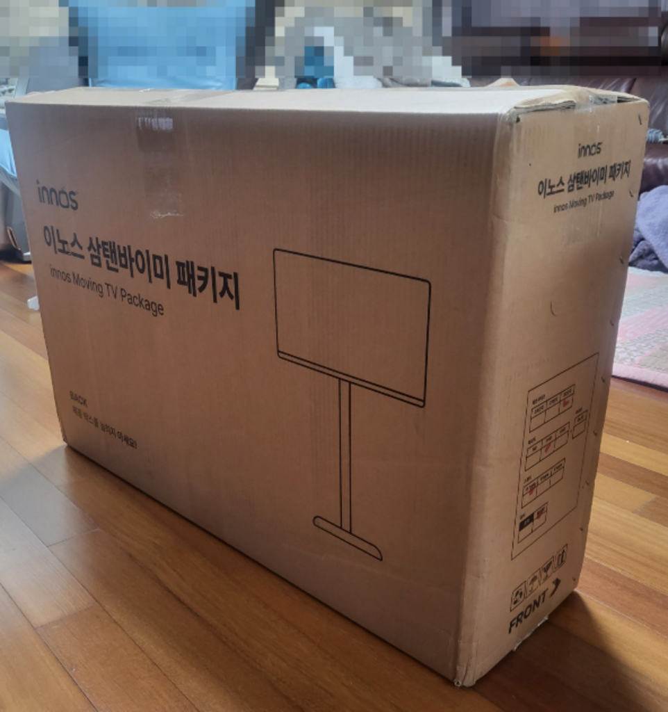 제품을 받아보니 박스 포장 상태가 안정적이었고, TV 본체와 무빙거치대가 분리된 상태로 포장되어 있어 설치 전 확인이 쉬웠어요.