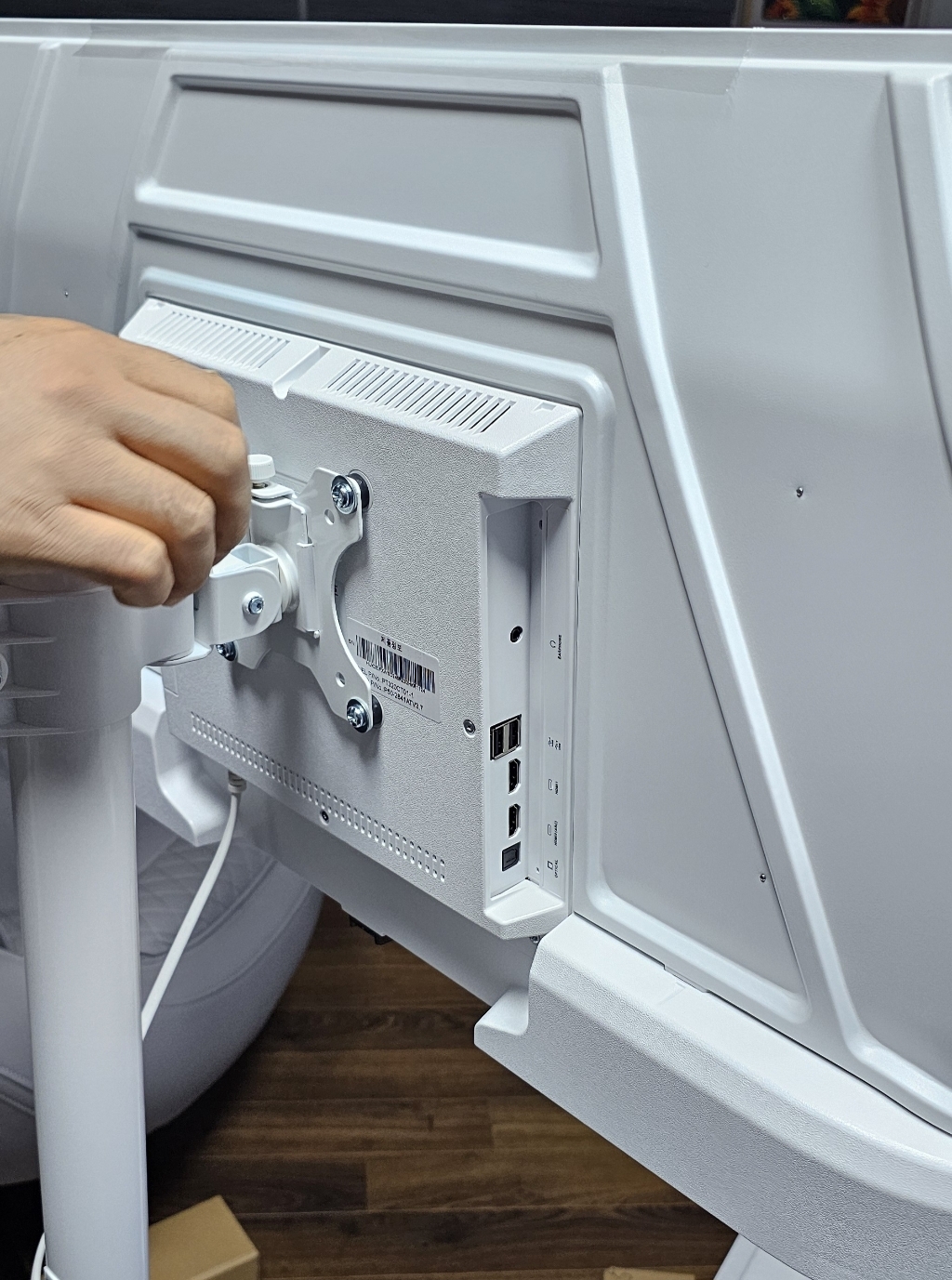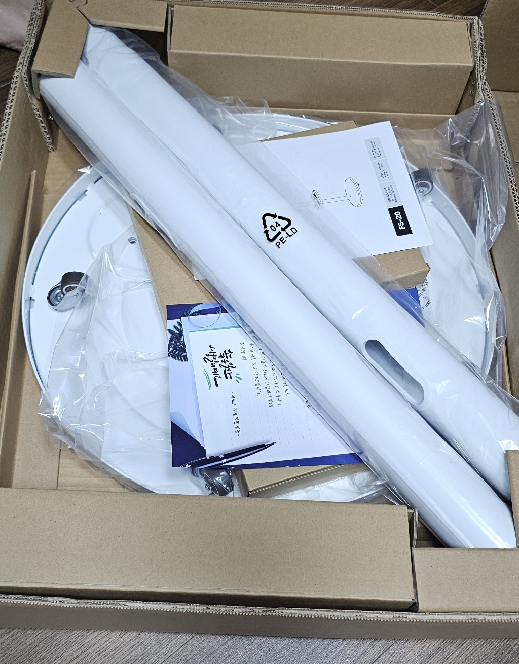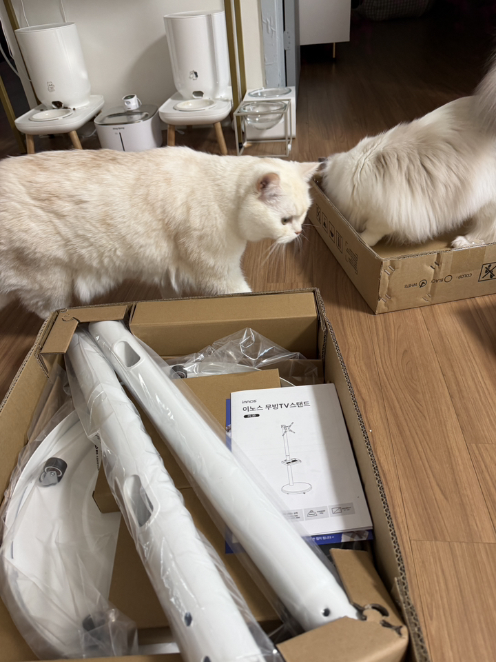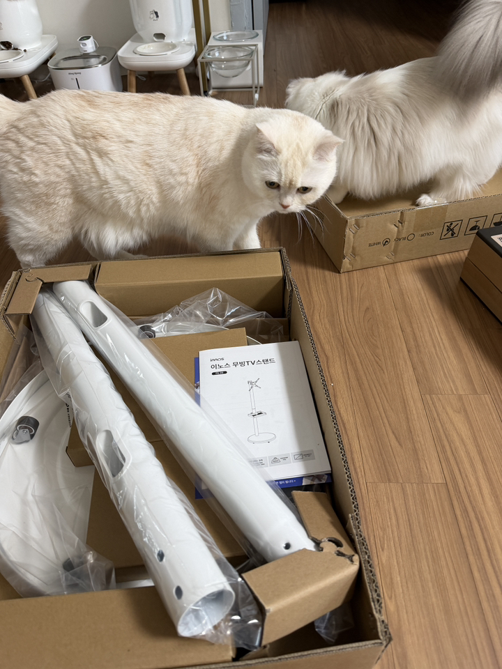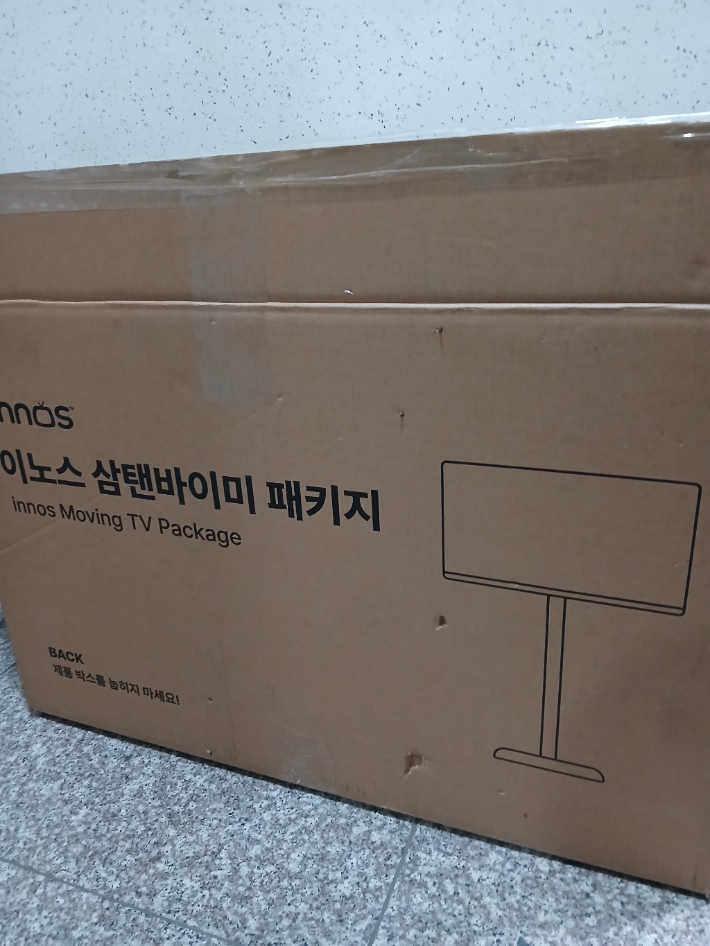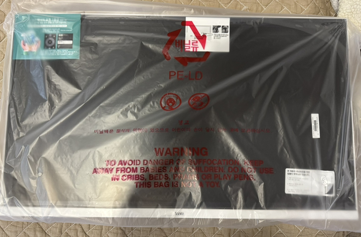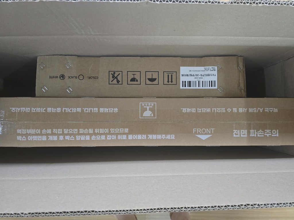 제품을 받아보니 박스 포장 상태가 안정적이었고, TV 본체와 무빙거치대가 분리된 상태로 포장되어 있어 설치 전 확인이 쉬웠어요.