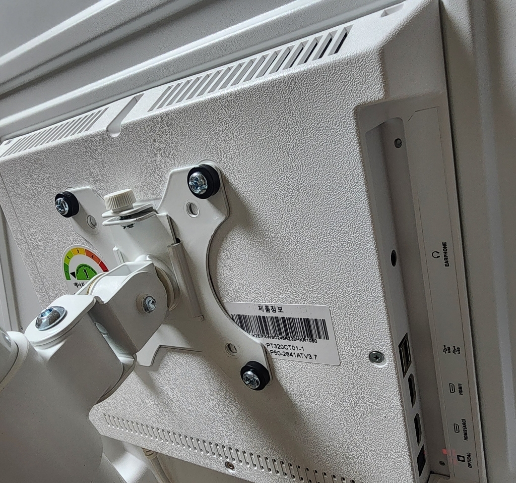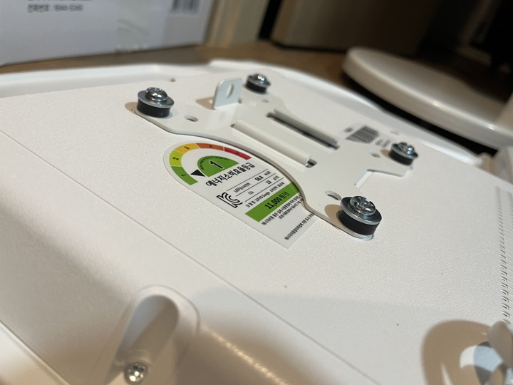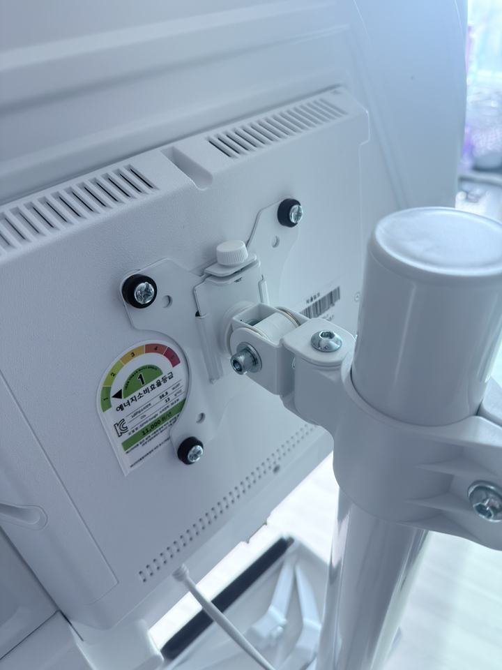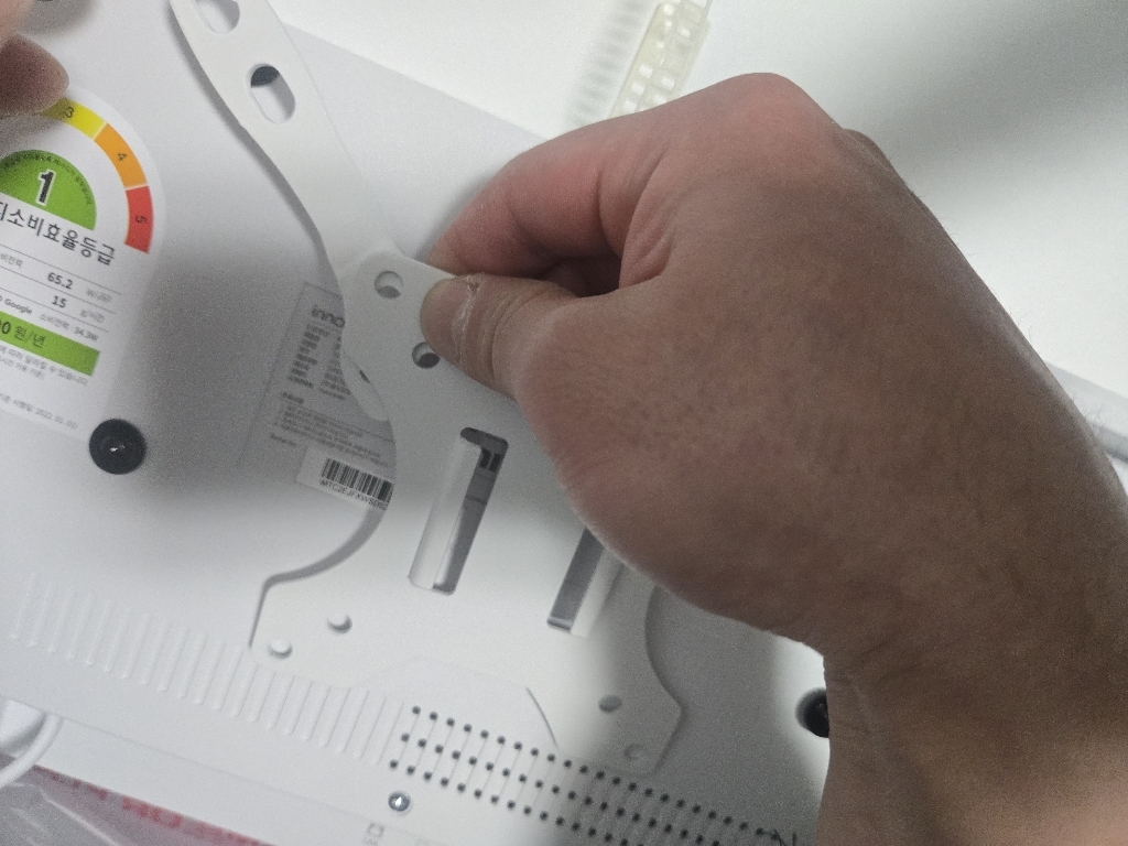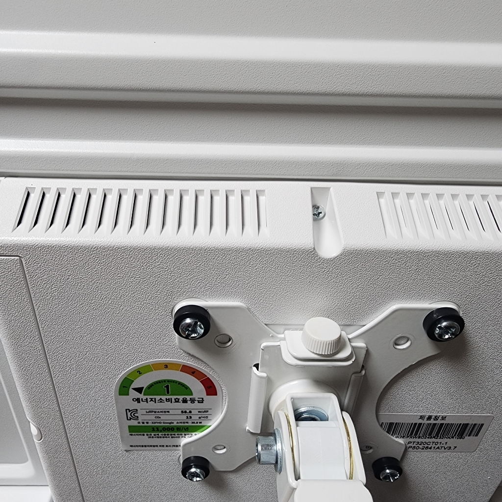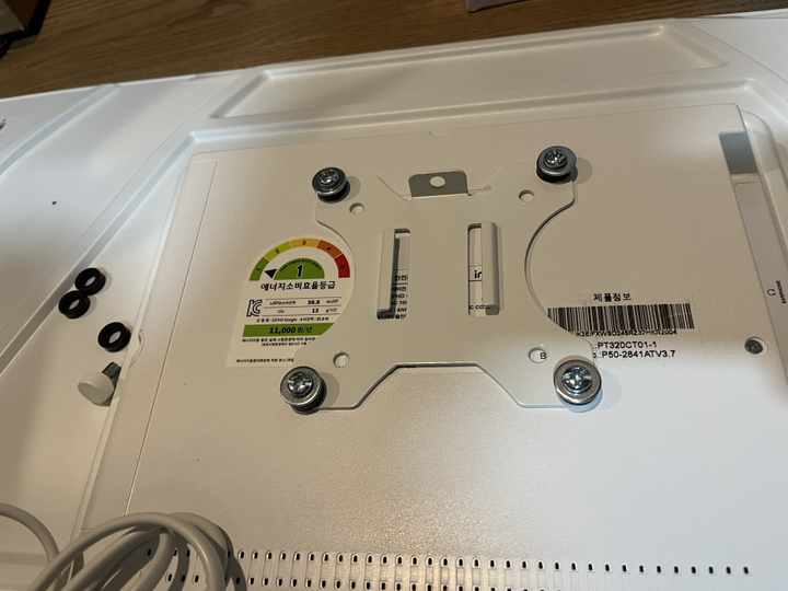 그런데 그런데 설명서 에서 틀린 설명이 있었음. 예를 들어 나사 A 나 B를 쓰라고 했는데 E를 써야 했음. 모델마다 써야 하는 나사가 다른데 그냥 한꺼번에 모든 모델 나사랑 부품을 보내줌. 설명서에서 쓰라는 나사가 안 맞을 수도 있으니 그냥 이것저것 시도해보시길 바람. 그리고 센스 문제를 언급하고 싶은 게 조립.설치 후에 에너지 소비 효율 등급 스티커와 제품명이 나와 있는 제품번호 스티커가 스탠드 봉에 가려져서 안 보임 그래서 에너지 효율 등급 환급금 신청 때 애를 많이 먹고 결국 다시 나사를 뽑아서 분해해야 했음. (사진 참조). 저와 비슷한 분 있을까봐 에너지 효율 등급 스티커하고 제품명 사진 같이 올려드림. 그리고 tv다이용 받침대도 같이오기때문에 다이위에 올려서 쓰려면 쓸 수 있음!