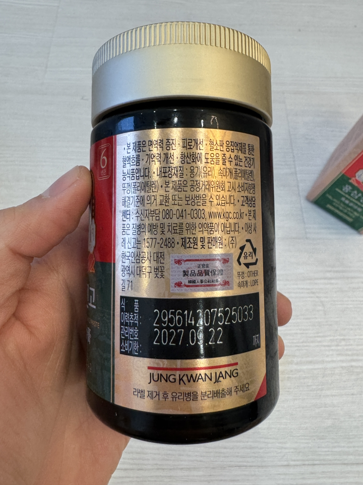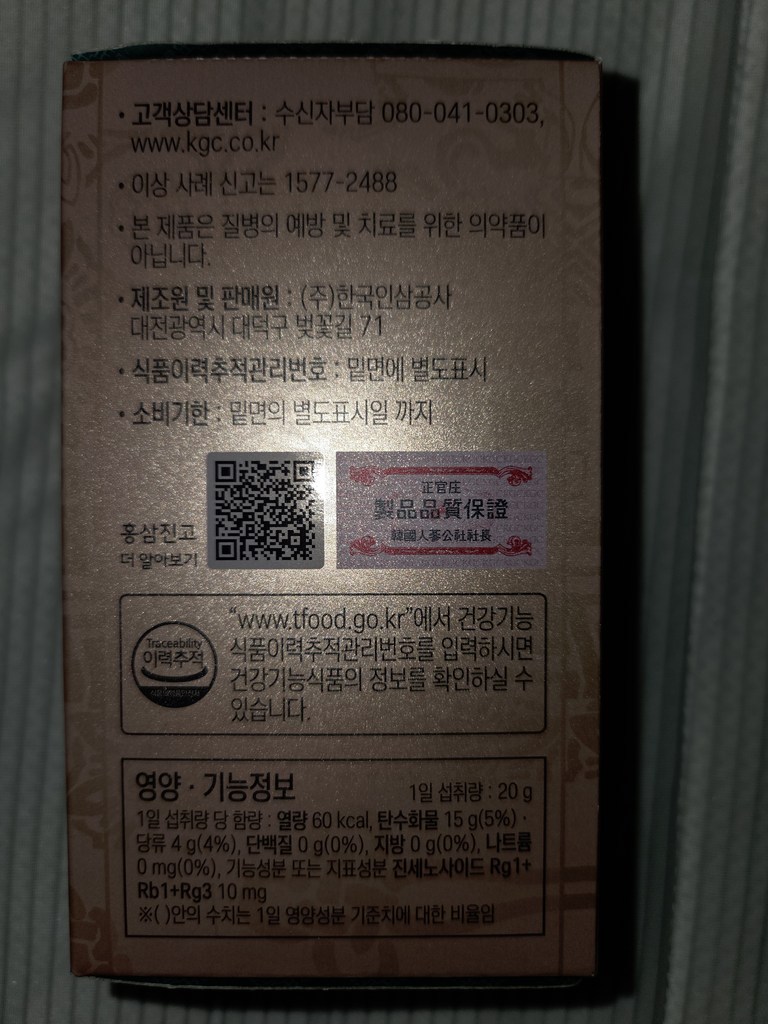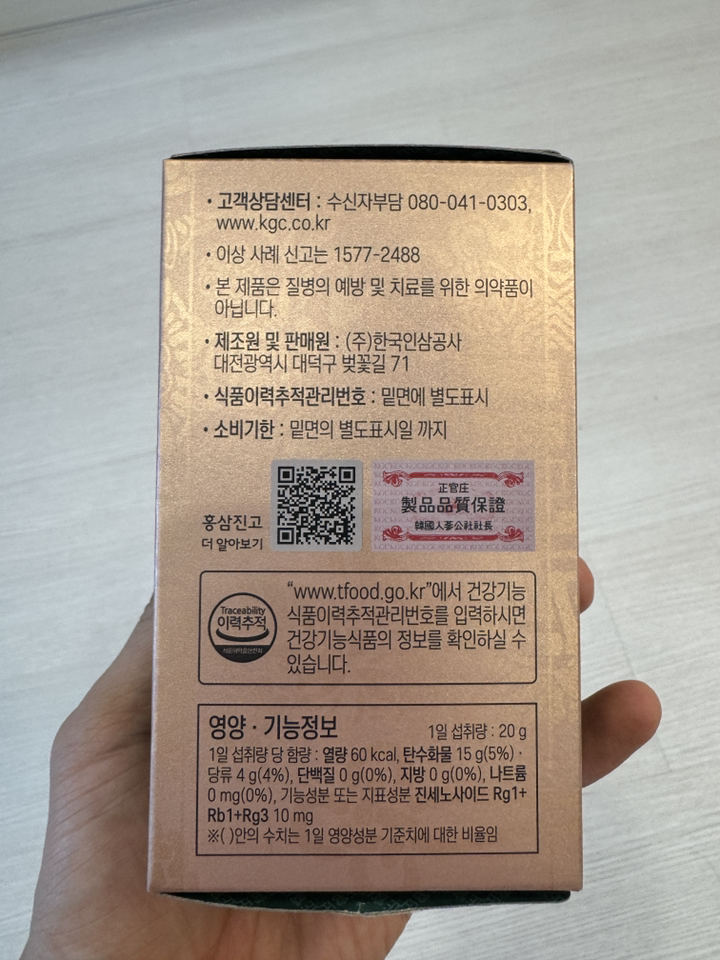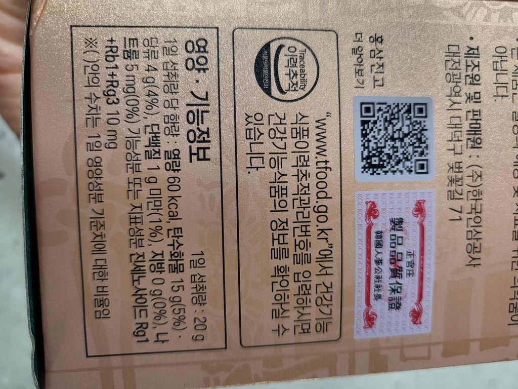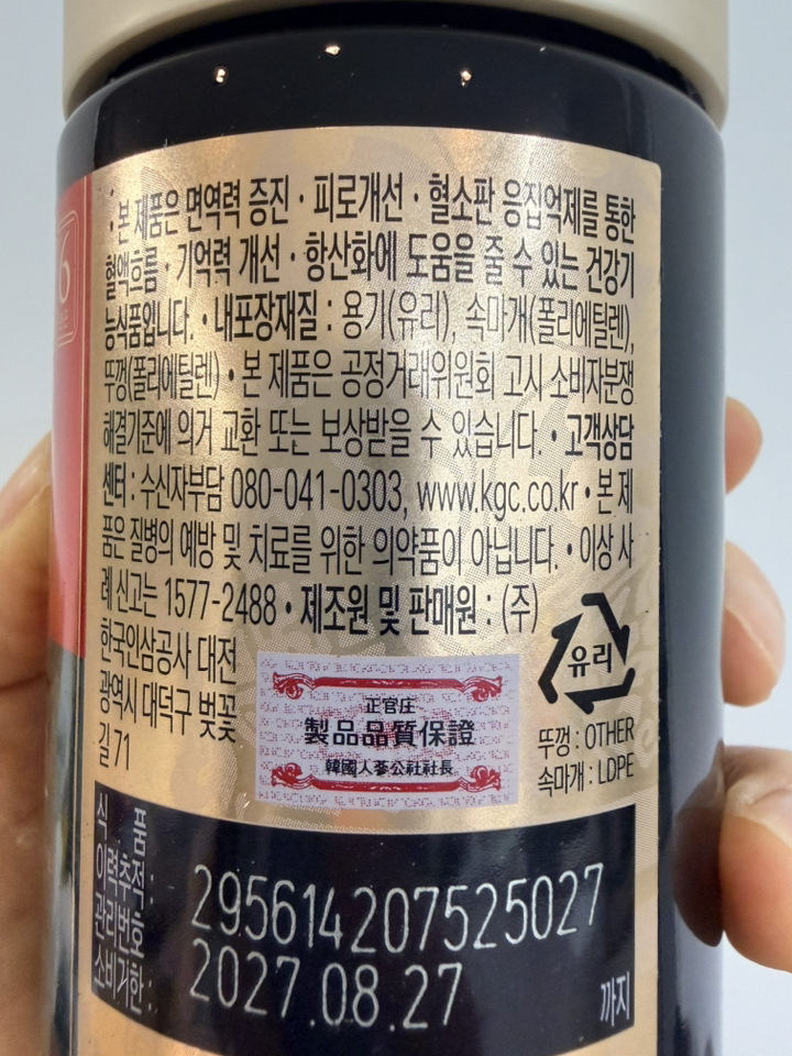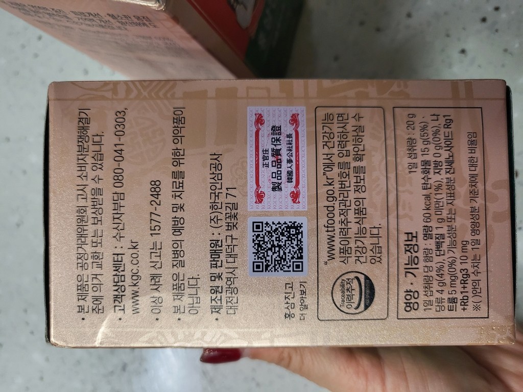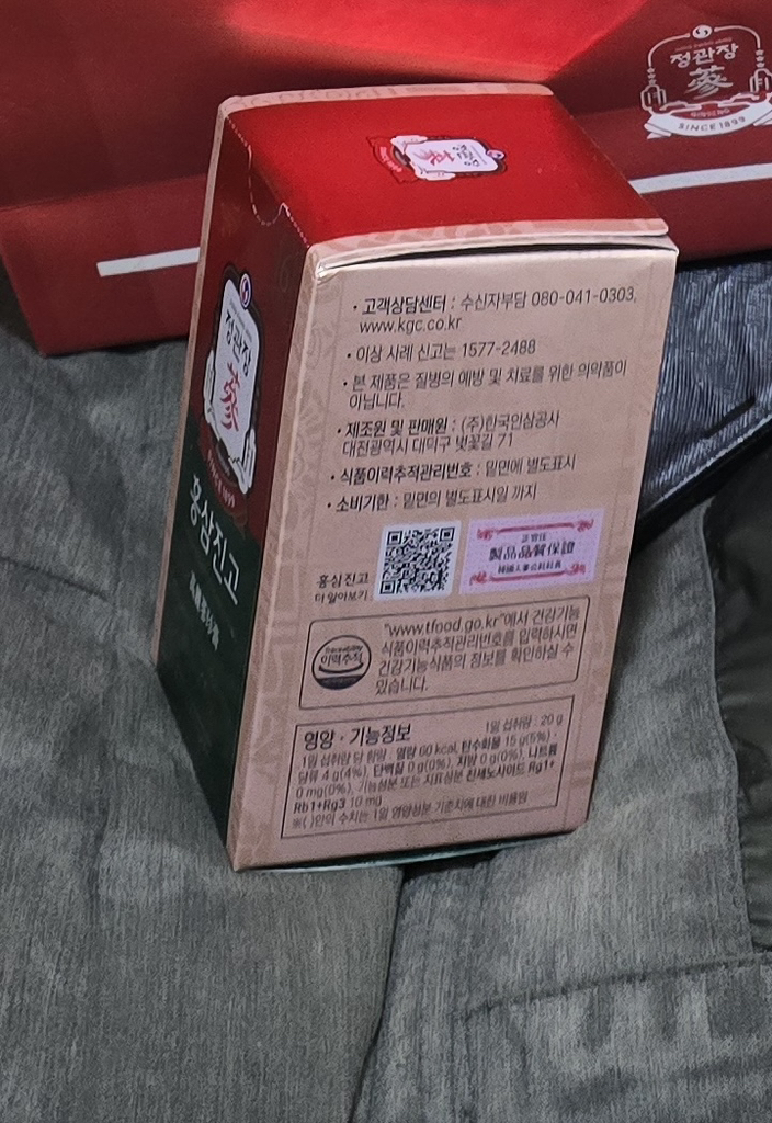 기능·표시: 제품 라벨에 건강기능식품 표기가 보이며, 정관장 제품 특성상 제조·위생 관리가 비교적 잘된 편.