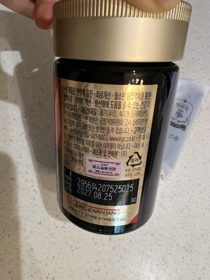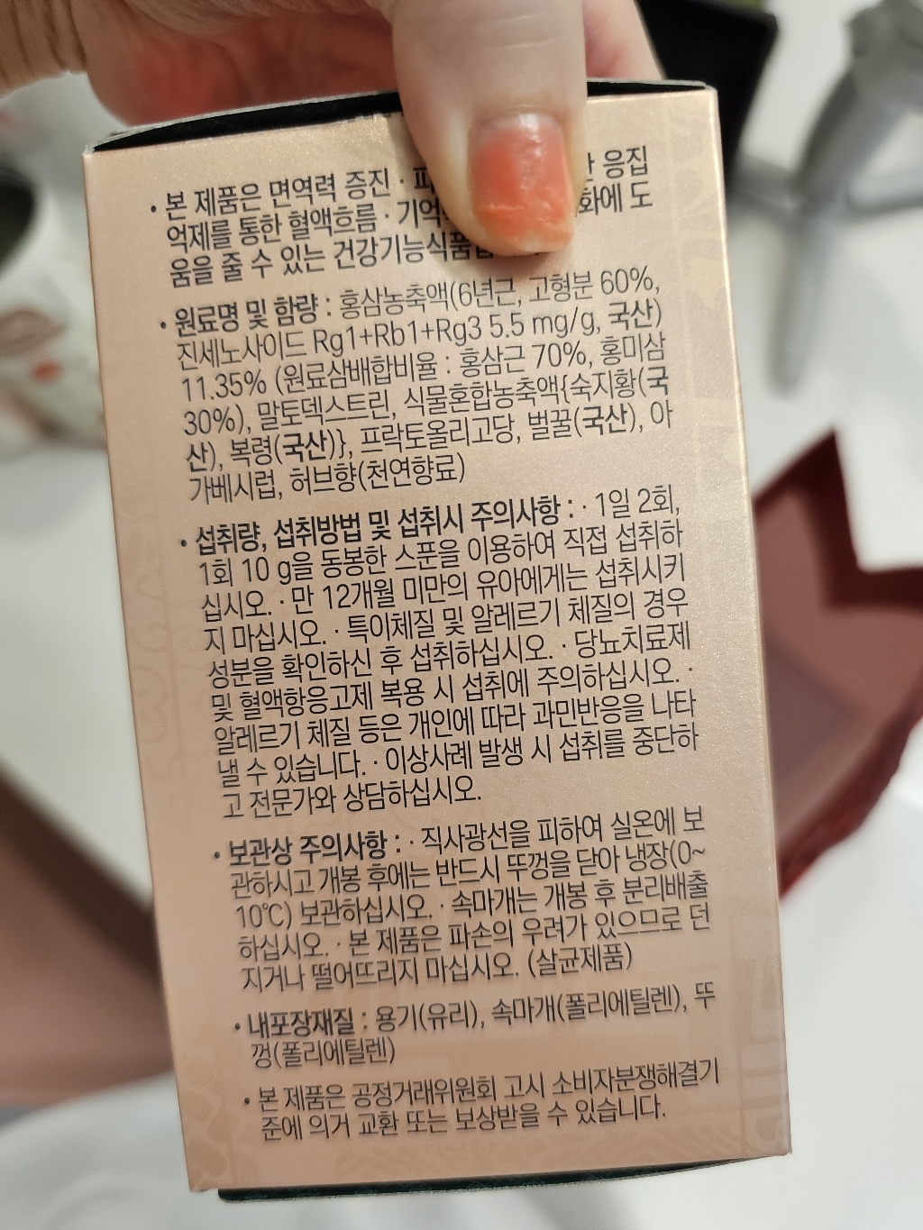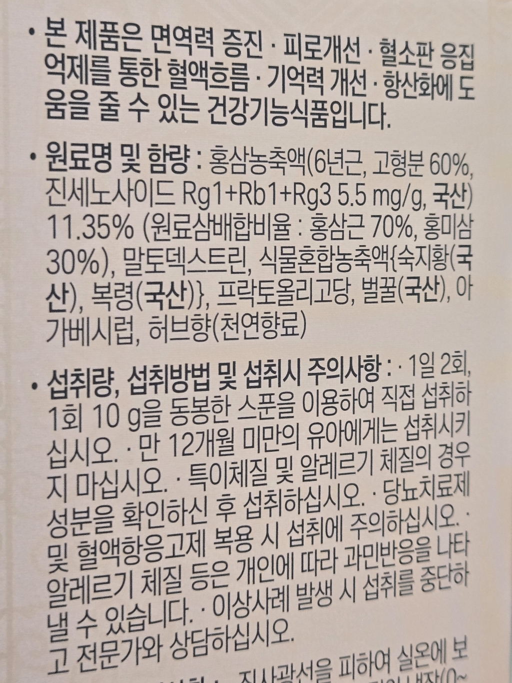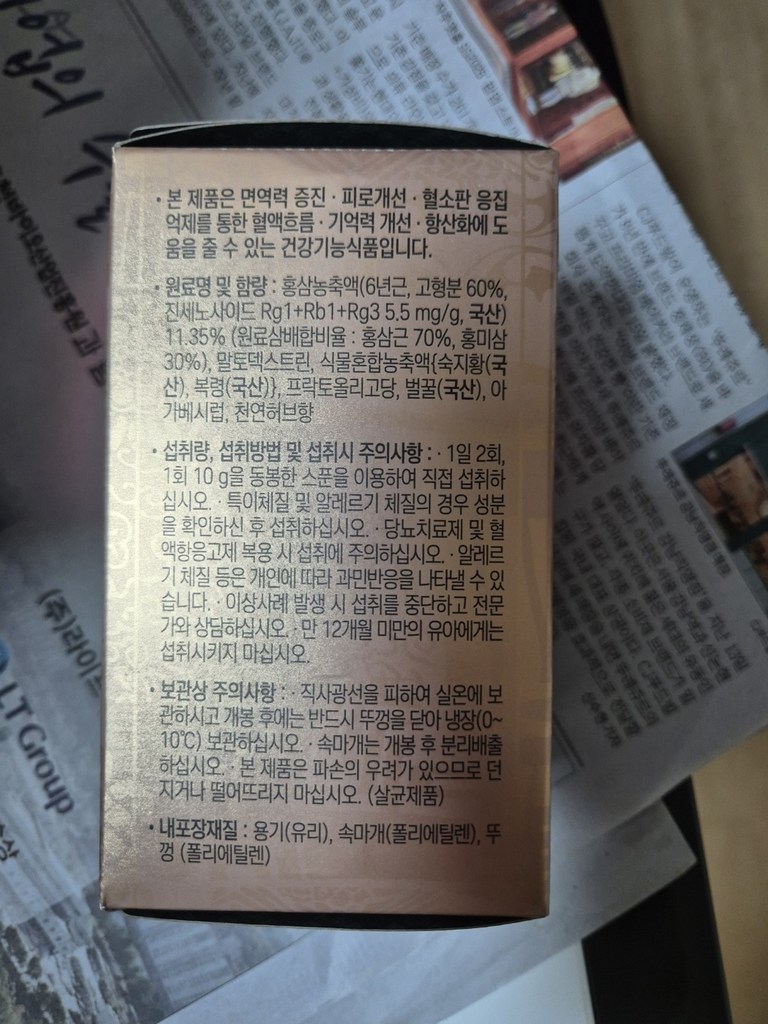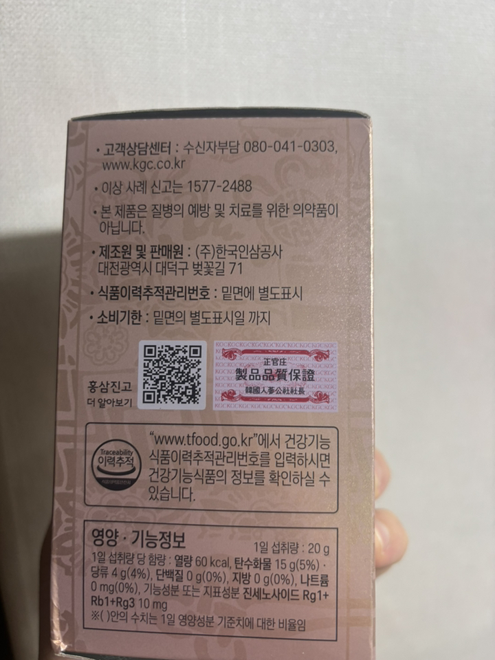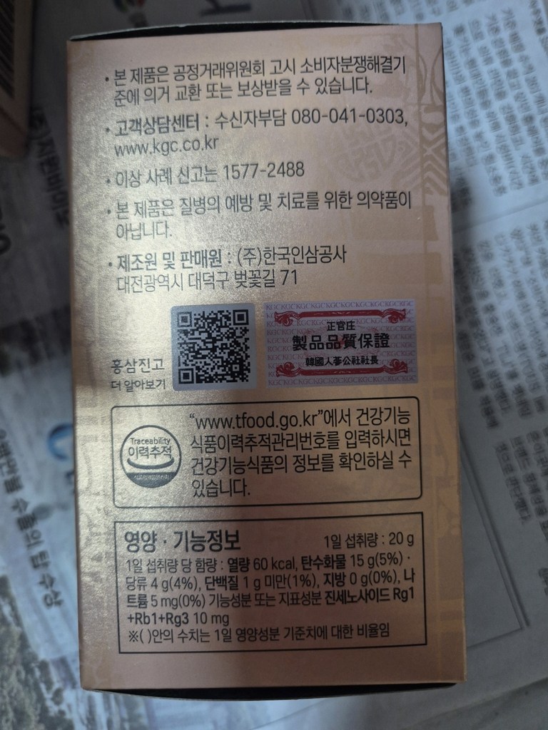 기능·표시: 제품 라벨에 건강기능식품 표기가 보이며, 정관장 제품 특성상 제조·위생 관리가 비교적 잘된 편.