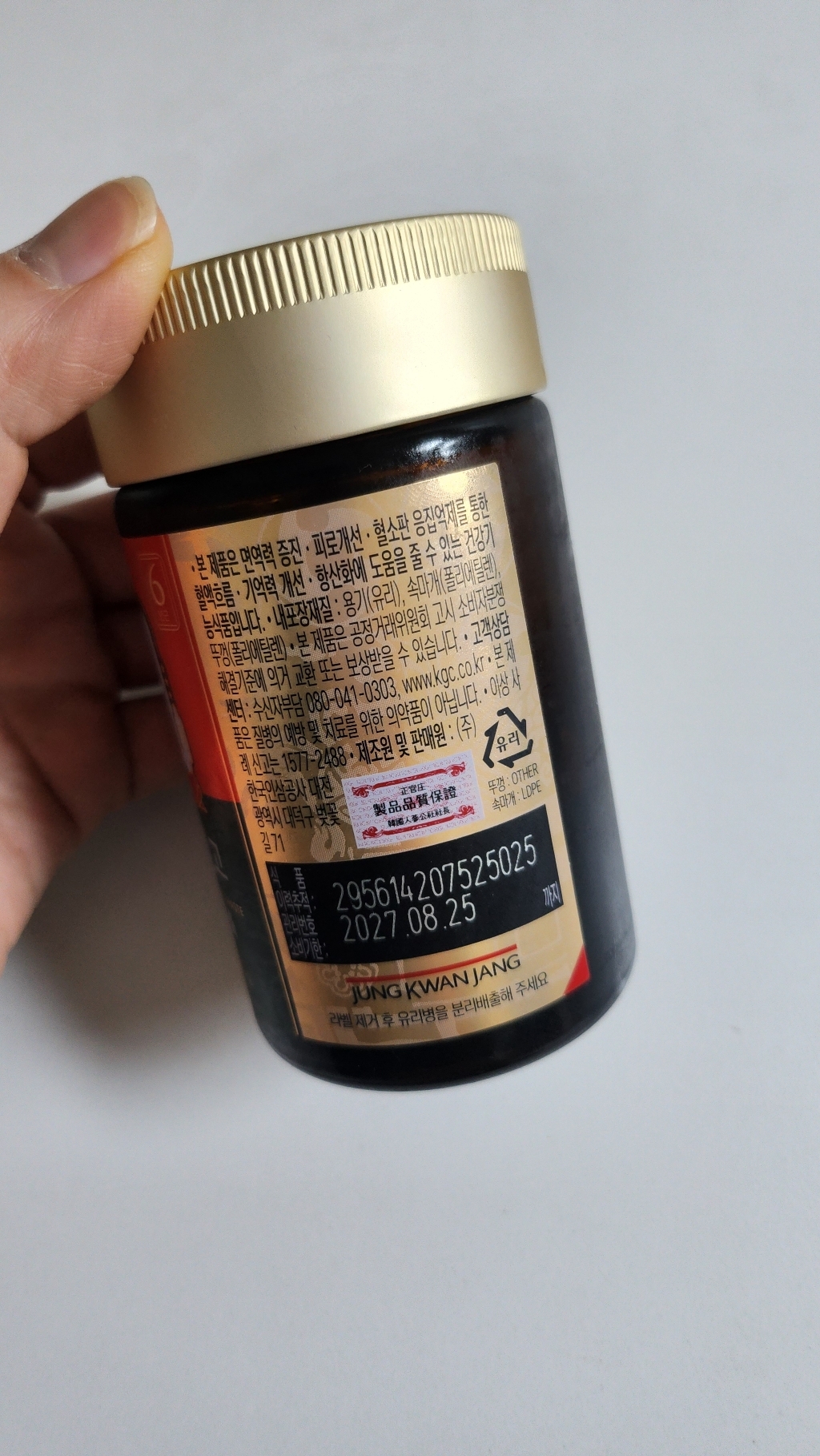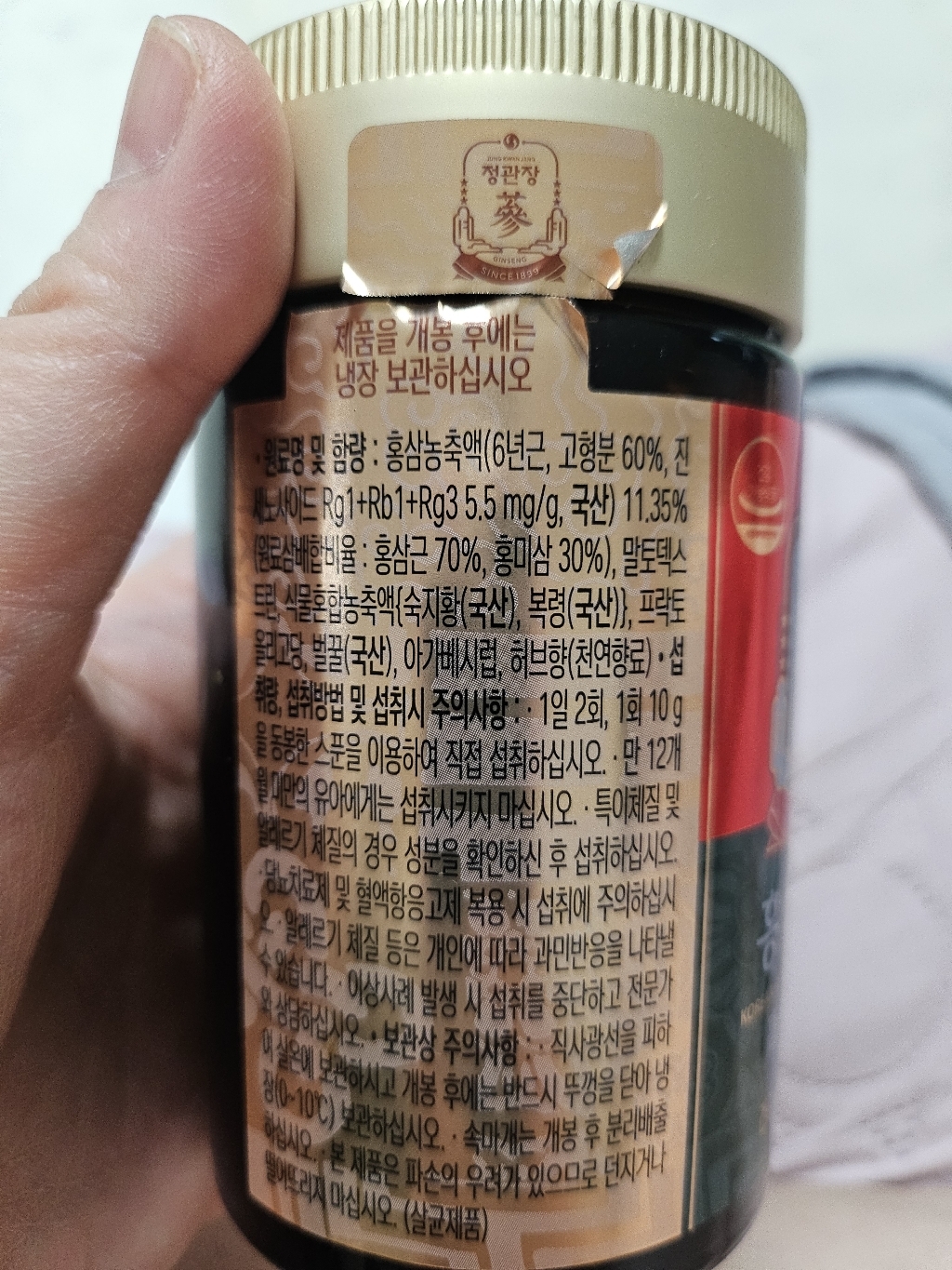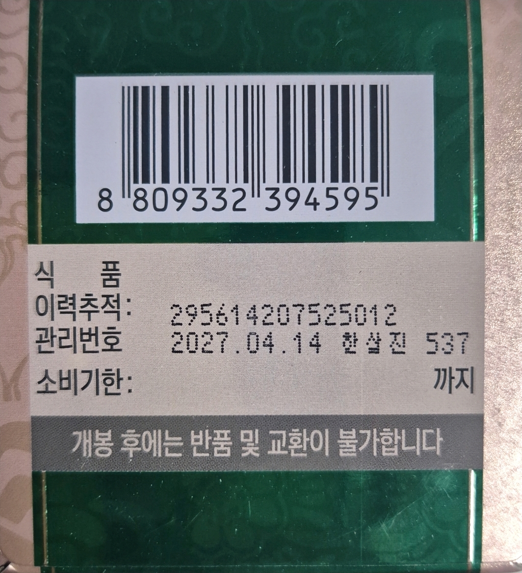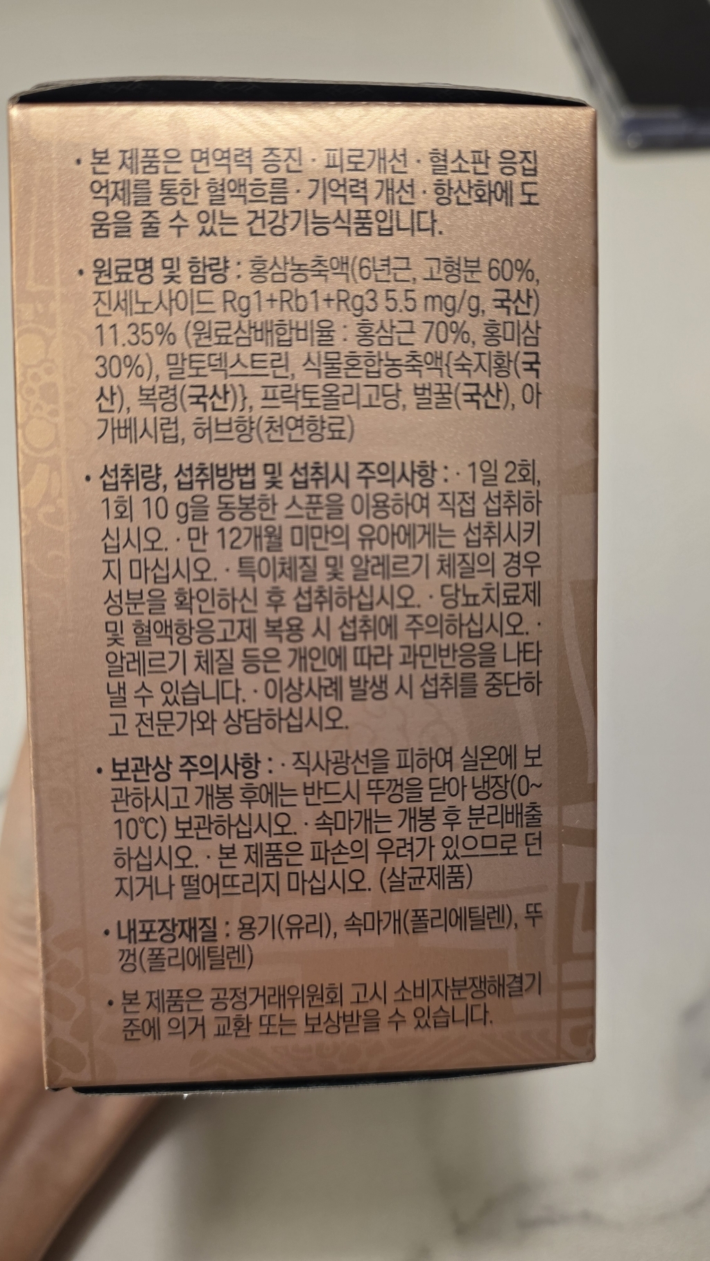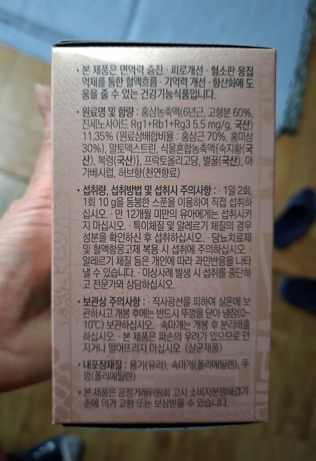 기능·표시: 제품 라벨에 건강기능식품 표기가 보이며, 정관장 제품 특성상 제조·위생 관리가 비교적 잘된 편.