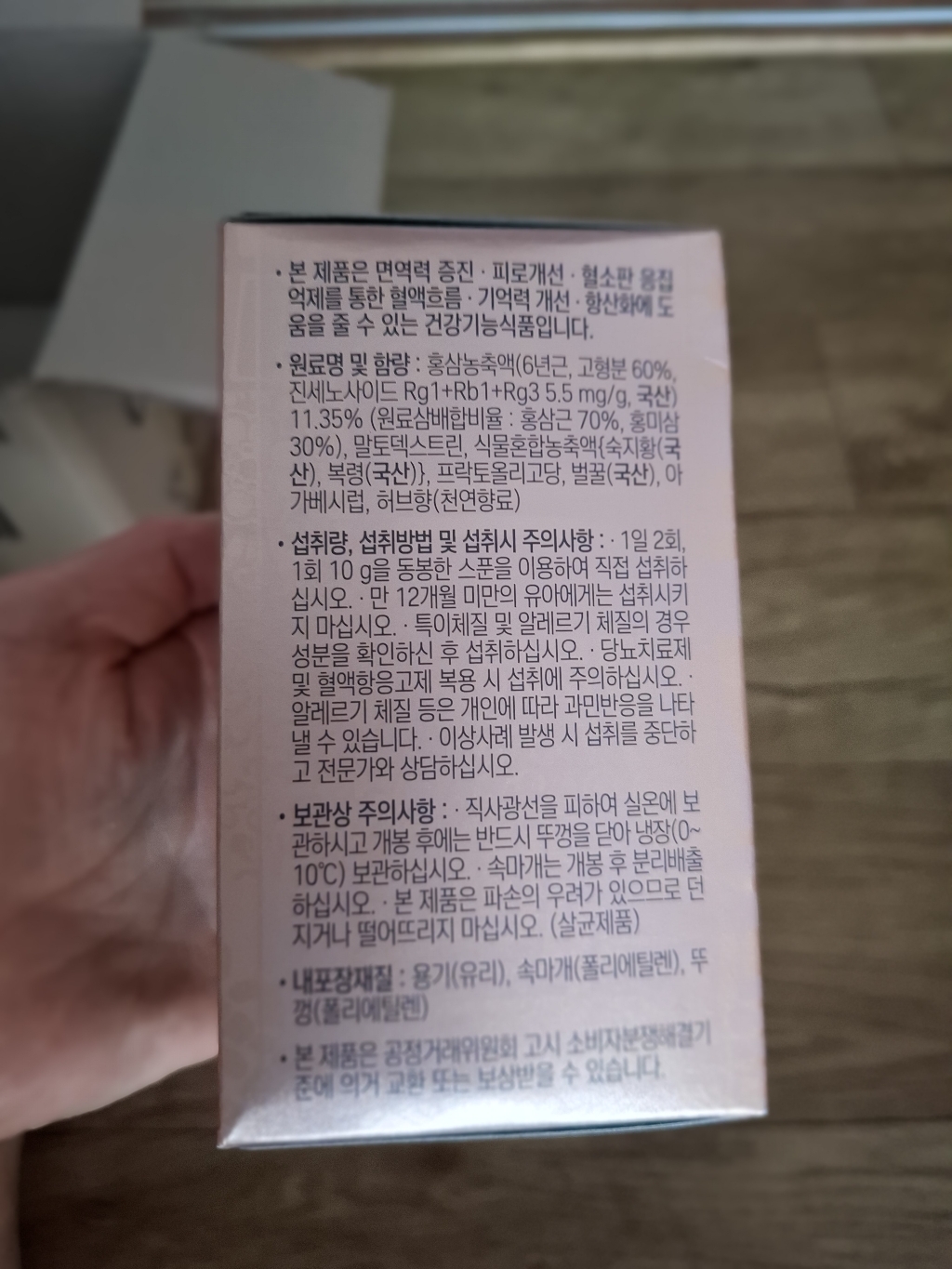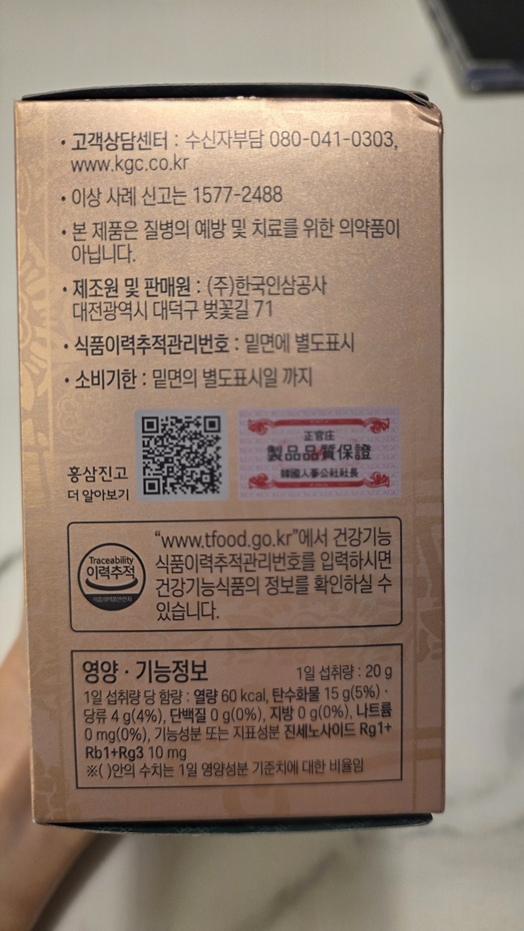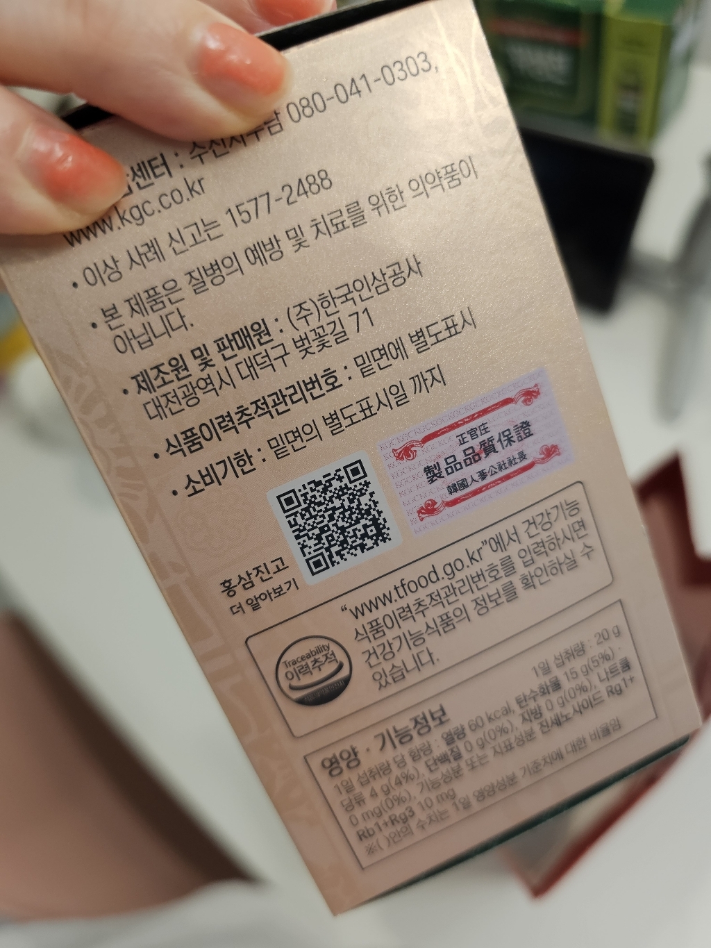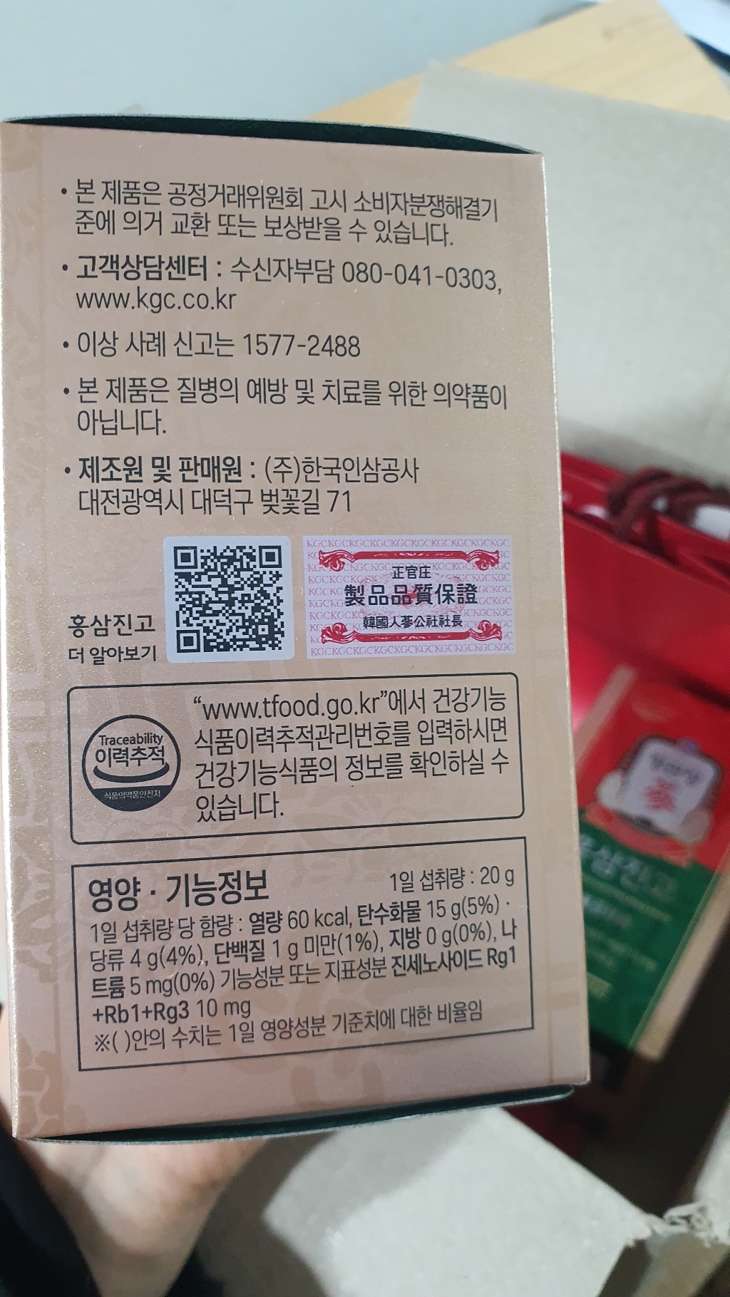 기능·표시: 제품 라벨에 건강기능식품 표기가 보이며, 정관장 제품 특성상 제조·위생 관리가 비교적 잘된 편.