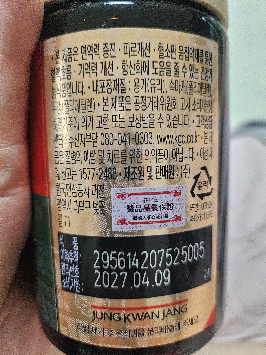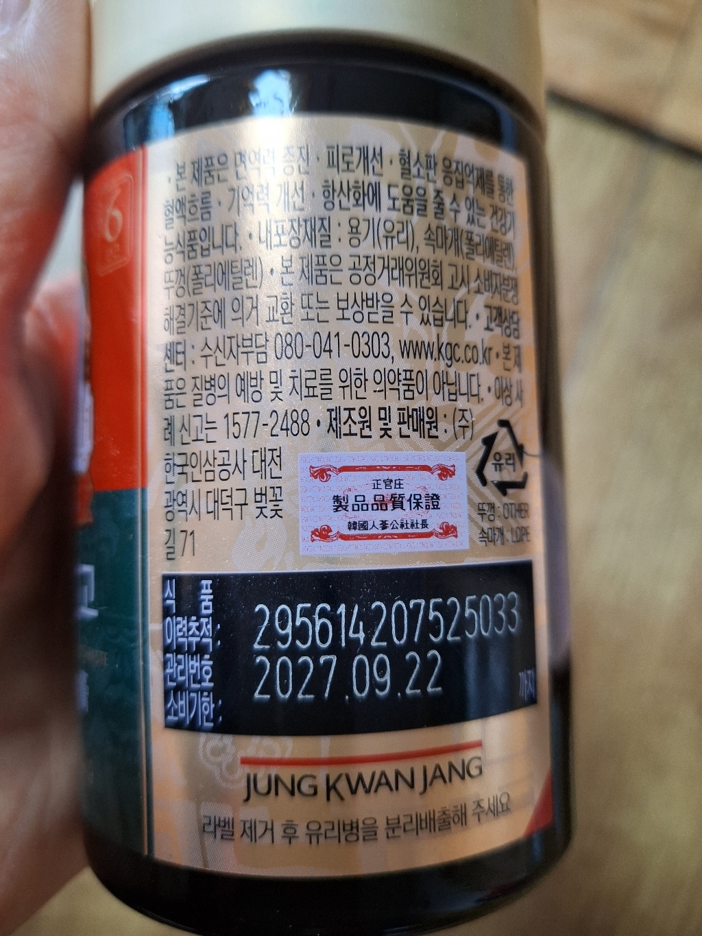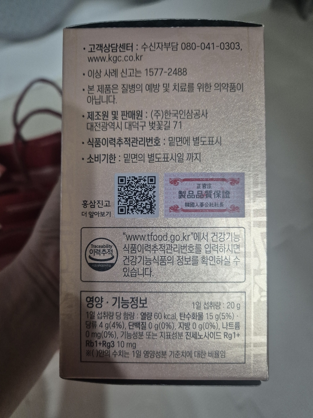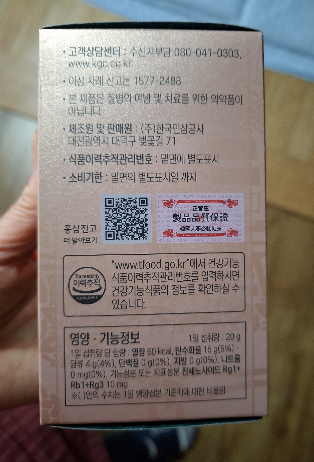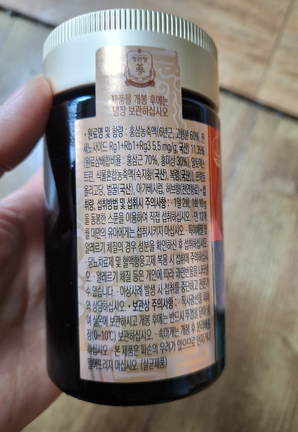 기능·표시: 제품 라벨에 건강기능식품 표기가 보이며, 정관장 제품 특성상 제조·위생 관리가 비교적 잘된 편.