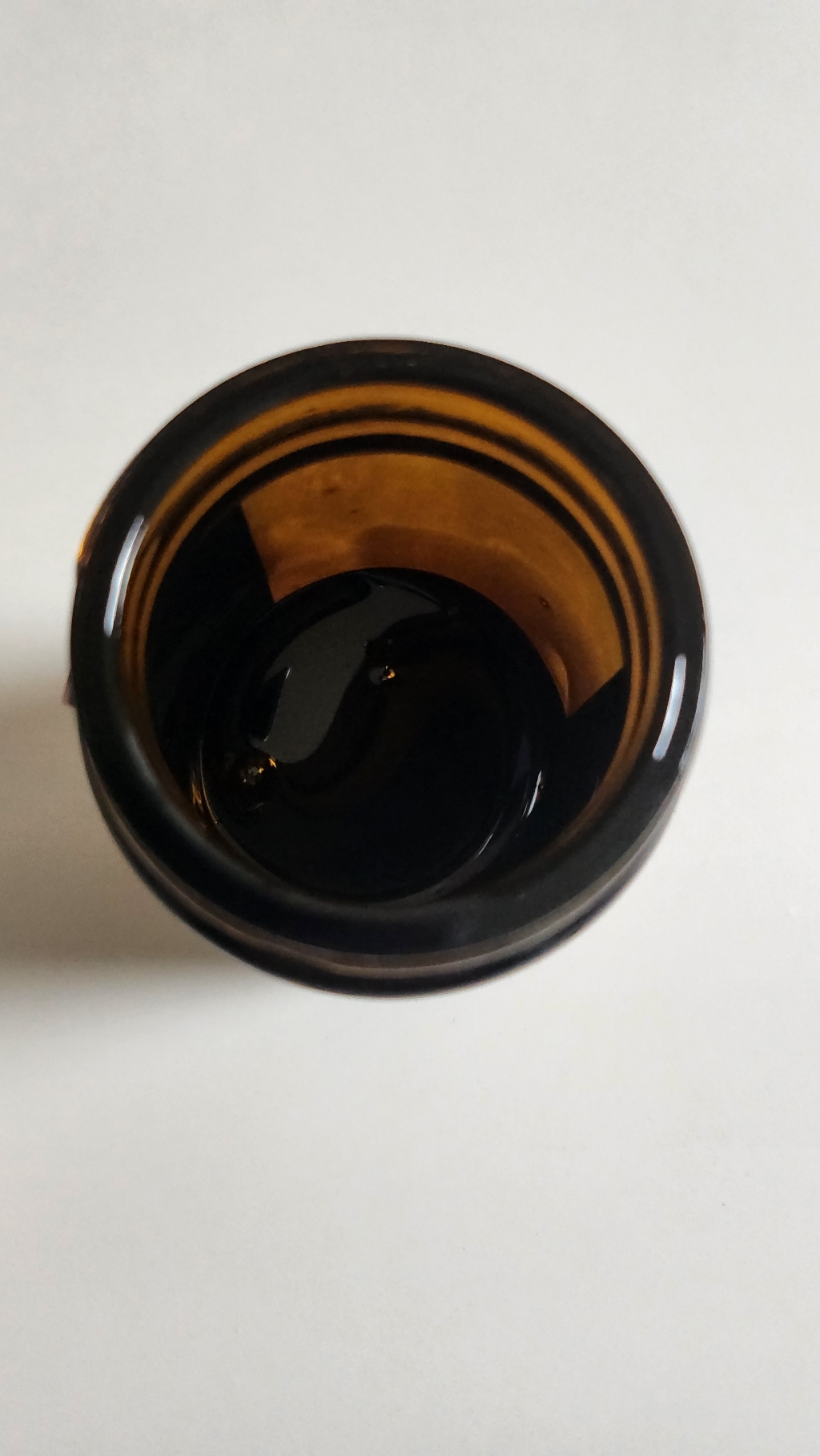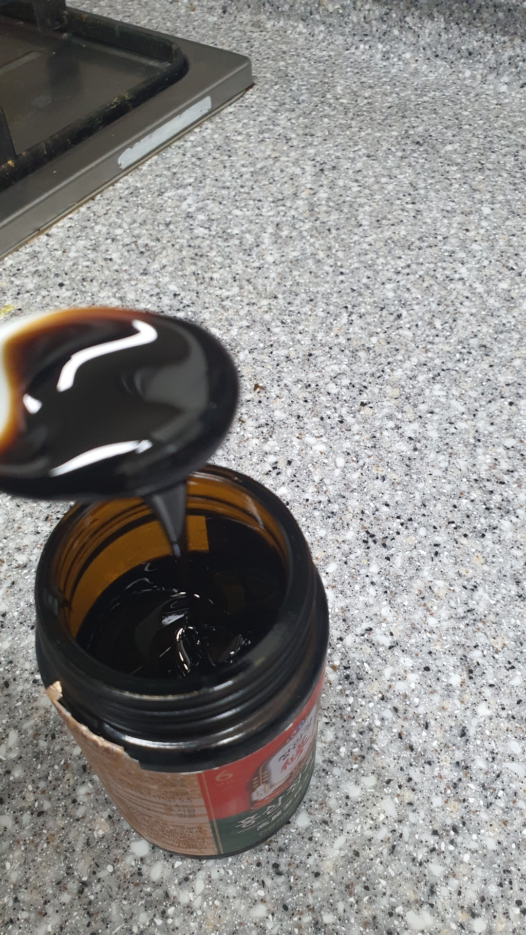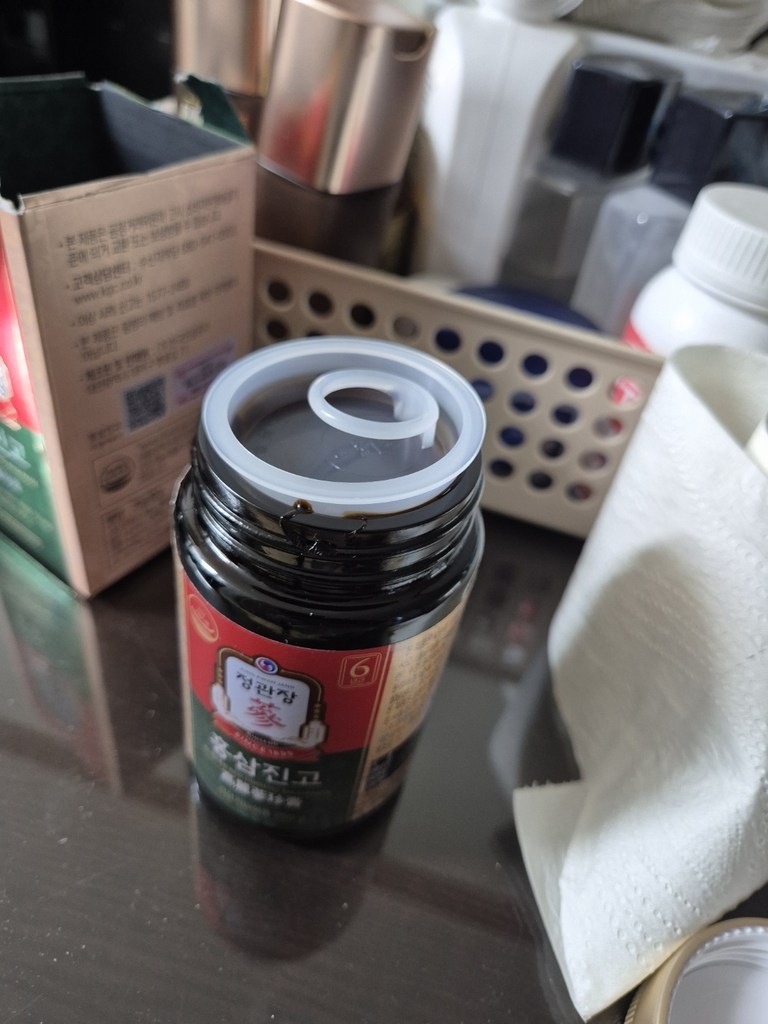 홍삼진고는 유리병에 담겨 있어요. 뚜껑을 열면 안에 흰색 속마개가 들어있고 속마개를 열면 흑갈색의 걸쭉한 홍삼진고가 나옵니다.