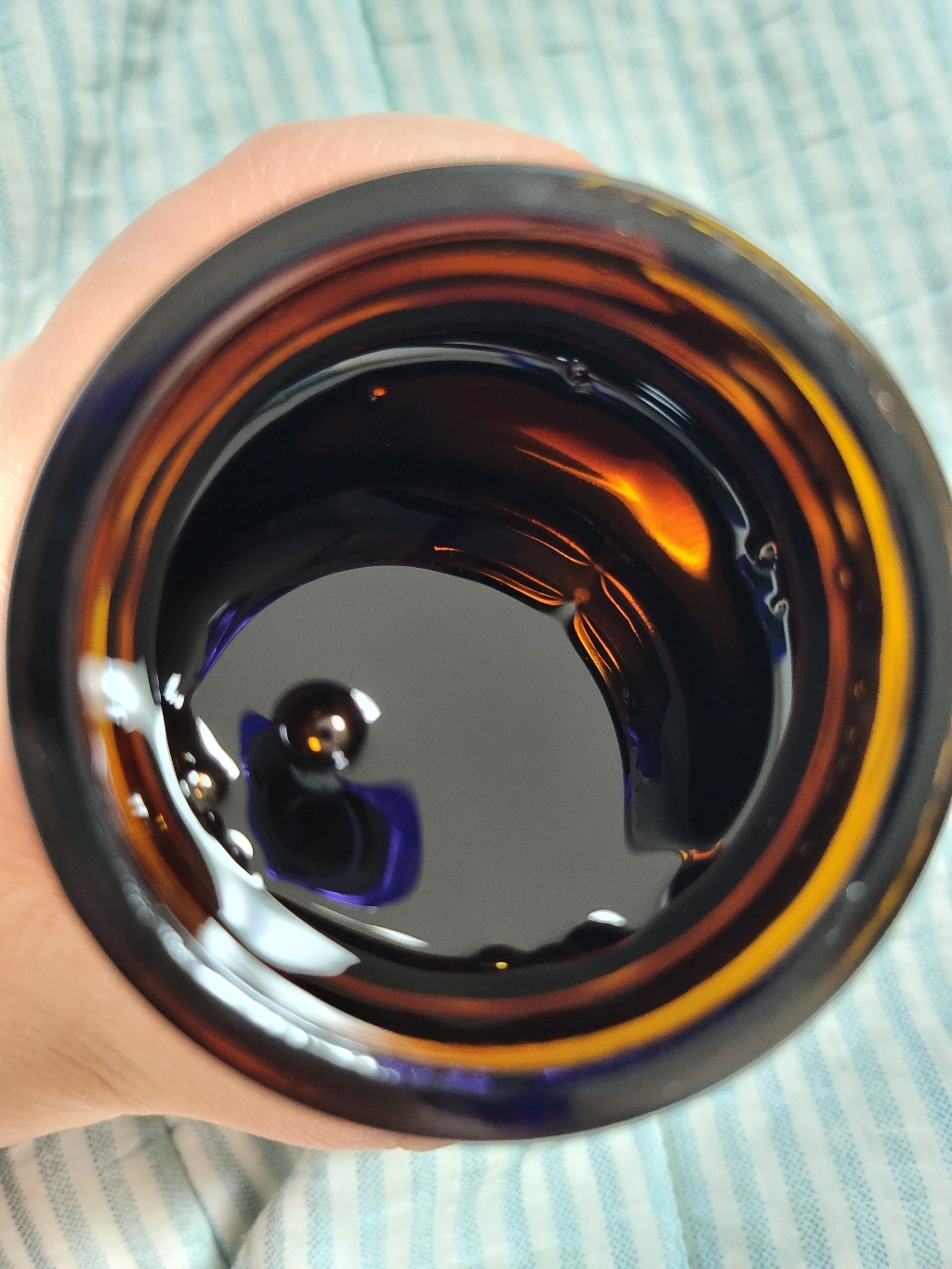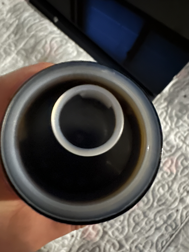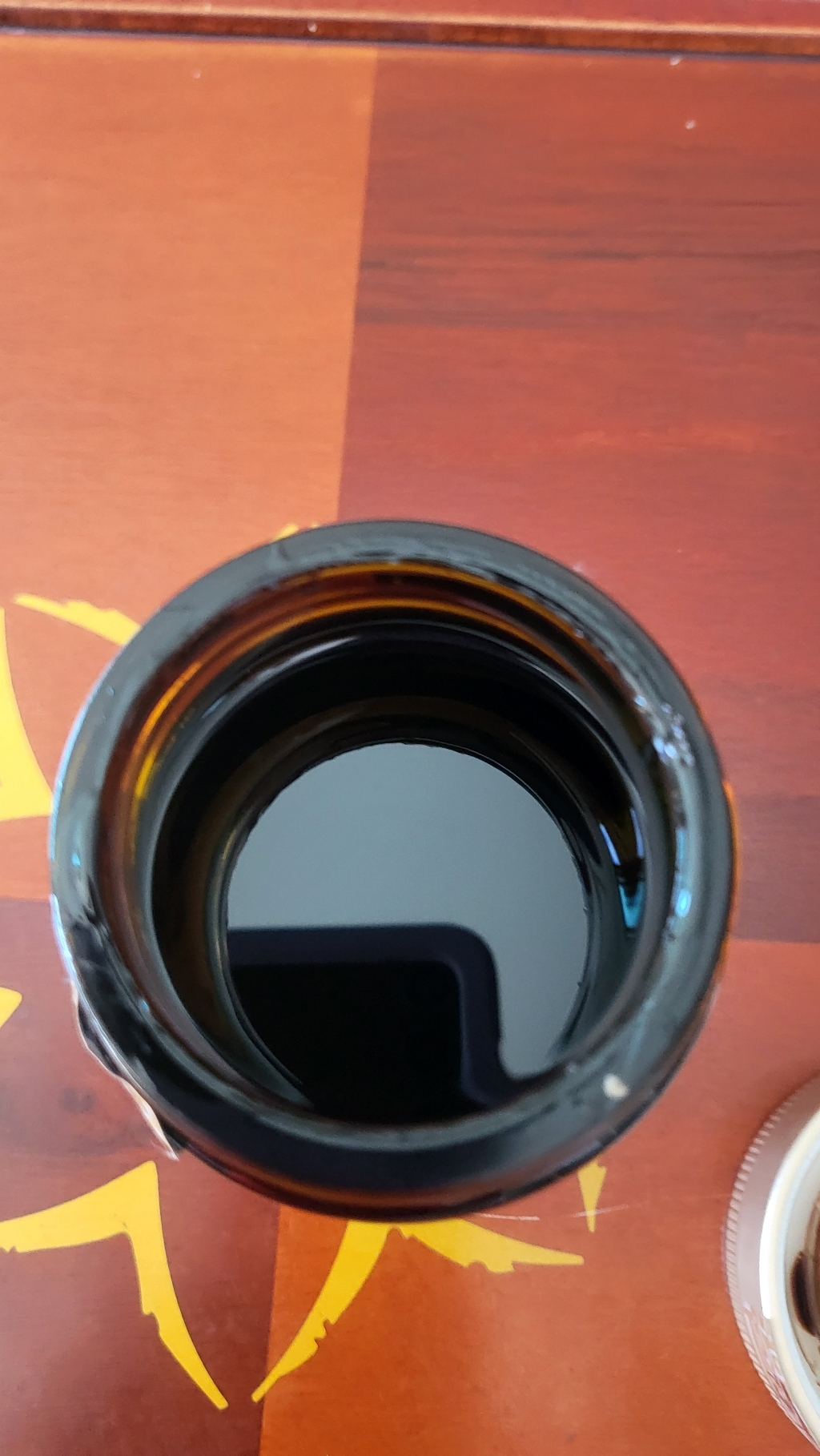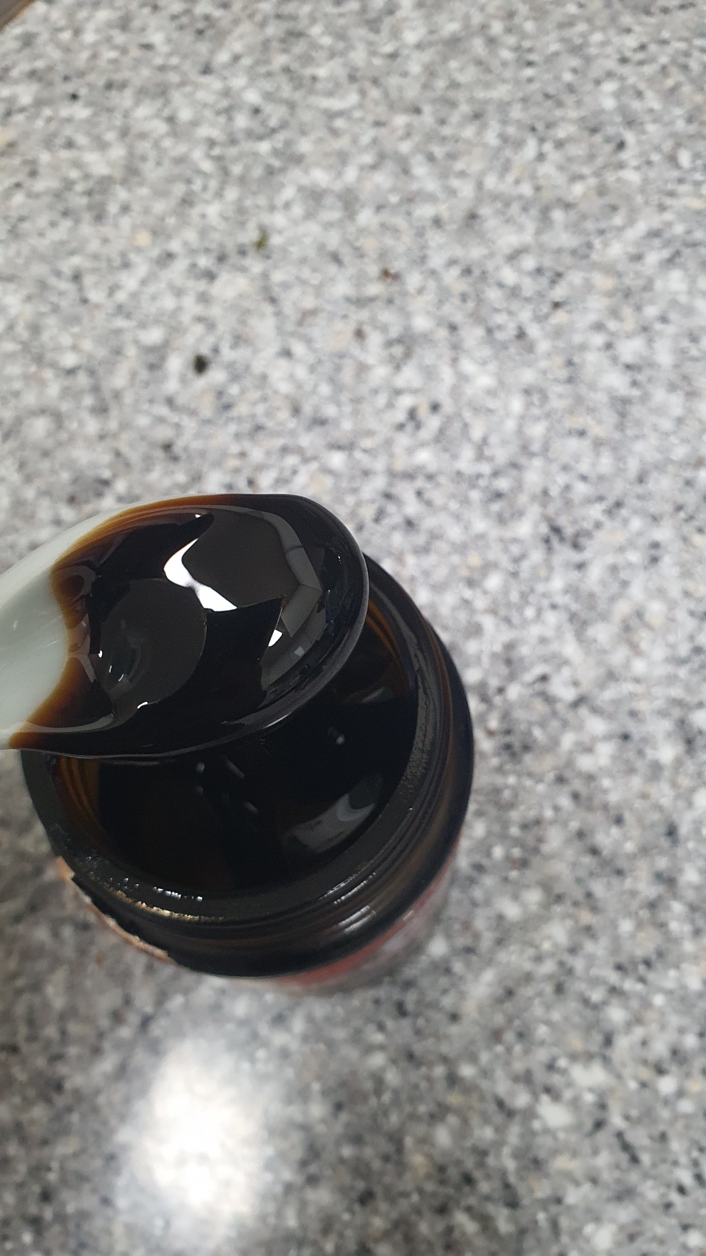 홍삼진고는 유리병에 담겨 있어요. 뚜껑을 열면 안에 흰색 속마개가 들어있고 속마개를 열면 흑갈색의 걸쭉한 홍삼진고가 나옵니다.