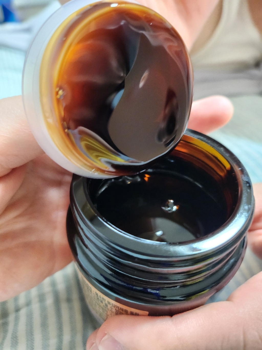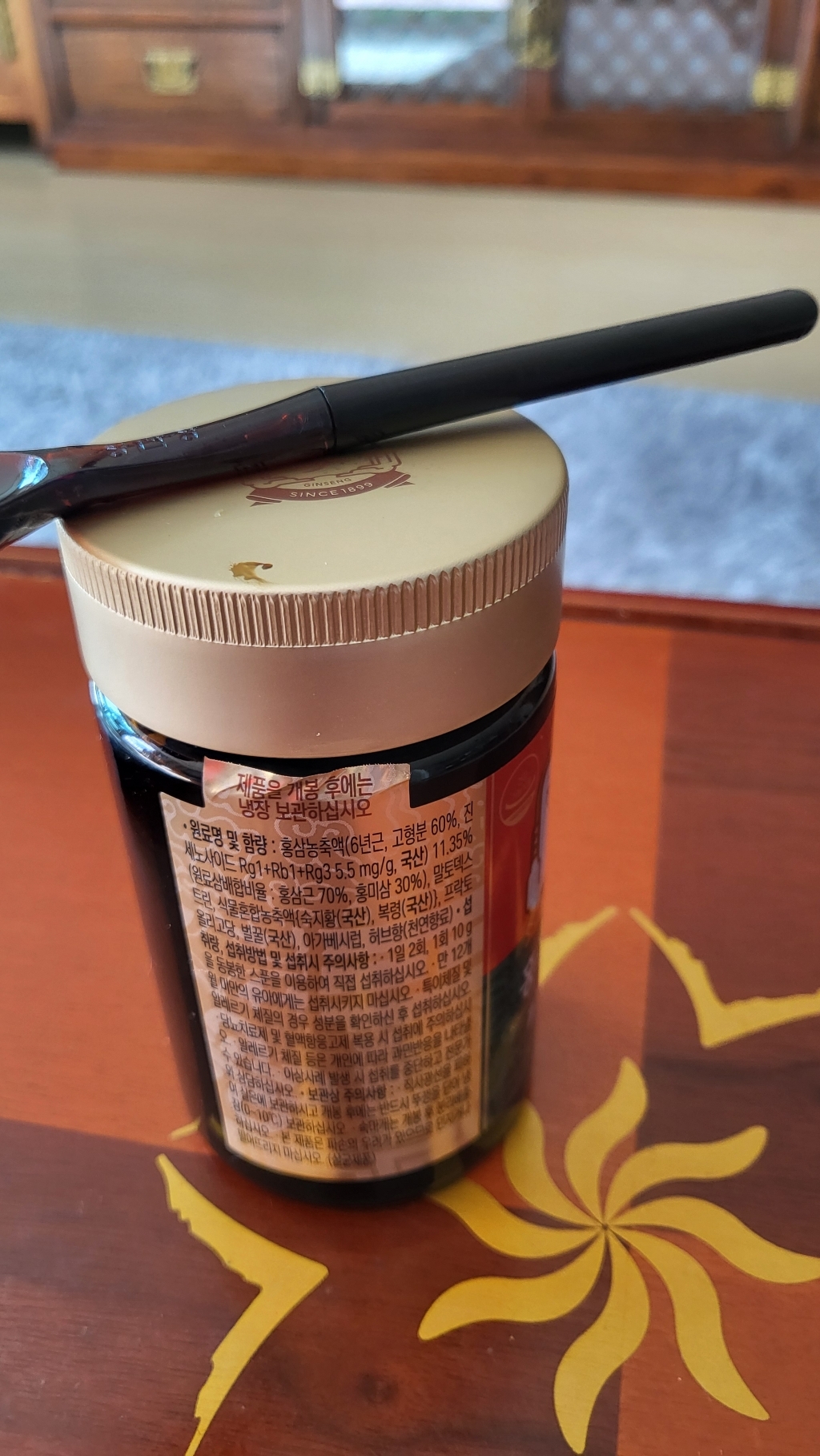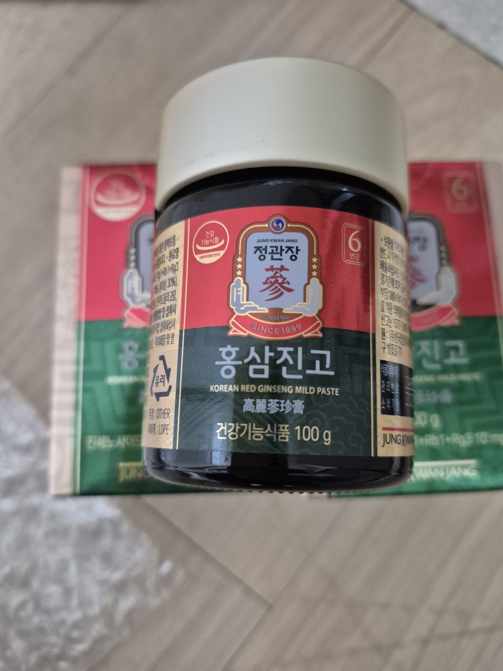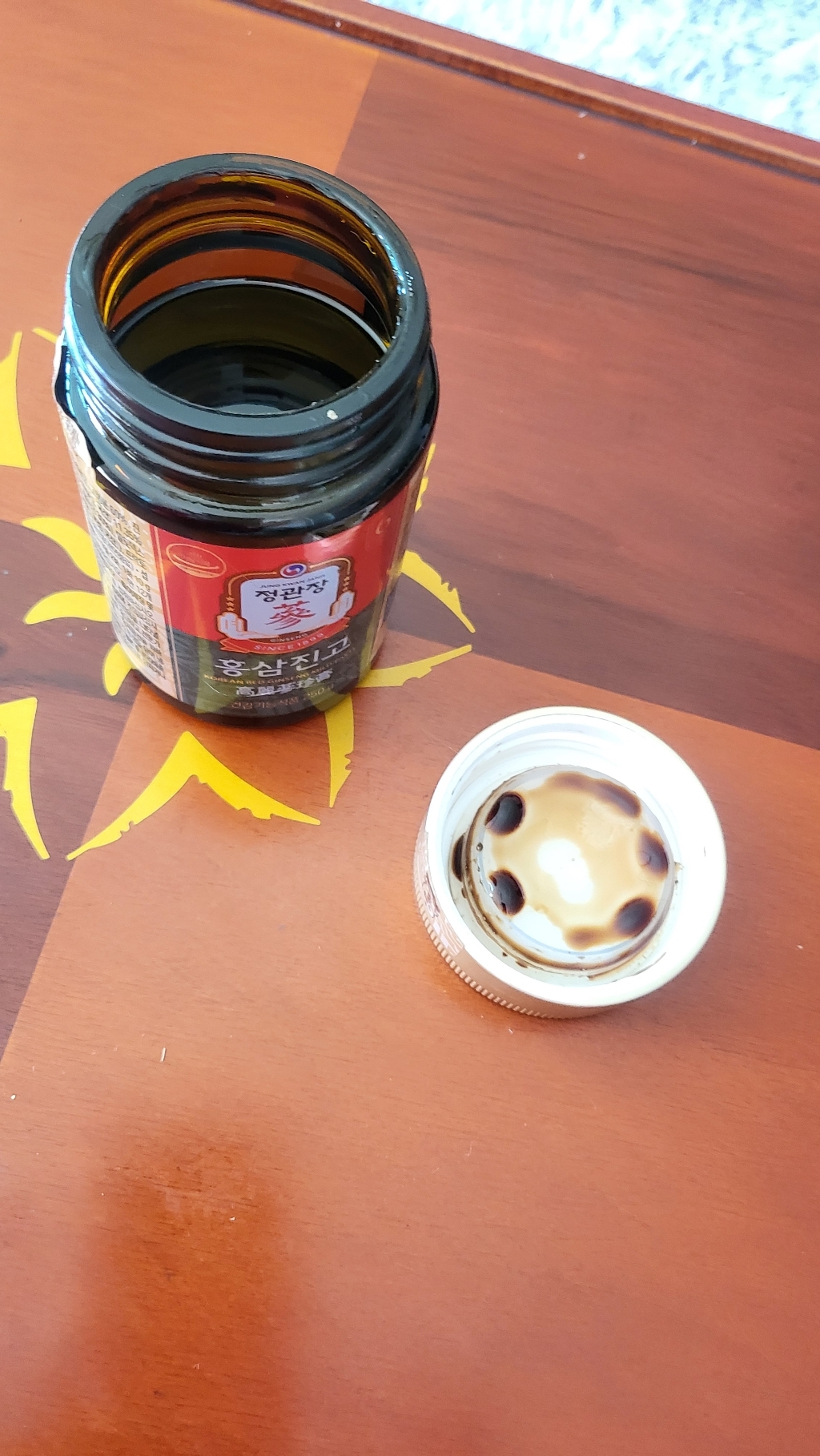 뚜껑을 열면 플라스틱으로 속뚜껑이 덮여있는데 홍삼진고가 약간끈적거리는 형태이다보니