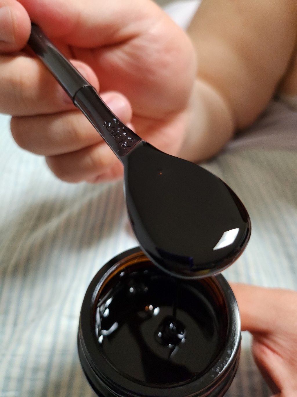 제형은 묽지 않고 진득한 페이스트입니다. 작은 플라스틱·금속 숟가락으로 떠 먹기 좋고, 따뜻한 물이나 꿀물에 타면 농도가 적당히 풀려서 마시기 편합니다. 저는 아침에 티스푼 1/2~1스푼을 따뜻한 물에 풀어 먹거나, 요거트에 살짝 섞어 먹었습니다. 바로 떠먹으면 진한 맛을 선호하는 분께 좋고, 약하게 먹고 싶으면 음료에 타서 드세요.