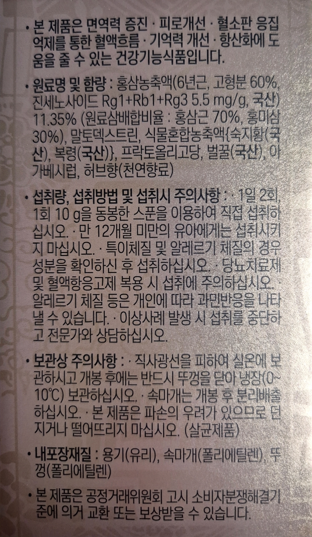 원료 표기: 6년근 표기 및 제품 라벨에 진세노사이드(홍삼 사포닌)