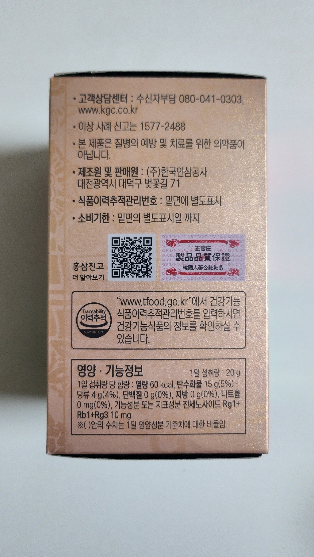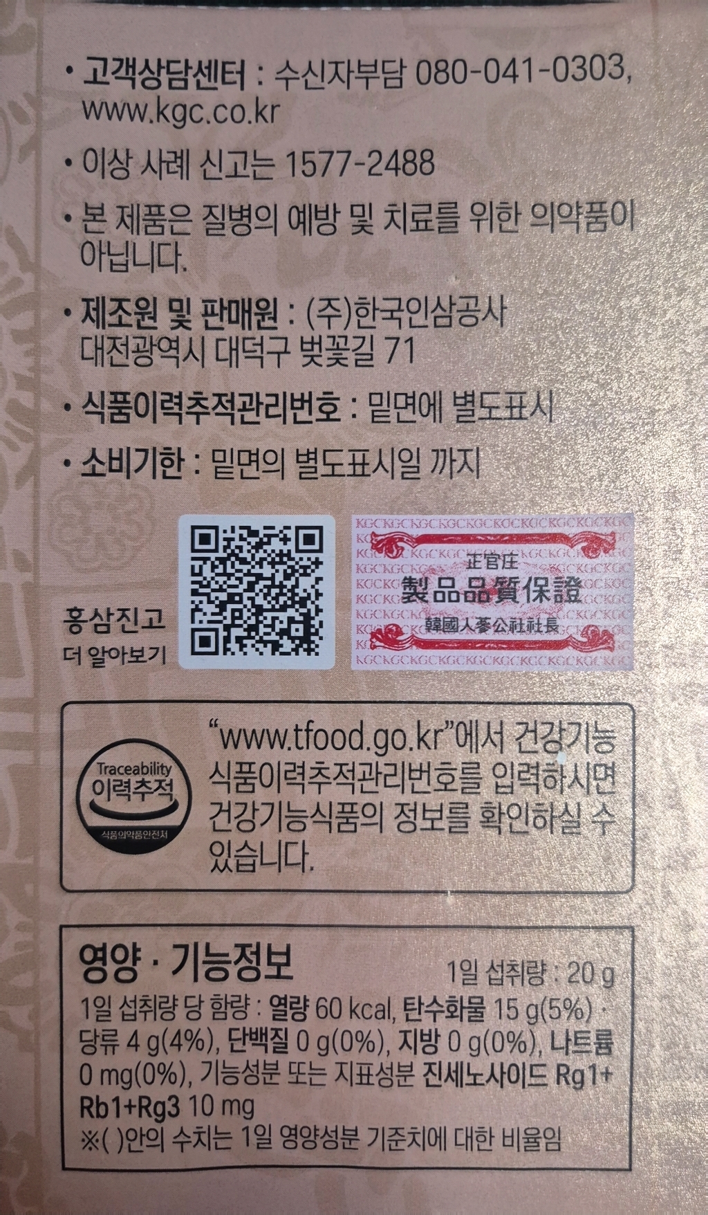 1일 섭취량 당 함량 : 열량 60kcal, 탄수화물 15g(5%).당류4g(4%),단백질1g미만(1%),지방 0g(0%),나트륨 5mg(0%) 기능성분 또는 지표성분 진세노사이드 Rg1+Rb1+Rg3 10mg