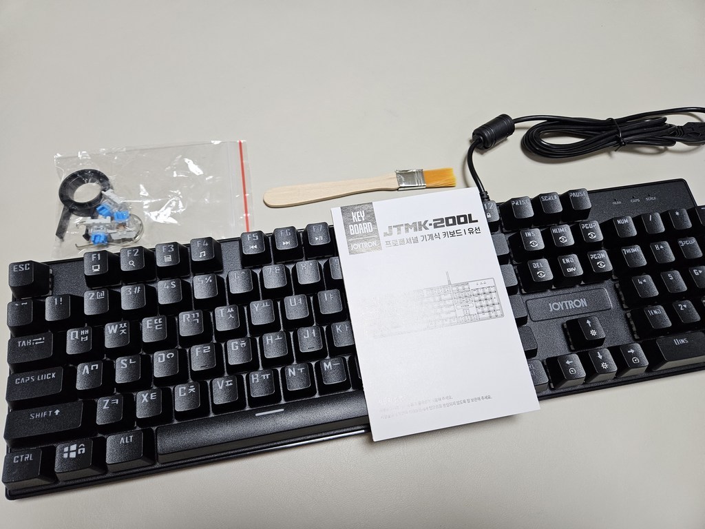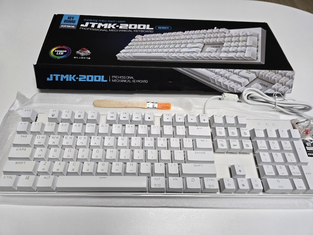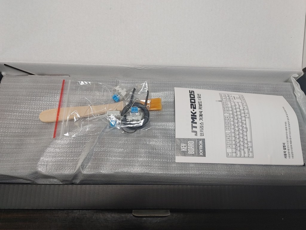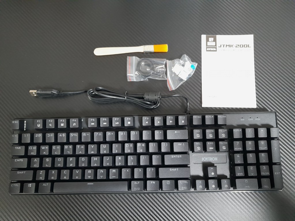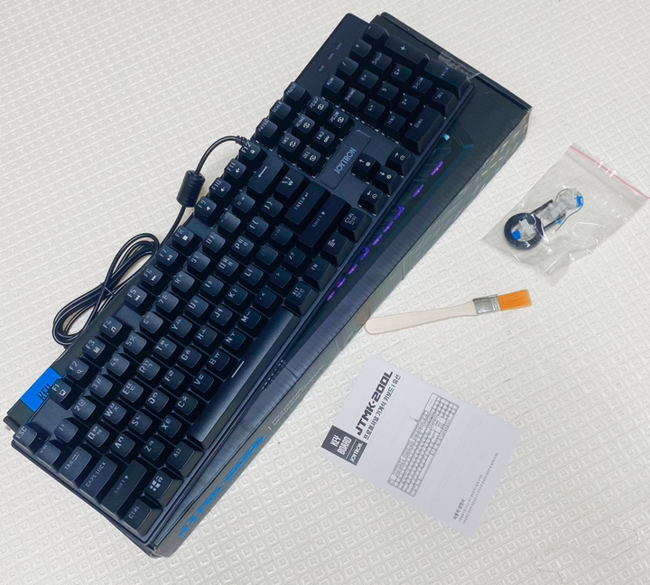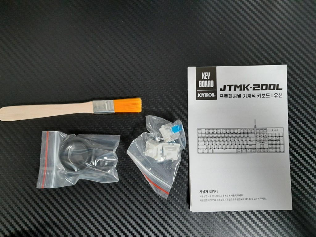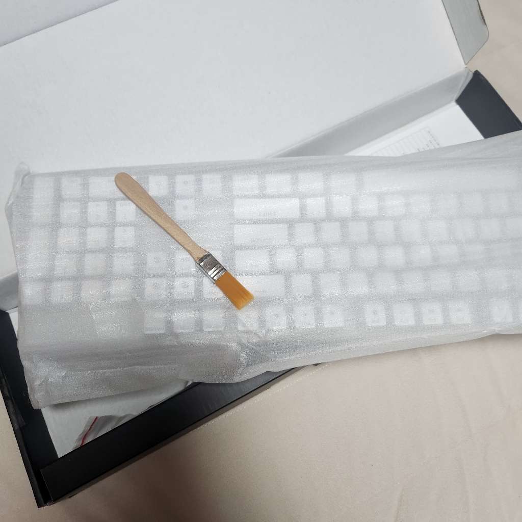 구성품 : 키보드 본체, 여분 스위치 3개, 키캡 리무버 1개, 스위치 리무버 1개, 청소 브러쉬 1개, 사용 설명서