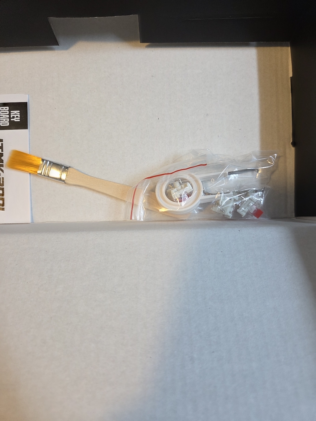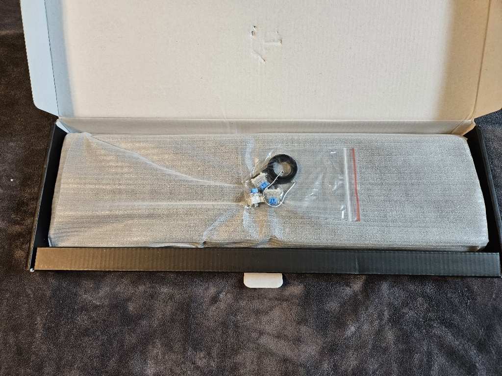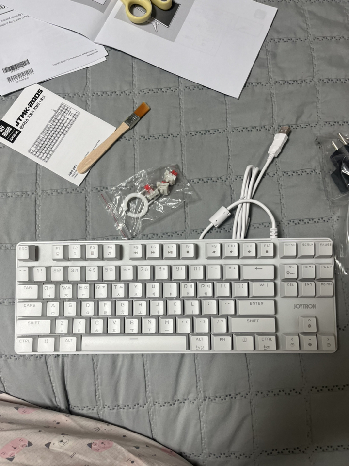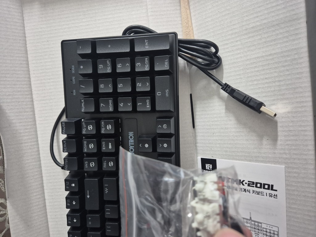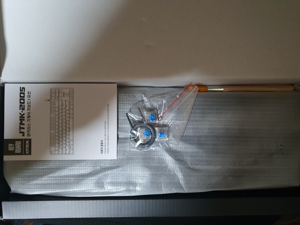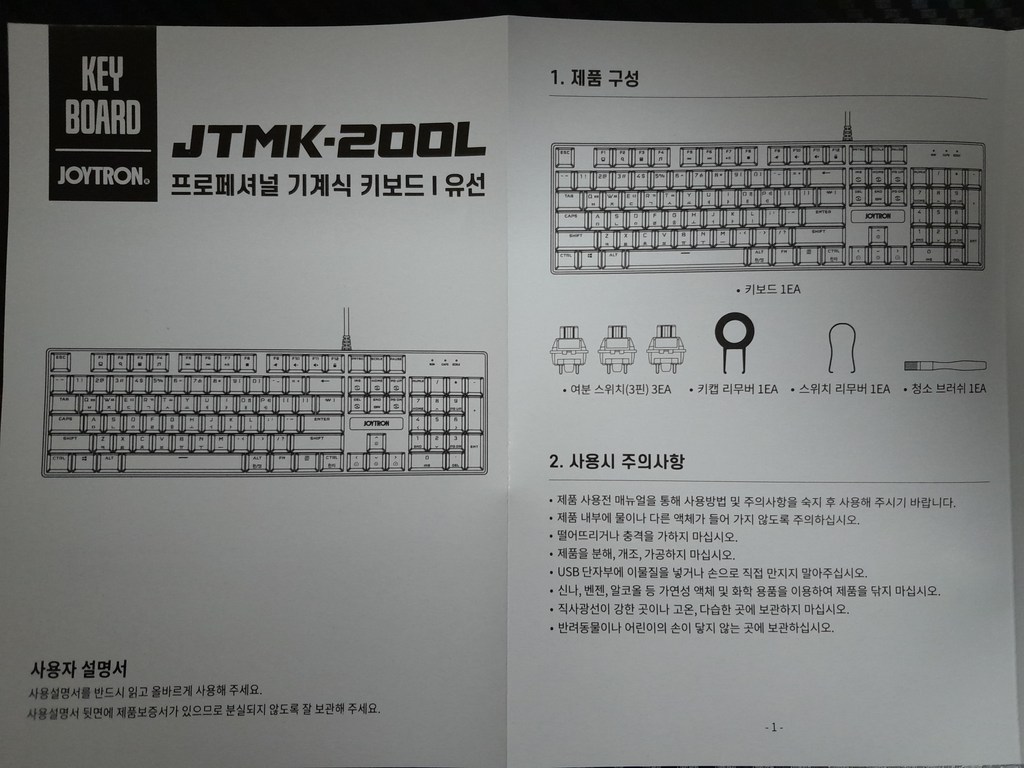 구성품 : 키보드 본체, 여분 스위치 3개, 키캡 리무버 1개, 스위치 리무버 1개, 청소 브러쉬 1개, 사용 설명서