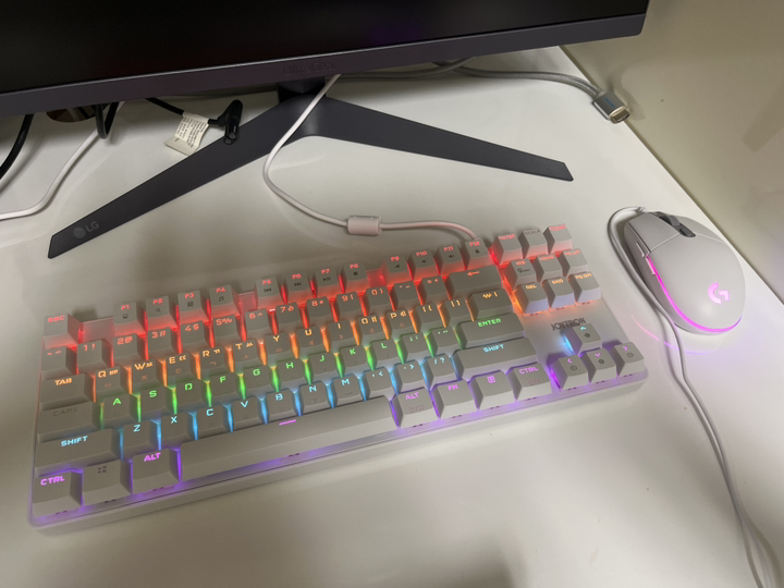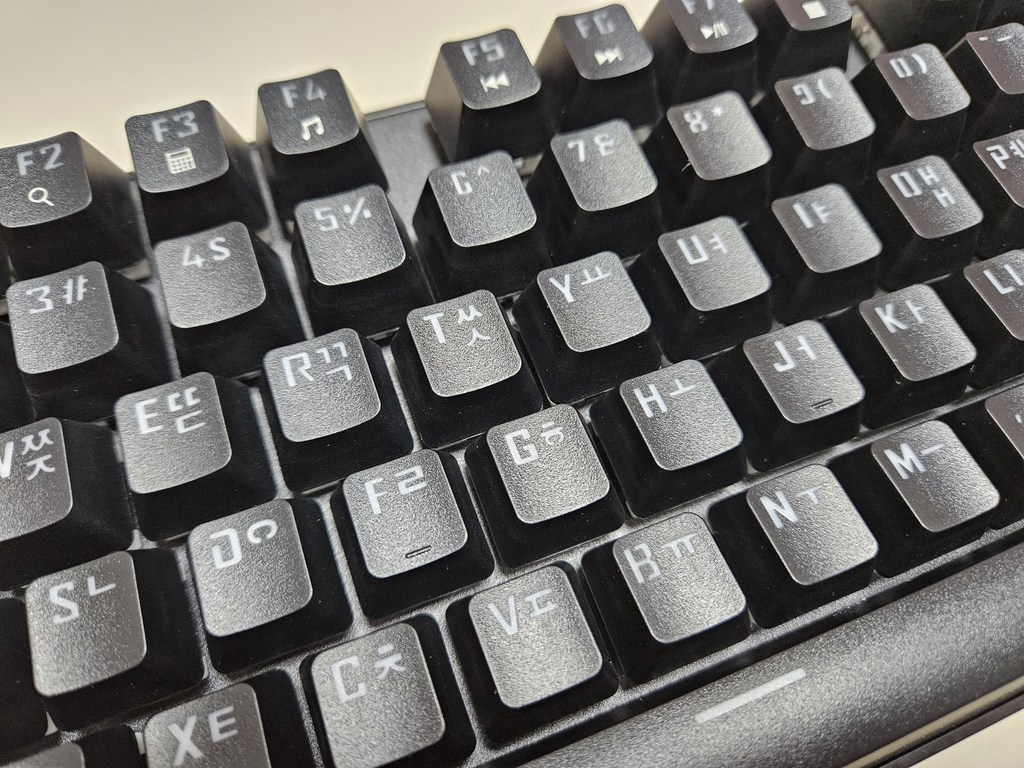 불필요한 장식 없이 심플한 디자인이라 전체적으로 정돈된 느낌을 주었고, 키 배열도 표준 배열이라 적응하는 데 시간이 거의 필요하지 않았어요. 키캡 각인이 선명해서 어두운 환경에서도 키 위치를 쉽게 확인할 수 있었고 전체적인 마감도 가격대를 생각하면 상당히 괜찮은 편이었습니다. 키보드 하우징이 가볍지만 저렴해 보이지는 않았고 책상 위에 올려두었을 때 안정감도 나쁘지 않았습니다.