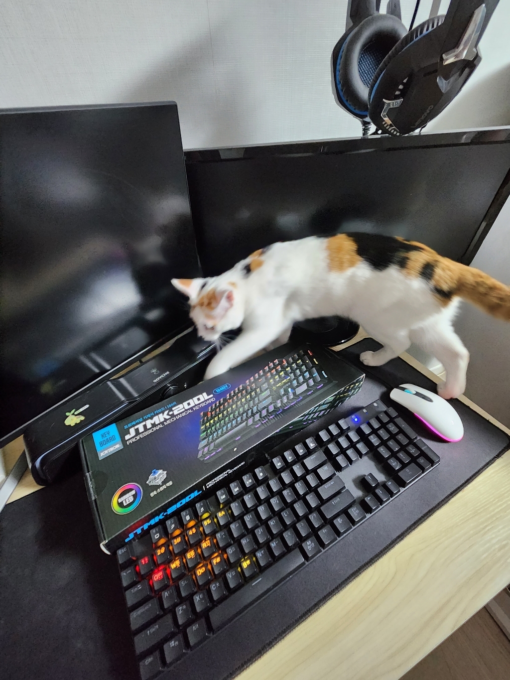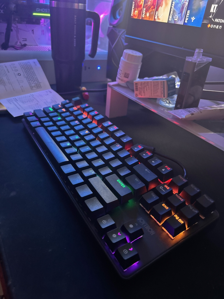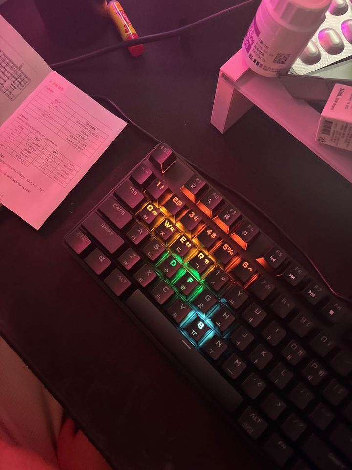 평소 멤브레인 키보드만 사용하다가 기계식 키보드 특유의 타건감이 궁금해 입문용 제품을 찾던 중 가격 대비 평이 괜찮은 이 제품을 알게 되어 선택하게 되었습니다. 블랙 컬러의 깔끔한 외형 덕분에 책상 위에 올려두었을 때 튀지 않고 게이밍 환경뿐만 아니라 일반 사무용 책상에도 무난하게 어울렸어요. 처음 개봉했을 때 전체적인 마감 상태도 준수해서 첫인상부터 꽤 만족스러웠습니다.