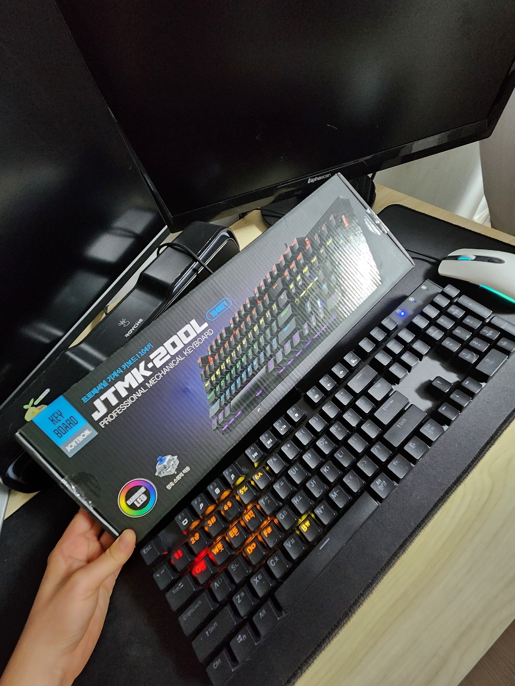 우선 사진으로 봐도 상세페이지를 봐도 디자인은 누가봐도 깔것없이 깔끔하고 고급지게 생겼어용 실물로 받아봤을때는 무게감도 좀 있는게 키보드에서 후광이 좀 비친다고 해야될까요?